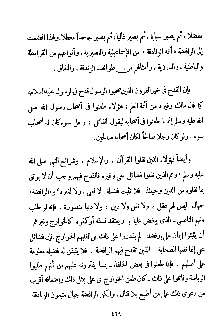 مُفَضِّلًا ثُمَّ يَصِيرُ سَبَّابًا ثُمَّ يَصِيرُ غَالِيًا ثُمَّ يَصِيرُ جَاحِدًا مُعَطِّلًا. وَلِهَذَا انْضَمَّتْ إلَى الرَّافِضَةِ " أَئِمَّةُ الزَّنَادِقَةِ " مِنْ الْإِسْمَاعِيلِيَّة وَالْنُصَيْرِيَّة وَأَنْوَاعِهِمْ مِنْ الْقَرَامِطَةِ وَالْبَاطِنِيَّةِ وَالدُّرْزِيَّةِ وَأَمْثَالِهِمْ مِنْ طَوَائِفِ الزَّنْدَقَةِ وَالنِّفَاقِ. فَإِنَّ الْقَدْحَ فِي خَيْرِ الْقُرُونِ الَّذِينَ صَحِبُوا الرَّسُولَ قَدْحٌ فِي الرَّسُولِ عَلَيْهِ السَّلَامُ كَمَا قَالَ مَالِكٌ وَغَيْرُهُ مِنْ أَئِمَّةِ الْعِلْمِ: هَؤُلَاءِ طَعَنُوا فِي أَصْحَابِ رَسُولِ اللَّهِ صَلَّى اللَّهُ عَلَيْهِ وَسَلَّمَ إنَّمَا طَعَنُوا فِي أَصْحَابِهِ لِيَقُولَ الْقَائِلُ: رَجُلُ سَوْءٍ كَانَ لَهُ أَصْحَابُ سَوْءٍ وَلَوْ كَانَ رَجُلًا صَالِحًا لَكَانَ أَصْحَابُهُ صَالِحِينَ. وَأَيْضًا فَهَؤُلَاءِ الَّذِينَ نَقَلُوا الْقُرْآنَ وَالْإِسْلَامَ وَشَرَائِعَ النَّبِيِّ صَلَّى اللَّهُ عَلَيْهِ وَسَلَّمَ وَهُمْ الَّذِينَ نَقَلُوا فَضَائِلَ عَلِيٍّ وَغَيْرِهِ فَالْقَدْحُ فِيهِمْ يُوجِبُ أَنْ لَا يُوثَقَ بِمَا نَقَلُوهُ مِنْ الدِّينِ وَحِينَئِذٍ فَلَا تَثْبُتُ فَضِيلَةٌ؛ لَا لِعَلِيِّ وَلَا لِغَيْرِهِ وَ " الرَّافِضَةُ " جُهَّالٌ لَيْسَ لَهُمْ عَقْلٌ وَلَا نَقْلٌ وَلَا دِينٌ وَلَا دُنْيَا مَنْصُورَةٌ. فَإِنَّهُ لَوْ طَلَبَ مِنْهُمْ الناصبي - الَّذِي يُبْغِضُ عَلِيًّا؛ وَيَعْتَقِدُ فِسْقَهُ أَوْ كُفْرَهُ كَالْخَوَارِجِ وَغَيْرِهِمْ أَنْ يُثْبِتُوا إيمَانَ عَلِيٍّ؛ وَفَضْلَهُ لَمْ يَقْدِرُوا عَلَى ذَلِكَ بَلْ تَغْلِبُهُمْ الْخَوَارِجُ. فَإِنَّ فَضَائِلَ عَلِيٍّ إنَّمَا نَقَلَهَا الصَّحَابَةُ الَّذِينَ تَقْدَحُ فِيهِمْ الرَّافِضَةُ. فَلَا يَتَيَقَّنُ لَهُ فَضِيلَةٌ مَعْلُومَةٌ عَلَى أَصْلِهِمْ. فَإِذَا طَعَنُوا فِي بَعْضِ الْخُلَفَاءِ - بِمَا يَفْتَرُونَهُ عَلَيْهِمْ مِنْ أَنَّهُمْ طَلَبُوا الرِّيَاسَةَ وَقَاتَلُوا عَلَى ذَلِكَ - كَانَ طَعْنُ الْخَوَارِجِ فِي عَلِيٍّ بِمِثْلِ ذَلِكَ وَأَضْعَافُهُ أَقْرَبُ مِنْ دَعْوَى ذَلِكَ عَلَى مَنْ أُطِيعَ بِلَا قِتَالٍ. وَلَكِنَّ الرَّافِضَةَ جُهَّالٌ مُتَّبِعُونَ الزَّنَادِقَةِ.