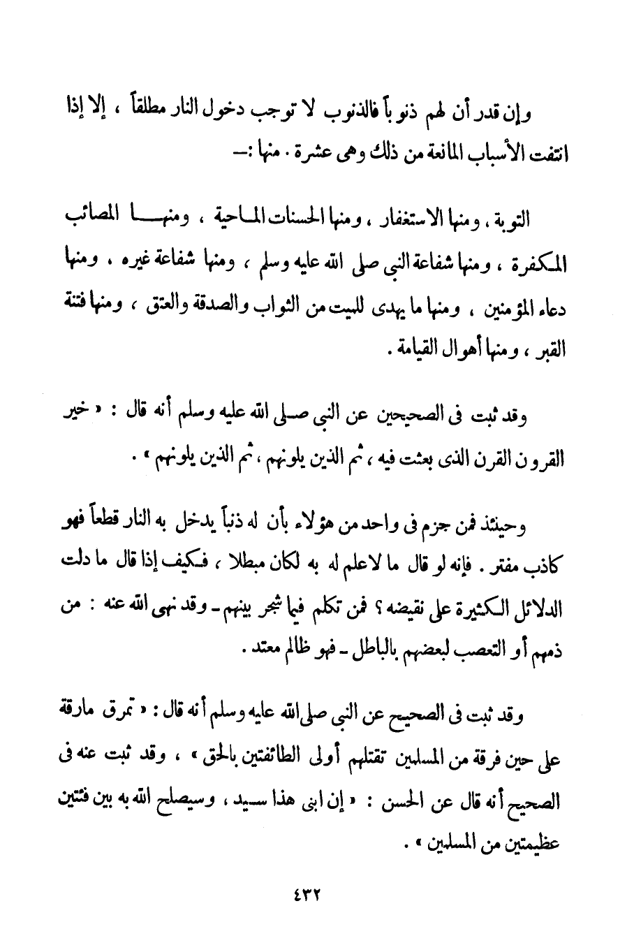 وَإِنْ قُدِّرَ أَنَّ لَهُمْ ذُنُوبًا فَالذُّنُوبُ لَا تُوجِبُ دُخُولَ النَّارِ مُطْلَقًا إلَّا إذَا انْتَفَتْ الْأَسْبَابُ الْمَانِعَةُ مِنْ ذَلِكَ وَهِيَ عَشْرَةٌ. مِنْهَا: - التَّوْبَةُ وَمِنْهَا الِاسْتِغْفَارُ وَمِنْهَا الْحَسَنَاتُ الْمَاحِيَةُ وَمِنْهَا الْمَصَائِبُ الْمُكَفِّرَةُ وَمِنْهَا شَفَاعَةُ النَّبِيِّ صَلَّى اللَّهُ عَلَيْهِ وَسَلَّمَ وَمِنْهَا شَفَاعَةُ غَيْرِهِ وَمِنْهَا دُعَاءُ الْمُؤْمِنِينَ وَمِنْهَا مَا يُهْدَى لِلْمَيِّتِ مِنْ الثَّوَابِ وَالصَّدَقَةِ وَالْعِتْقِ وَمِنْهَا فِتْنَةُ الْقَبْرِ وَمِنْهَا أَهْوَالُ الْقِيَامَةِ. وَقَدْ ثَبَتَ فِي الصَّحِيحَيْنِ عَنْ النَّبِيِّ صَلَّى اللَّهُ عَلَيْهِ وَسَلَّمَ أَنَّهُ قَالَ: " {خَيْرُ الْقُرُونِ الْقَرْنُ الَّذِي بُعِثْت فِيهِ ثُمَّ الَّذِينَ يَلُونَهُمْ ثُمَّ الَّذِينَ يَلُونَهُمْ} . وَحِينَئِذٍ فَمَنْ جَزَمَ فِي وَاحِدٍ مِنْ هَؤُلَاءِ بِأَنَّ لَهُ ذَنْبًا يَدْخُلُ بِهِ النَّارَ قَطْعًا فَهُوَ كَاذِبٌ مُفْتَرٍ. فَإِنَّهُ لَوْ قَالَ مَا لَا عِلْمَ لَهُ بِهِ لَكَانَ مُبْطِلًا فَكَيْفَ إذَا قَالَ مَا دَلَّتْ الدَّلَائِلُ الْكَثِيرَةُ عَلَى نَقِيضِهِ؟ فَمَنْ تَكَلَّمَ فِيمَا شَجَرَ بَيْنَهُمْ - وَقَدْ نَهَى اللَّهُ عَنْهُ: مِنْ ذَمِّهِمْ أَوْ التَّعَصُّبِ لِبَعْضِهِمْ بِالْبَاطِلِ - فَهُوَ ظَالِمٌ مُعْتَدٍ. وَقَدْ ثَبَتَ فِي الصَّحِيحِ عَنْ النَّبِيِّ صَلَّى اللَّهُ عَلَيْهِ وَسَلَّمَ أَنَّهُ قَالَ: " {تَمْرُقُ مَارِقَةٌ عَلَى حِينِ فِرْقَةٍ مِنْ الْمُسْلِمِينَ تَقْتُلُهُمْ أَوْلَى الطَّائِفَتَيْنِ بِالْحَقِّ} وَقَدْ ثَبَتَ عَنْهُ فِي الصَّحِيحِ أَنَّهُ قَالَ عَنْ الْحَسَنِ: " {إنَّ ابْنِي هَذَا سَيِّدٌ وَسَيُصْلِحُ اللَّهُ بِهِ بَيْنَ فِئَتَيْنِ عَظِيمَتَيْنِ مِنْ الْمُسْلِمِينَ} .