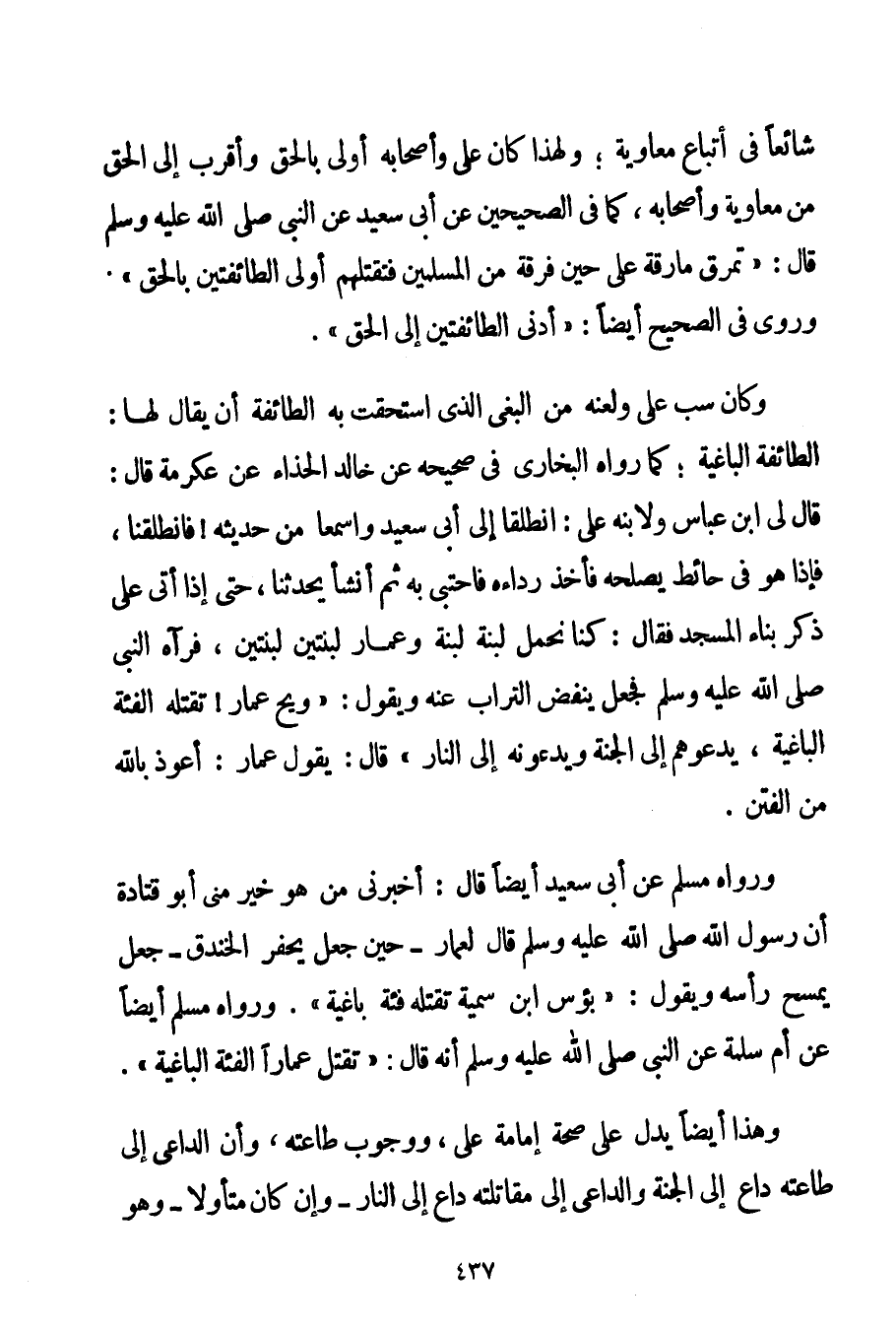 شَائِعًا فِي أَتْبَاعِ مُعَاوِيَةَ؛ وَلِهَذَا كَانَ عَلِيٌّ وَأَصْحَابُهُ أَوْلَى بِالْحَقِّ وَأَقْرَبَ إلَى الْحَقِّ مِنْ مُعَاوِيَةَ وَأَصْحَابِهِ كَمَا فِي الصَّحِيحَيْنِ عَنْ أَبِي سَعِيدٍ عَنْ النَّبِيِّ صَلَّى اللَّهُ عَلَيْهِ وَسَلَّمَ قَالَ: " {تَمْرُقُ مَارِقَةٌ عَلَى حِينِ فِرْقَةٍ مِنْ الْمُسْلِمِينَ فَتَقْتُلُهُمْ أَوْلَى الطَّائِفَتَيْنِ بِالْحَقِّ} . وَرُوِيَ فِي الصَّحِيحِ أَيْضًا: " {أَدْنَى الطَّائِفَتَيْنِ إلَى الْحَقِّ} . وَكَانَ سَبُّ عَلِيٍّ وَلَعْنُهُ مِنْ الْبَغْيِ الَّذِي اسْتَحَقَّتْ بِهِ الطَّائِفَةُ أَنْ يُقَالَ لَهَا: الطَّائِفَةُ الْبَاغِيَةُ؛ كَمَا رَوَاهُ الْبُخَارِيُّ فِي صَحِيحِهِ عَنْ خَالِدٍ الْحَذَّاءِ {عَنْ عِكْرِمَةَ قَالَ: قَالَ لِي ابْنُ عَبَّاسٍ وَلِابْنِهِ عَلِيٍّ: انْطَلِقَا إلَى أَبِي سَعِيدٍ وَاسْمَعَا مِنْ حَدِيثِهِ فَانْطَلَقْنَا فَإِذَا هُوَ فِي حَائِطٍ يُصْلِحُهُ فَأَخَذَ رِدَاءَهُ فَاحْتَبَى بِهِ ثُمَّ أَنْشَأَ يُحَدِّثُنَا حَتَّى إذَا أَتَى عَلِيٌّ ذَكَرَ بِنَاءَ الْمَسْجِدِ فَقَالَ: كُنَّا نَحْمِلُ لَبِنَةً لَبِنَةً وَعَمَّارٌ لَبِنَتَيْنِ لَبِنَتَيْنِ فَرَآهُ النَّبِيُّ صَلَّى اللَّهُ عَلَيْهِ وَسَلَّمَ فَجَعَلَ يَنْفُضُ التُّرَابَ عَنْهُ وَيَقُولُ: وَيْحَ عَمَّارُ تَقْتُلُهُ الْفِئَةُ الْبَاغِيَةُ يَدْعُوهُمْ إلَى الْجَنَّةِ وَيَدْعُونَهُ إلَى النَّارِ قَالَ: يَقُولُ عَمَّارٌ: أَعُوذُ بِاَللَّهِ مِنْ الْفِتَنِ} . وَرَوَاهُ مُسْلِمٌ عَنْ أَبِي سَعِيدٍ أَيْضًا قَالَ: أَخْبَرَنِي مَنْ هُوَ خَيْرٌ مِنِّي أَبُو قتادة {أَنَّ رَسُولَ اللَّهِ صَلَّى اللَّهُ عَلَيْهِ وَسَلَّمَ قَالَ لِعَمَّارِ - حِينَ جَعَلَ يَحْفِرُ الْخَنْدَقَ - جَعَلَ يَمْسَحُ رَأْسَهُ وَيَقُولُ: بُؤْسَ ابْنِ سُمَيَّةَ تَقْتُلُهُ فِئَةٌ بَاغِيَةٌ} . وَرَوَاهُ مُسْلِمٌ أَيْضًا عَنْ أَمْ سَلَمَةَ عَنْ النَّبِيِّ صَلَّى اللَّهُ عَلَيْهِ وَسَلَّمَ أَنَّهُ قَالَ: " {تَقْتُلُ عَمَّارًا الْفِئَةُ الْبَاغِيَةُ} . وَهَذَا أَيْضًا يَدُلُّ عَلَى صِحَّةِ إمَامَةِ عَلِيٍّ وَوُجُوبِ طَاعَتِهِ وَأَنَّ الدَّاعِيَ إلَى طَاعَتِهِ دَاعٍ إلَى الْجَنَّةِ وَالدَّاعِي إلَى مُقَاتَلَتِهِ دَاعٍ إلَى النَّارِ - وَإِنْ كَانَ مُتَأَوِّلًا - وَهُوَ