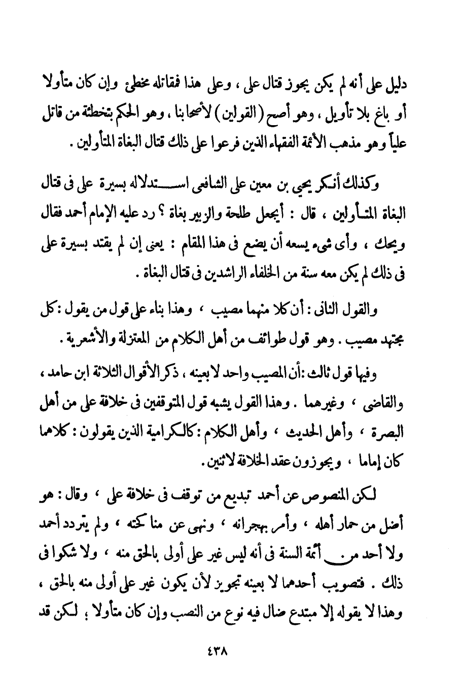 دَلِيلٌ عَلَى أَنَّهُ لَمْ يَكُنْ يَجُوزُ قِتَالُ عَلِيٍّ وَعَلَى هَذَا فَمُقَاتِلُهُ مُخْطِئٌ وَإِنْ كَانَ مُتَأَوِّلًا أَوْ بَاغٍ بِلَا تَأْوِيلٍ وَهُوَ أَصَحُّ (الْقَوْلَيْنِ لِأَصْحَابِنَا وَهُوَ الْحُكْمُ بِتَخْطِئَةِ مَنْ قَاتَلَ عَلِيًّا وَهُوَ مَذْهَبُ الْأَئِمَّةِ الْفُقَهَاءِ الَّذِينَ فَرَّعُوا عَلَى ذَلِكَ قِتَالَ الْبُغَاةِ الْمُتَأَوِّلِينَ. وَكَذَلِكَ أَنْكَرَ يَحْيَى بْنُ مَعِينٍ عَلَى الشَّافِعِيِّ اسْتِدْلَالَهُ بِسِيرَةِ عَلِيٍّ فِي قِتَالِ الْبُغَاةِ الْمُتَأَوِّلِينَ قَالَ: أَيُجْعَلُ طَلْحَةُ وَالزُّبَيْرُ بُغَاةً؟ رَدَّ عَلَيْهِ الْإِمَامُ أَحْمَد فَقَالَ وَيْحَك وَأَيُّ شَيْءٍ يَسَعُهُ أَنْ يَضَعَ فِي هَذَا الْمَقَامِ: يَعْنِي إنْ لَمْ يَقْتَدِ بِسِيرَةِ عَلِيٍّ فِي ذَلِكَ لَمْ يَكُنْ مَعَهُ سُنَّةٌ مِنْ الْخُلَفَاءِ الرَّاشِدِينَ فِي قِتَالِ الْبُغَاةِ. وَالْقَوْلُ الثَّانِي: أَنَّ كُلًّا مِنْهُمَا مُصِيبٌ وَهَذَا بِنَاءً عَلَى قَوْلِ مَنْ يَقُولُ: كُلُّ مُجْتَهِدٍ مُصِيبٌ. وَهُوَ قَوْلُ طَوَائِفَ مِنْ أَهْلِ الْكَلَامِ مِنْ الْمُعْتَزِلَةِ وَالْأَشْعَرِيَّةِ. وَفِيهَا قَوْلٌ ثَالِثٌ: أَنَّ الْمُصِيبَ وَاحِدٌ لَا بِعَيْنِهِ ذَكَرَ الْأَقْوَالَ الثَّلَاثَةَ ابْنُ حَامِدٍ وَالْقَاضِي وَغَيْرُهُمَا. وَهَذَا الْقَوْلُ يُشْبِهُ قَوْلَ الْمُتَوَقِّفِينَ فِي خِلَافَةِ عَلِيٍّ مِنْ أَهْلِ الْبَصْرَةِ وَأَهْلِ الْحَدِيثِ وَأَهْلِ الْكَلَامِ: كالكَرَّامِيَة الَّذِينَ يَقُولُونَ: كِلَاهُمَا كَانَ إمَامًا وَيُجَوِّزُونَ عَقْدَ الْخِلَافَةِ لِاثْنَيْنِ. لَكِنَّ الْمَنْصُوصَ عَنْ أَحْمَد تَبْدِيعُ مَنْ تَوَقَّفَ فِي خِلَافَةِ عَلِيٍّ وَقَالَ: هُوَ أَضَلُّ مِنْ حِمَارِ أَهْلِهِ وَأَمَرَ بِهِجْرَانِهِ وَنَهَى عَنْ مُنَاكَحَتِهِ وَلَمْ يَتَرَدَّدْ أَحْمَد وَلَا أَحَدٌ مِنْ أَئِمَّةِ السُّنَّةِ فِي أَنَّهُ لَيْسَ غَيْرُ عَلِيٍّ أَوْلَى بِالْحَقِّ مِنْهُ وَلَا شَكُّوا فِي ذَلِكَ. فَتَصْوِيبُ أَحَدِهِمَا لَا بِعَيْنِهِ تَجْوِيزٌ لِأَنْ يَكُونَ غَيْرُ عَلِيٍّ أَوْلَى مِنْهُ بِالْحَقِّ وَهَذَا لَا يَقُولُهُ إلَّا مُبْتَدِعٌ ضَالٌّ فِيهِ نَوْعٌ مِنْ النَّصْبِ وَإِنْ كَانَ مُتَأَوِّلًا؛ لَكِنْ قَدْ
