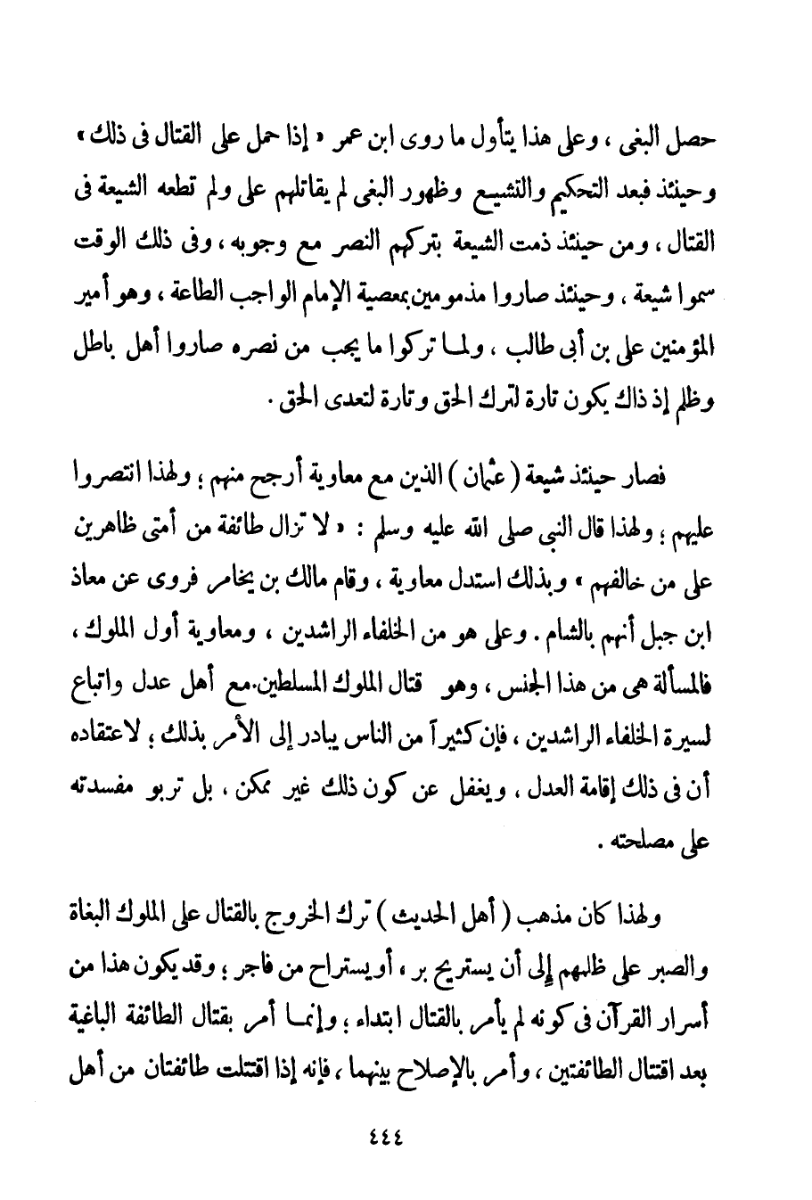 حَصَلَ الْبَغْيُ وَعَلَى هَذَا يَتَأَوَّلُ مَا رَوَى ابْنُ عُمَرَ " {إذَا حَمَلَ عَلَى الْقِتَالِ فِي ذَلِكَ} وَحِينَئِذٍ فَبَعْدَ التَّحْكِيمِ وَالتَّشَيُّعِ وَظُهُورِ الْبَغْيِ لَمْ يُقَاتِلْهُمْ عَلِيٌّ وَلَمْ تُطِعْهُ الشِّيعَةُ فِي الْقِتَالِ وَمِنْ حِينَئِذٍ ذَمَّتْ الشِّيعَةُ بِتَرْكِهِمْ النَّصْرَ مَعَ وُجُوبِهِ وَفِي ذَلِكَ الْوَقْتِ سُمُّوا شِيعَةً وَحِينَئِذٍ صَارُوا مَذْمُومِينَ بِمَعْصِيَةِ الْإِمَامِ الْوَاجِبِ الطَّاعَةِ وَهُوَ أَمِيرُ الْمُؤْمِنِينَ عَلِيُّ بْنُ أَبِي طَالِبٍ وَلَمَّا تَرَكُوا مَا يَجِبُ مِنْ نَصْرِهِ صَارُوا أَهْلَ بَاطِلٍ وَظُلْمٍ إذْ ذَاكَ يَكُونُ تَارَةً لِتَرْكِ الْحَقِّ وَتَارَةً لِتَعَدِّي الْحَقِّ. فَصَارَ حِينَئِذٍ شِيعَةَ عُثْمَانَ الَّذِينَ مَعَ مُعَاوِيَةَ أَرْجَحُ مِنْهُمْ؛ وَلِهَذَا انْتَصَرُوا عَلَيْهِمْ؛ وَلِهَذَا قَالَ النَّبِيُّ صَلَّى اللَّهُ عَلَيْهِ وَسَلَّمَ " {لَا تَزَالُ طَائِفَةٌ مِنْ أُمَّتِي ظَاهِرِينَ عَلَى مَنْ خَالَفَهُمْ} وَبِذَلِكَ اسْتَدَلَّ مُعَاوِيَةُ وَقَامَ مَالِك بْنُ يخامر فَرُوِيَ عَنْ مُعَاذِ بْنِ جَبَلٍ أَنَّهُمْ بِالشَّامِ. وَعَلِيٌّ هُوَ مِنْ الْخُلَفَاءِ الرَّاشِدِينَ وَمُعَاوِيَةُ أَوَّلُ الْمُلُوكِ فَالْمَسْأَلَةُ هِيَ مِنْ هَذَا الْجِنْسِ وَهُوَ قِتَالُ الْمُلُوكِ الْمُسَلَّطِينَ مَعَ أَهْلِ عَدْلٍ وَاتِّبَاعٍ لِسِيرَةِ الْخُلَفَاءِ الرَّاشِدِينَ فَإِنَّ كَثِيرًا مِنْ النَّاسِ يُبَادِرُ إلَى الْأَمْرِ بِذَلِكَ؛ لِاعْتِقَادِهِ أَنَّ فِي ذَلِكَ إقَامَةَ الْعَدْلِ وَيَغْفُلُ عَنْ كَوْن ذَلِكَ غَيْرَ مُمْكِنٍ بَلْ تَرْبُو مَفْسَدَتُهُ عَلَى مَصْلَحَتِهِ. وَلِهَذَا كَانَ مَذْهَبُ (أَهْلِ الْحَدِيثِ تَرْكَ الْخُرُوجِ بِالْقِتَالِ عَلَى الْمُلُوكِ الْبُغَاةِ وَالصَّبْرِ عَلَى ظُلْمِهِمْ إلَى أَنْ يَسْتَرِيحَ بَرٌّ أَوْ يُسْتَرَاحُ مِنْ فَاجِرٍ؛ وَقَدْ يَكُونُ هَذَا مِنْ أَسْرَارِ الْقُرْآنِ فِي كَوْنِهِ لَمْ يَأْمُرْ بِالْقِتَالِ ابْتِدَاءً؛ وَإِنَّمَا أَمَرَ بِقِتَالِ الطَّائِفَة الْبَاغِيَةِ بَعْدَ اقْتِتَالِ الطَّائِفَتَيْنِ وَأَمَرَ بِالْإِصْلَاحِ بَيْنَهُمَا فَإِنَّهُ إذَا اقْتَتَلَتْ طَائِفَتَانِ مِنْ أَهْلِ