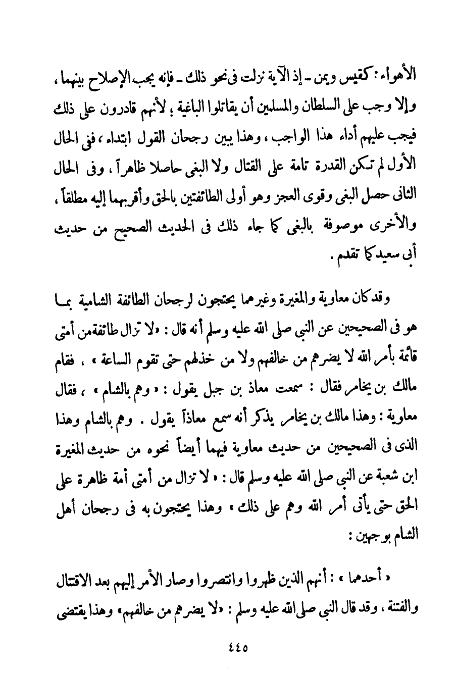 الْأَهْوَاءِ: كَقَيْسِ ويمن - إذْ الْآيَةُ نَزَلَتْ فِي نَحْوِ ذَلِكَ - فَإِنَّهُ يَجِبُ الْإِصْلَاحُ بَيْنَهُمَا وَإِلَّا وَجَبَ عَلَى السُّلْطَانِ وَالْمُسْلِمِينَ أَنْ يُقَاتِلُوا الْبَاغِيَةَ؛ لِأَنَّهُمْ قَادِرُونَ عَلَى ذَلِكَ فَيَجِبُ عَلَيْهِمْ أَدَاءُ هَذَا الْوَاجِبِ وَهَذَا يُبَيِّنُ رُجْحَانَ الْقَوْلِ ابْتِدَاءً فَفِي الْحَالِ الْأَوَّلِ لَمْ تَكُنْ الْقُدْرَةُ تَامَّةً عَلَى الْقِتَالِ وَلَا الْبَغْيِ حَاصِلًا ظَاهِرًا وَفِي الْحَالِ الثَّانِي حَصَلَ الْبَغْيُ وَقَوِيَ الْعَجْزُ وَهُوَ أَوْلَى الطَّائِفَتَيْنِ بِالْحَقِّ وَأَقْرَبُهُمَا إلَيْهِ مُطْلَقًا وَالْأُخْرَى مَوْصُوفَةٌ بِالْبَغْيِ كَمَا جَاءَ ذَلِكَ فِي الْحَدِيثِ الصَّحِيحِ مِنْ حَدِيثِ أَبِي سَعِيدٍ كَمَا تَقَدَّمَ. وَقَدْ كَانَ مُعَاوِيَةُ وَالْمُغِيرَةُ وَغَيْرُهُمَا يَحْتَجُّونَ لِرُجْحَانِ الطَّائِفَةِ الشَّامِيَّةِ بِمَا هُوَ فِي الصَّحِيحَيْنِ عَنْ النَّبِيِّ صَلَّى اللَّهُ عَلَيْهِ وَسَلَّمَ أَنَّهُ قَالَ: " {لَا تَزَالُ طَائِفَةٌ مِنْ أُمَّتِي قَائِمَةً بِأَمْرِ اللَّه لَا يَضُرُّهُمْ مَنْ خَالَفَهُمْ وَلَا مَنْ خَذَلَهُمْ حَتَّى تَقُومَ السَّاعَةُ} فَقَامَ مَالِك بْنُ يخامر فَقَالَ: سَمِعْت مُعَاذَ بْنَ جَبَلٍ يَقُولُ: " {وَهُمْ بِالشَّامِ} فَقَالَ مُعَاوِيَةُ: وَهَذَا مَالِكُ بْنُ يخامر يَذْكُرُ أَنَّهُ سَمِعَ مُعَاذًا يَقُولُ. وَهُمْ بِالشَّامِ وَهَذَا الَّذِي فِي الصَّحِيحَيْنِ مِنْ حَدِيثِ مُعَاوِيَةَ فِيهِمَا أَيْضًا نَحْوُهُ مِنْ حَدِيثِ الْمُغِيرَةِ بْنِ شُعْبَةَ عَنْ النَّبِيِّ صَلَّى اللَّهُ عَلَيْهِ وَسَلَّمَ قَالَ: " {لَا تَزَالُ مِنْ أُمَّتِي أُمَّةٌ ظَاهِرَةٌ عَلَى الْحَقِّ حَتَّى يَأْتِيَ أَمْرُ اللَّهِ وَهُمْ عَلَى ذَلِكَ} وَهَذَا يَحْتَجُّونَ بِهِ فِي رُجْحَانِ أَهْلِ الشَّامِ بِوَجْهَيْنِ: " أَحَدُهُمَا ": أَنَّهُمْ الَّذِينَ ظَهَرُوا وَانْتَصَرُوا وَصَارَ الْأَمْرُ إلَيْهِمْ بَعْدَ الِاقْتِتَالِ وَالْفِتْنَةِ وَقَدْ قَالَ النَّبِيُّ صَلَّى اللَّهُ عَلَيْهِ وَسَلَّمَ " {لَا يَضُرُّهُمْ مَنْ خَالَفَهُمْ} وَهَذَا يَقْتَضِي