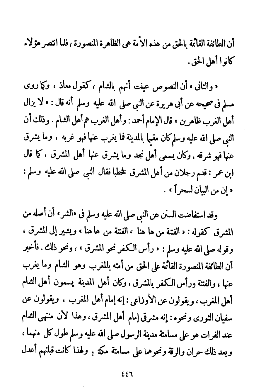 أَنَّ الطَّائِفَةَ الْقَائِمَةَ بِالْحَقِّ مِنْ هَذِهِ الْأُمَّةِ هِيَ الظَّاهِرَةُ الْمَنْصُورَةُ فَلَمَّا انْتَصَرَ هَؤُلَاءِ كَانُوا أَهْلَ الْحَقِّ. " وَالثَّانِي " أَنَّ النُّصُوصَ عَيَّنَتْ أَنَّهُمْ بِالشَّامِ كَقَوْلِ مُعَاذٍ وَكَمَا رَوَى مُسْلِمٌ فِي صَحِيحِهِ عَنْ أَبِي هُرَيْرَةَ عَنْ النَّبِيِّ صَلَّى اللَّهُ عَلَيْهِ وَسَلَّمَ أَنَّهُ قَالَ: " {لَا يَزَالُ أَهْلُ الْغَرْبِ ظَاهِرِينَ} قَالَ الْإِمَامُ أَحْمَد: وَأَهْلُ الْغَرْبِ هُمْ أَهْلُ الشَّامِ. وَذَلِكَ أَنَّ النَّبِيَّ صَلَّى اللَّهُ عَلَيْهِ وَسَلَّمَ كَانَ مُقِيمًا بِالْمَدِينَةِ فَمَا يَغْرُبُ عَنْهَا فَهُوَ غَرْبُهُ وَمَا يَشْرَقُ عَنْهَا فَهُوَ شَرْقُهُ وَكَانَ يُسَمِّي أَهْلَ نَجْدٍ وَمَا يُشْرِقُ عَنْهَا أَهْلَ الْمَشْرِقِ كَمَا قَالَ ابْنُ عُمَر: قَدِمَ رَجُلَانِ مِنْ أَهْلِ الْمَشْرِقِ فَخَطَبَا فَقَالَ النَّبِيُّ صَلَّى اللَّهُ عَلَيْهِ وَسَلَّمَ " {إنَّ مِنْ الْبَيَانِ لَسِحْرًا} . وَقَدْ اسْتَفَاضَتْ السُّنَنُ عَنْ النَّبِيِّ صَلَّى اللَّهُ عَلَيْهِ وَسَلَّمَ فِي " الشَّرِّ " أَنَّ أَصْلَهُ مِنْ الْمَشْرِقِ: كَقَوْلِهِ: " {الْفِتْنَةُ مِنْ هَاهُنَا الْفِتْنَةُ مِنْ هَاهُنَا} وَيُشِيرُ إلَى الْمَشْرِقِ وَقَوْلُهُ صَلَّى اللَّهُ عَلَيْهِ وَسَلَّمَ " {رَأْسُ الْكُفْرِ نَحْوُ الْمَشْرِقِ} وَنَحْوُ ذَلِكَ. فَأَخْبَرَ أَنَّ الطَّائِفَةَ الْمَنْصُورَةَ الْقَائِمَةَ عَلَى الْحَقِّ مِنْ أُمَّتِهِ بِالْمَغْرِبِ وَهُوَ الشَّامُ وَمَا يَغْرُبُ عَنْهَا وَالْفِتْنَةُ وَرَأْسُ الْكُفْرِ بِالْمَشْرِقِ وَكَانَ أَهْلُ الْمَدِينَةِ يُسَمَّوْنَ أَهْلَ الشَّامِ أَهْلَ الْمَغْرِبِ وَيَقُولُونَ عَنْ الأوزاعي: أَنَّهُ إمَامُ أَهْلِ الْمَغْرِبِ وَيَقُولُونَ عَنْ سُفْيَانَ الثَّوْرِيِّ وَنَحْوِهِ: إنَّهُ مَشْرِقِيٌّ إمَامُ أَهْلِ الْمَشْرِقِ وَهَذَا لِأَنَّ مُنْتَهَى الشَّامِ عِنْدَ الْفُرَاتِ هُوَ عَلَى مُسَامَتَةِ مَدِينَةِ الرَّسُولِ صَلَّى اللَّهُ عَلَيْهِ وَسَلَّمَ طُولَ كُلٍّ مِنْهُمَا وَبَعْدَ ذَلِكَ حَرَّانَ وَالرِّقَّةُ وَنَحْوُهُمَا عَلَى مُسَامَتَةِ مَكَّةَ؛ وَلِهَذَا كَانَتْ قِبْلَتُهُمْ أَعْدَلَ