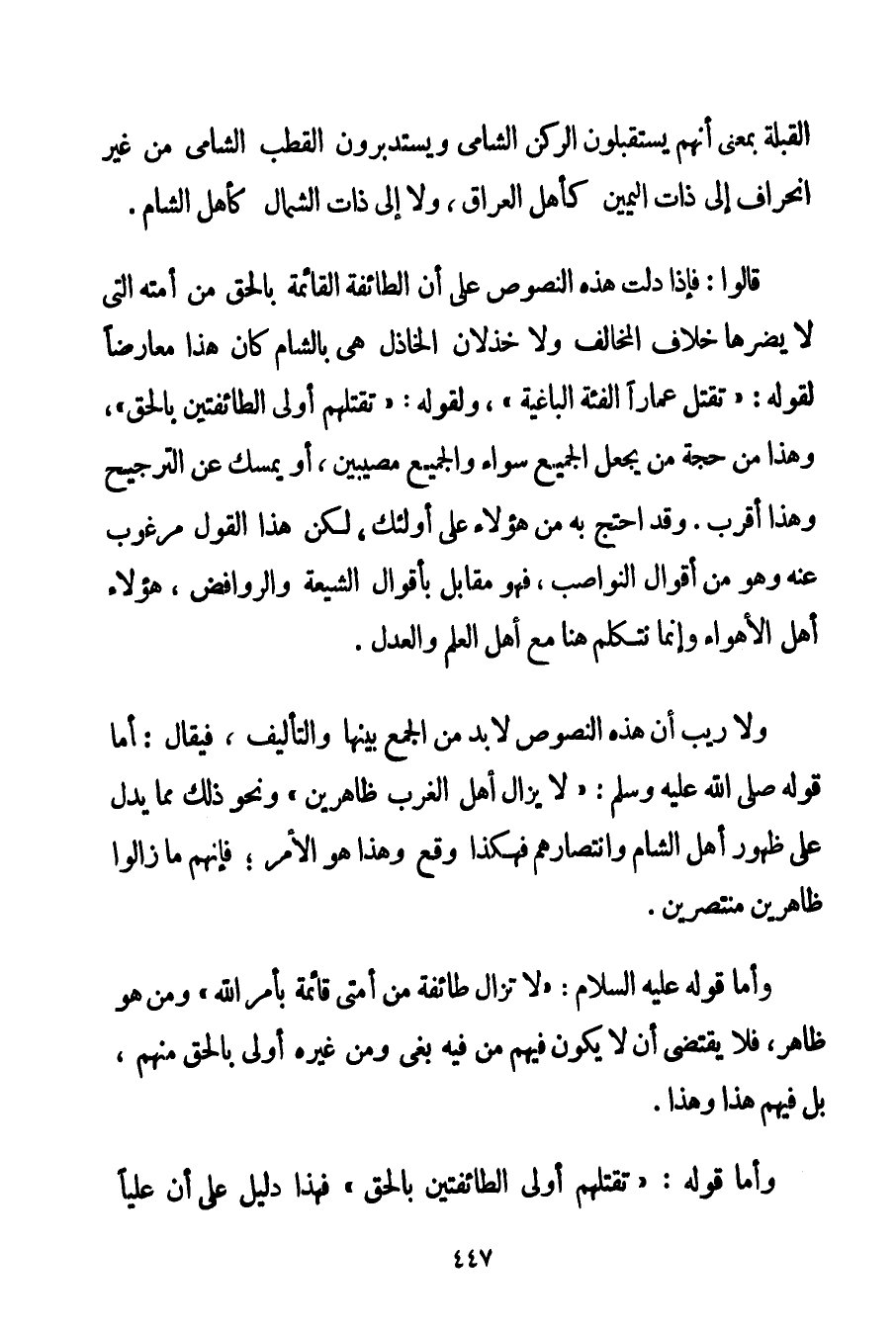 الْقِبْلَةِ بِمَعْنَى أَنَّهُمْ يَسْتَقْبِلُونَ الرُّكْنَ الشَّامِيَّ وَيَسْتَدْبِرُونَ الْقُطْبَ الشَّامِيَّ مِنْ غَيْرِ انْحِرَافٍ إلَى ذَاتِ الْيَمِينِ كَأَهْلِ الْعِرَاقِ وَلَا إلَى ذَاتِ الشِّمَالِ: كَأَهْلِ الشَّامِ. قَالُوا: فَإِذَا دَلَّتْ هَذِهِ النُّصُوصُ عَلَى أَنَّ الطَّائِفَةَ الْقَائِمَةَ بِالْحَقِّ مِنْ أُمَّتِهِ الَّتِي لَا يَضُرُّهَا خِلَافُ الْمُخَالِفِ وَلَا خِذْلَانُ الْخَاذِلِ هِيَ بِالشَّامِ كَانَ هَذَا مُعَارِضًا لِقَوْلِهِ: " {تَقْتُلُ عَمَّارًا الْفِئَةُ الْبَاغِيَةُ} وَلِقَوْلِهِ: " {تَقْتُلُهُمْ أَوْلَى الطَّائِفَتَيْنِ بِالْحَقِّ} وَهَذَا مِنْ حُجَّةِ مَنْ يَجْعَلُ الْجَمِيعَ سَوَاءً وَالْجَمِيعَ مُصِيبِينَ أَوْ يُمْسِكُ عَنْ التَّرْجِيحِ وَهَذَا أَقْرَبُ. وَقَدْ احْتَجَّ بِهِ مِنْ هَؤُلَاءِ عَلَى أُولَئِكَ لَكِنَّ هَذَا الْقَوْلَ مَرْغُوبٌ عَنْهُ وَهُوَ مِنْ أَقْوَالِ النَّوَاصِبِ فَهُوَ مُقَابَلٌ بِأَقْوَالِ الشِّيعَةِ وَالرَّوَافِضِ هَؤُلَاءِ أَهْلِ الْأَهْوَاءِ وَإِنَّمَا نَتَكَلَّمُ هُنَا مَعَ أَهْلِ الْعِلْمِ وَالْعَدْلِ. وَلَا رَيْبَ أَنَّ هَذِهِ النُّصُوصَ لَا بُدَّ مِنْ الْجَمْعِ بَيْنَهَا وَالتَّأْلِيفِ فَيُقَالُ: أَمَّا قَوْلُهُ صَلَّى اللَّهُ عَلَيْهِ وَسَلَّمَ " {لَا يَزَالُ أَهْلُ الْغَرْبِ ظَاهِرِينَ} وَنَحْوُ ذَلِكَ مِمَّا يَدُلُّ عَلَى ظُهُورِ أَهْلِ الشَّامِ وَانْتِصَارِهِمْ فَهَكَذَا وَقَعَ وَهَذَا هُوَ الْأَمْرُ؛ فَإِنَّهُمْ مَا زَالُوا ظَاهِرِينَ مُنْتَصِرِينَ. وَأَمَّا قَوْلُهُ عَلَيْهِ السَّلَامُ " {لَا تَزَالُ طَائِفَةٌ مِنْ أُمَّتِي قَائِمَةً بِأَمْرِ اللَّهِ} وَمَنْ هُوَ ظَاهِرٌ فَلَا يَقْتَضِي أَنْ لَا يَكُونَ فِيهِمْ مَنْ فِيهِ بَغْيٌ وَمَنْ غَيْرُهُ أَوْلَى بِالْحَقِّ مِنْهُمْ بَلْ فِيهِمْ هَذَا وَهَذَا. وَأَمَّا قَوْلُهُ: " {تَقْتُلُهُمْ أَوْلَى الطَّائِفَتَيْنِ بِالْحَقِّ} فَهَذَا دَلِيلٌ عَلَى أَنَّ عَلِيًّا