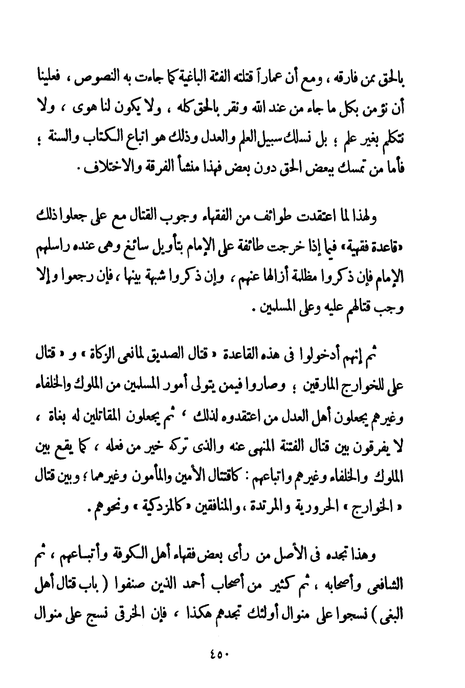 بِالْحَقِّ مِمَّنْ فَارَقَهُ وَمَعَ أَنَّ عَمَّارًا قَتَلَتْهُ الْفِئَةُ الْبَاغِيَةُ كَمَا جَاءَتْ بِهِ النُّصُوصُ فَعَلَيْنَا أَنْ نُؤْمِنَ بِكُلِّ مَا جَاءَ مِنْ عِنْدِ اللَّهِ وَنُقِرُّ بِالْحَقِّ كُلِّهِ وَلَا يَكُونُ لَنَا هَوًى وَلَا نَتَكَلَّمُ بِغَيْرِ عِلْمٍ؛ بَلْ نَسْلُكُ سُبُلَ الْعِلْمِ وَالْعَدْلِ وَذَلِكَ هُوَ اتِّبَاعُ الْكِتَابِ وَالسُّنَّةِ؛ فَأَمَّا مَنْ تَمَسَّكَ بِبَعْضِ الْحَقِّ دُونَ بَعْضٍ فَهَذَا مَنْشَأُ الْفُرْقَةِ وَالِاخْتِلَافِ. وَلِهَذَا لَمَّا اعْتَقَدَتْ طَوَائِفُ مِنْ الْفُقَهَاءِ وُجُوبَ الْقِتَالِ مَعَ عَلِيٍّ جَعَلُوا ذَلِكَ " قَاعِدَةً فِقْهِيَّةً " فِيمَا إذَا خَرَجَتْ طَائِفَةٌ عَلَى الْإِمَامِ بِتَأْوِيلِ سَائِغٍ وَهِيَ عِنْدُهُ رَاسَلَهُمْ الْإِمَامُ فَإِنْ ذَكَرُوا مَظْلِمَةً أَزَالَهَا عَنْهُمْ وَإِنْ ذَكَرُوا شُبْهَةً بَيَّنَهَا فَإِنْ رَجَعُوا وَإِلَّا وَجَبَ قِتَالُهُمْ عَلَيْهِ وَعَلَى الْمُسْلِمِينَ. ثُمَّ إنَّهُمْ أَدْخَلُوا فِي هَذِهِ الْقَاعِدَةِ " قِتَالَ الصِّدِّيقِ لِمَانِعِي الزَّكَاةِ " وَ " قِتَالَ عَلِيٍّ لِلْخَوَارِجِ الْمَارِقِينَ "؛ وَصَارُوا فِيمَنْ يَتَوَلَّى أُمُورَ الْمُسْلِمِينَ مِنْ الْمُلُوكِ وَالْخُلَفَاءِ وَغَيْرِهِمْ يَجْعَلُونَ أَهْلَ الْعَدْلِ مَنْ اعْتَقَدُوهُ لِذَلِكَ ثُمَّ يَجْعَلُونَ الْمُقَاتِلِينَ لَهُ بُغَاةً لَا يُفَرِّقُونَ بَيْنَ قِتَالِ الْفِتْنَةِ الْمَنْهِيِّ عَنْهُ وَاَلَّذِي تَرْكُهُ خَيْرٌ مِنْ فِعْلِهِ كَمَا يَقَعُ بَيْنَ الْمُلُوكِ وَالْخُلَفَاءِ وَغَيْرِهِمْ وَأَتْبَاعِهِمْ: كَاقْتِتَالِ الْأَمِينِ وَالْمَأْمُونِ وَغَيْرِهِمَا؛ وَبَيْنَ قِتَالِ " الْخَوَارِجِ " الحرورية وَالْمُرْتَدَّةِ وَالْمُنَافِقِينَ " كالمزدكية " وَنَحْوِهِمْ. وَهَذَا تَجِدُهُ فِي الْأَصْلِ مِنْ رَأْيِ بَعْضِ فُقَهَاءِ أَهْلِ الْكُوفَةِ وَأَتْبَاعِهِمْ ثُمَّ الشَّافِعِيِّ وَأَصْحَابِهِ ثُمَّ كَثِيرٍ مِنْ أَصْحَابِ أَحْمَد الَّذِينَ صَنَّفُوا بَابَ قِتَالِ أَهْلِ الْبَغْيِ نَسَجُوا عَلَى مِنْوَالِ أُولَئِكَ تَجِدُهُمْ هَكَذَا فَإِنَّ الخرقي نَسَجَ عَلَى مِنْوَالِ