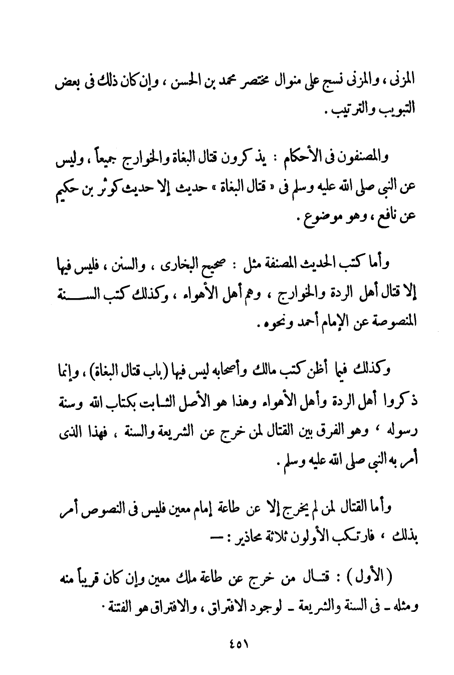 الْمُزَني، والمزني نَسَجَ عَلَى مِنْوَالِ مُخْتَصَرِ مُحَمَّدِ بْنِ الْحَسَنِ وَإِنْ كَانَ ذَلِكَ فِي بَعْضِ التَّبْوِيبِ وَالتَّرْتِيبِ. وَالْمُصَنِّفُونَ فِي الْأَحْكَامِ: يَذْكُرُونَ قِتَالَ الْبُغَاةِ وَالْخَوَارِجِ جَمِيعًا وَلَيْسَ عَنْ النَّبِيِّ صَلَّى اللَّهُ عَلَيْهِ وَسَلَّمَ فِي " قِتَالِ الْبُغَاةِ " حَدِيثٌ إلَّا حَدِيثَ كَوْثَرِ بْنِ حَكِيمٍ عَنْ نَافِعٍ وَهُوَ مَوْضُوعٌ. وَأَمَّا كُتُبُ الْحَدِيثِ الْمُصَنَّفَةُ مِثْلُ: صَحِيحِ الْبُخَارِيِّ وَالسُّنَنِ فَلَيْسَ فِيهَا إلَّا قِتَالُ أَهْلِ الرِّدَّةِ وَالْخَوَارِجِ وَهُمْ أَهْلُ الْأَهْوَاءِ وَكَذَلِكَ كُتُبُ السُّنَّةِ الْمَنْصُوصَةُ عَنْ الْإِمَامِ أَحْمَد وَنَحْوِهِ. وَكَذَلِكَ - فِيمَا أَظُنُّ - كُتُبُ مَالِكٍ وَأَصْحَابِهِ لَيْسَ فِيهَا بَابُ قِتَالِ الْبُغَاةِ وَإِنَّمَا ذَكَرُوا أَهْلَ الرِّدَّةِ وَأَهْلَ الْأَهْوَاءِ وَهَذَا هُوَ الْأَصْلُ الثَّابِتُ بِكِتَابِ اللَّهِ وَسُنَّةِ رَسُولِهِ وَهُوَ الْفَرْقُ بَيْنَ الْقِتَالِ لِمَنْ خَرَجَ عَنْ الشَّرِيعَةِ وَالسُّنَّةِ فَهَذَا الَّذِي أَمَرَ بِهِ النَّبِيُّ صَلَّى اللَّهُ عَلَيْهِ وَسَلَّمَ. وَأَمَّا الْقِتَالُ لِمَنْ لَمْ يَخْرُجْ إلَّا عَنْ طَاعَةِ إمَامٍ مُعَيَّنٍ فَلَيْسَ فِي النُّصُوصِ أَمْرٌ بِذَلِكَ فَارْتَكَبَ الْأَوَّلُونَ ثَلَاثَةَ مَحَاذِيرَ: - الْأَوَّلُ: قِتَالُ مَنْ خَرَجَ عَنْ طَاعَةِ مَلِكٍ مُعَيَّنٍ وَإِنْ كَانَ قَرِيبًا مِنْهُ وَمِثْلُهُ - فِي السُّنَّةِ وَالشَّرِيعَةِ - لِوُجُودِ الِافْتِرَاقِ وَالِافْتِرَاقُ هُوَ الْفِتْنَةُ.