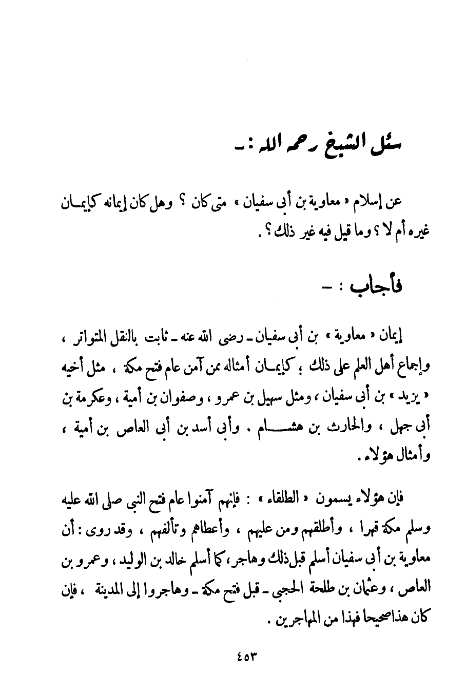 عَنْ إسْلَامِ " مُعَاوِيَةَ بْنِ أَبِي سُفْيَانَ " مَتَى كَانَ؟ وَهَلْ كَانَ إيمَانُهُ كَإِيمَانِ غَيْرِهِ أَمْ لَا؟ وَمَا قِيلَ فِيهِ غَيْرُ ذَلِكَ؟ .