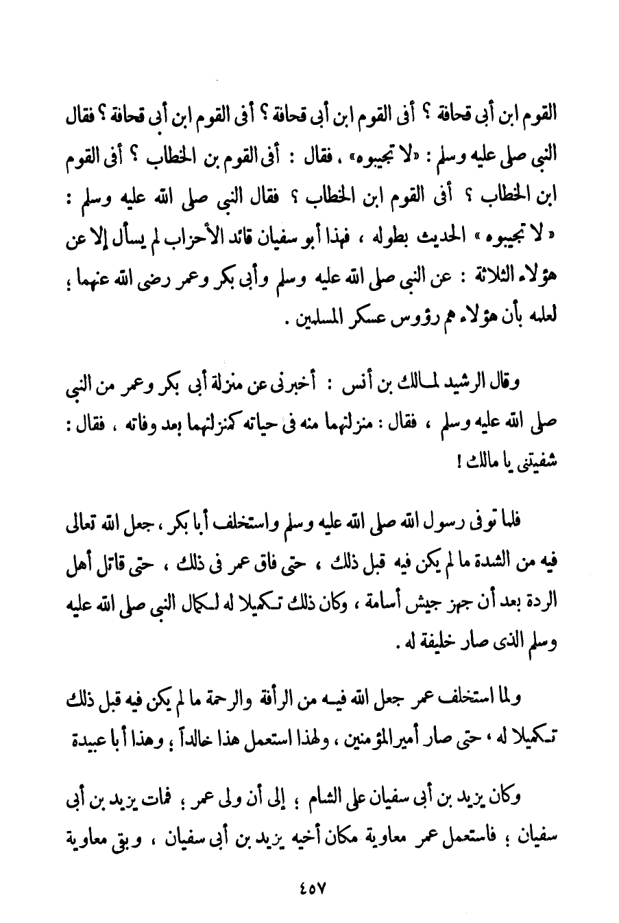 الْقَوْمِ ابْنُ أَبِي قُحَافَةَ؟ أَفِي الْقَوْمِ ابْنُ أَبِي قُحَافَةَ؟ أَفِي الْقَوْمِ ابْنُ أَبِي قُحَافَةَ؟ فَقَالَ النَّبِيُّ صَلَّى اللَّهُ عَلَيْهِ وَسَلَّمَ لَا تُجِيبُوهُ فَقَالَ: أَفِي الْقَوْمِ ابْنُ الْخَطَّابِ؟ أَفِي الْقَوْمِ ابْنُ الْخَطَّابِ؟ أَفِي الْقَوْمِ ابْنُ الْخَطَّابِ؟ فَقَالَ النَّبِيُّ صَلَّى اللَّهُ عَلَيْهِ وَسَلَّمَ لَا تُجِيبُوهُ} الْحَدِيثُ بِطُولِهِ فَهَذَا أَبُو سُفْيَانَ قَائِدُ الْأَحْزَابِ لَمْ يَسْأَلْ إلَّا عَنْ هَؤُلَاءِ الثَّلَاثَةِ: عَنْ النَّبِيِّ صَلَّى اللَّهُ عَلَيْهِ وَسَلَّمَ وَأَبِي بَكْرٍ وَعُمَرَ رَضِيَ اللَّهُ عَنْهُمَا لِعِلْمِهِ بِأَنَّ هَؤُلَاءِ هُمْ رُءُوسُ عَسْكَرِ الْمُسْلِمِينَ. وَقَالَ الرَّشِيدُ لِمَالِكِ بْنِ أَنَسٍ: أَخْبِرْنِي عَنْ مَنْزِلَةِ أَبِي بَكْرٍ وَعُمَرَ مِنْ النَّبِيِّ صَلَّى اللَّهُ عَلَيْهِ وَسَلَّمَ فَقَالَ: مَنْزِلَتُهُمَا مِنْهُ فِي حَيَاتِهِ كَمَنْزِلَتِهِمَا بَعْدَ وَفَاتِهِ فَقَالَ: شَفَيْتَنِي يَا مَالِكُ فَلَمَّا تُوُفِّيَ رَسُولُ اللَّهِ صَلَّى اللَّهُ عَلَيْهِ وَسَلَّمَ وَاسْتَخْلَفَ أَبَا بَكْرٍ جَعَلَ اللَّهُ تَعَالَى فِيهِ مِنْ الشِّدَّةِ مَا لَمْ يَكُنْ فِيهِ قَبْلَ ذَلِكَ حَتَّى فَاقَ عُمَرَ فِي ذَلِكَ حَتَّى قَاتَلَ أَهْلَ الرِّدَّةِ بَعْدَ أَنْ جَهَّزَ جَيْشَ أُسَامَةَ وَكَانَ ذَلِكَ تَكْمِيلًا لَهُ لِكَمَالِ النَّبِيِّ صَلَّى اللَّهُ عَلَيْهِ وَسَلَّمَ الَّذِي صَارَ خَلِيفَةً لَهُ. وَلَمَّا اسْتَخْلَفَ عُمَرَ جَعَلَ اللَّهُ فِيهِ مِنْ الرَّأْفَةِ وَالرَّحْمَةِ مَا لَمْ يَكُنْ فِيهِ قَبْلَ ذَلِكَ تَكْمِيلًا لَهُ حَتَّى صَارَ أَمِيرَ الْمُؤْمِنِينَ وَلِهَذَا اسْتَعْمَلَ هَذَا خَالِدًا؛ وَهَذَا أَبَا عُبَيْدَةَ. وَكَانَ يَزِيدُ بْنُ أَبِي سُفْيَانَ عَلَى الشَّامِ؛ إلَى أَنْ وُلِّيَ عُمَرُ؛ فَمَاتَ يَزِيدُ بْنُ أَبِي سُفْيَانَ؛ فَاسْتَعْمَلَ عُمَرُ مُعَاوِيَةَ مَكَانَ أَخِيهِ يَزِيدَ بْنِ أَبِي سُفْيَانَ وَبَقِيَ مُعَاوِيَةُ