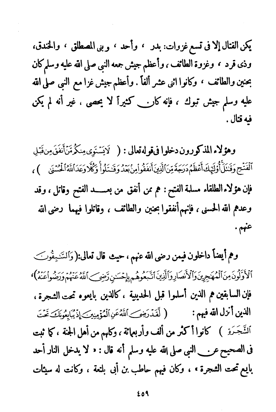 يَكُنْ الْقِتَالُ إلَّا فِي تِسْعِ غَزَوَاتٍ: بَدْرٍ وَأُحُدٍ وَبَنِيَّ الْمُصْطَلِقِ وَالْخَنْدَقِ وَذِي قَرَدٍ وَغَزْوَةِ الطَّائِفِ وَأَعْظَمُ جَيْشٍ جَمَعَهُ النَّبِيُّ صَلَّى اللَّهُ عَلَيْهِ وَسَلَّمَ كَانَ بحنين وَالطَّائِفِ وَكَانُوا اثْنَيْ عَشَرَ أَلْفًا. وَأَعْظَمُ جَيْشٍ غَزَا مَعَ النَّبِيِّ صَلَّى اللَّهُ عَلَيْهِ وَسَلَّمَ جَيْشُ تَبُوكَ فَإِنَّهُ كَانَ كَثِيرًا لَا يُحْصَى غَيْرَ أَنَّهُ لَمْ يَكُنْ فِيهِ قِتَالٌ. وَهَؤُلَاءِ الْمَذْكُورُونَ دَخَلُوا فِي قَوْله تَعَالَى {لَا يَسْتَوِي مِنْكُمْ مَنْ أَنْفَقَ مِنْ قَبْلِ الْفَتْحِ وَقَاتَلَ أُولَئِكَ أَعْظَمُ دَرَجَةً مِنَ الَّذِينَ أَنْفَقُوا مِنْ بَعْدُ وَقَاتَلُوا وَكُلًّا وَعَدَ اللَّهُ الْحُسْنَى} فَإِنَّ هَؤُلَاءِ الطُّلَقَاءَ مُسْلِمَةُ الْفَتْحِ: هُمْ مِمَّنْ أَنْفَقَ مِنْ بَعْدِ الْفَتْحِ وَقَاتَلَ وَقَدْ وَعَدَهُمْ اللَّهُ الْحُسْنَى فَإِنَّهُمْ أَنْفَقُوا بحنين وَالطَّائِفِ وَقَاتَلُوا فِيهِمَا رَضِيَ اللَّهُ عَنْهُمْ. وَهُمْ أَيْضًا دَاخِلُونَ فِيمَنْ رَضِيَ اللَّهُ عَنْهُمْ حَيْثُ قَالَ تَعَالَى: {وَالسَّابِقُونَ الْأَوَّلُونَ مِنَ الْمُهَاجِرِينَ وَالْأَنْصَارِ وَالَّذِينَ اتَّبَعُوهُمْ بِإِحْسَانٍ رَضِيَ اللَّهُ عَنْهُمْ وَرَضُوا عَنْهُ} فَإِنَّ السَّابِقِينَ هُمْ الَّذِينَ أَسْلَمُوا قَبْلَ الْحُدَيْبِيَةِ كَاَلَّذِينَ بَايَعُوهُ تَحْتَ الشَّجَرَةِ الَّذِينَ أَنْزَلَ اللَّهُ فِيهِمْ: {لَقَدْ رَضِيَ اللَّهُ عَنِ الْمُؤْمِنِينَ إذْ يُبَايِعُونَكَ تَحْتَ الشَّجَرَةِ} كَانُوا أَكْثَرَ مَنْ أَلْفٍ وَأَرْبَعِمِائَةٍ وَكُلُّهُمْ مِنْ أَهْلِ الْجَنَّةِ كَمَا ثَبَتَ فِي الصَّحِيحِ عَنْ النَّبِيِّ صَلَّى اللَّهُ عَلَيْهِ وَسَلَّمَ أَنَّهُ قَالَ: " {لَا يَدْخُلُ النَّارَ أَحَدٌ بَايَعَ تَحْتَ الشَّجَرَةِ} " وَكَانَ فِيهِمْ حَاطِبُ بْنُ أَبِي بلتعة وَكَانَتْ لَهُ سَيِّئَاتٌ