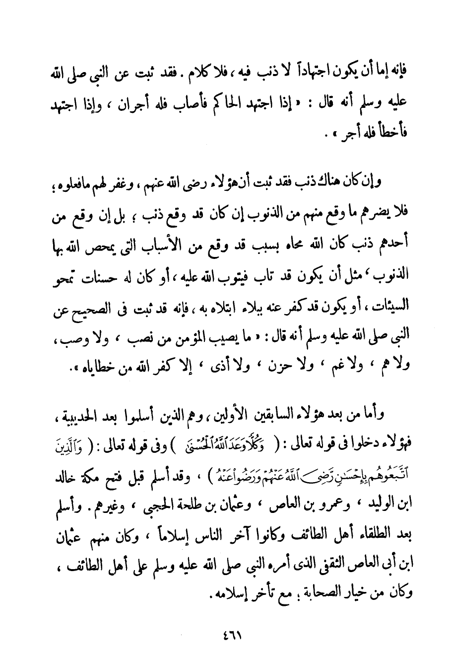 فَإِنَّهُ إمَّا أَنْ يَكُونَ اجْتِهَادًا لَا ذَنْبَ فِيهِ فَلَا كَلَامَ. فَقَدْ ثَبَتَ عَنْ النَّبِيِّ صَلَّى اللَّهُ عَلَيْهِ وَسَلَّمَ أَنَّهُ قَالَ: " {إذَا اجْتَهَدَ الْحَاكِمُ فَأَصَابَ فَلَهُ أَجْرَانِ وَإِذَا اجْتَهَدَ فَأَخْطَأَ فَلَهُ أَجْرٌ} ". وَإِنْ كَانَ هُنَاكَ ذَنْبٌ فَقَدْ ثَبَتَ أَنَّ هَؤُلَاءِ رَضِيَ اللَّهُ عَنْهُمْ وَغَفَرَ لَهُمْ مَا فَعَلُوهُ؛ فَلَا يَضُرُّهُمْ مَا وَقَعَ مِنْهُمْ مَنْ الذُّنُوبِ إنْ كَانَ قَدْ وَقَعَ ذَنْبٌ؛ بَلْ إنْ وَقَعَ مِنْ أَحَدِهِمْ ذَنْبٌ كَانَ اللَّهُ مَحَاهُ بِسَبَبِ قَدْ وَقَعَ مِنْ الْأَسْبَابِ الَّتِي يُمَحِّصُ اللَّهُ بِهَا الذُّنُوبَ، مِثْلُ أَنْ يَكُونَ قَدْ تَابَ فَيَتُوبَ اللَّهُ عَلَيْهِ أَوْ كَانَ لَهُ حَسَنَاتٌ تَمْحُو السَّيِّئَاتِ أَوْ يَكُونَ قَدْ كَفَّرَ عَنْهُ بِبَلَاءِ ابْتَلَاهُ بِهِ فَإِنَّهُ قَدْ ثَبَتَ فِي الصَّحِيحِ عَنْ النَّبِيِّ صَلَّى اللَّهُ عَلَيْهِ وَسَلَّمَ أَنَّهُ قَالَ: " {مَا يُصِيبُ الْمُؤْمِنَ مِنْ نَصَبٍ وَلَا وَصَبٍ وَلَا هَمٍّ وَلَا غَمٍّ وَلَا حَزَنٍ وَلَا أَذًى إلَّا كَفَّرَ اللَّهُ مِنْ خَطَايَاهُ} ". وَأَمَّا مَنْ بَعْدُ هَؤُلَاءِ السَّابِقِينَ الْأَوَّلِينَ وَهُمْ الَّذِينَ أَسْلَمُوا بَعْدَ الْحُدَيْبِيَةِ فَهَؤُلَاءِ دَخَلُوا فِي قَوْله تَعَالَى {وَكُلًّا وَعَدَ اللَّهُ الْحُسْنَى} وَفِي قَوْله تَعَالَى {وَالَّذِينَ اتَّبَعُوهُمْ بِإِحْسَانٍ رَضِيَ اللَّهُ عَنْهُمْ وَرَضُوا عَنْهُ} وَقَدْ أَسْلَمَ قَبْلَ فَتْحِ مَكَّةَ خَالِدُ بْنُ الْوَلِيدِ وَعَمْرُو بْنُ العاص وَعُثْمَانُ بْنُ طَلْحَةَ الحجبي وَغَيْرُهُمْ. وَأَسْلَمَ بَعْدَ الطُّلَقَاءِ أَهْلُ الطَّائِفِ وَكَانُوا آخِرَ النَّاسِ إسْلَامًا وَكَانَ مِنْهُمْ عُثْمَانُ بْنُ أَبِي العاص الثَّقَفِيُّ الَّذِي أَمَّرَهُ النَّبِيُّ صَلَّى اللَّهُ عَلَيْهِ وَسَلَّمَ عَلَى أَهْلِ الطَّائِفِ وَكَانَ مِنْ خِيَارِ الصَّحَابَةِ؛ مَعَ تَأَخُّرِ إسْلَامِهِ.