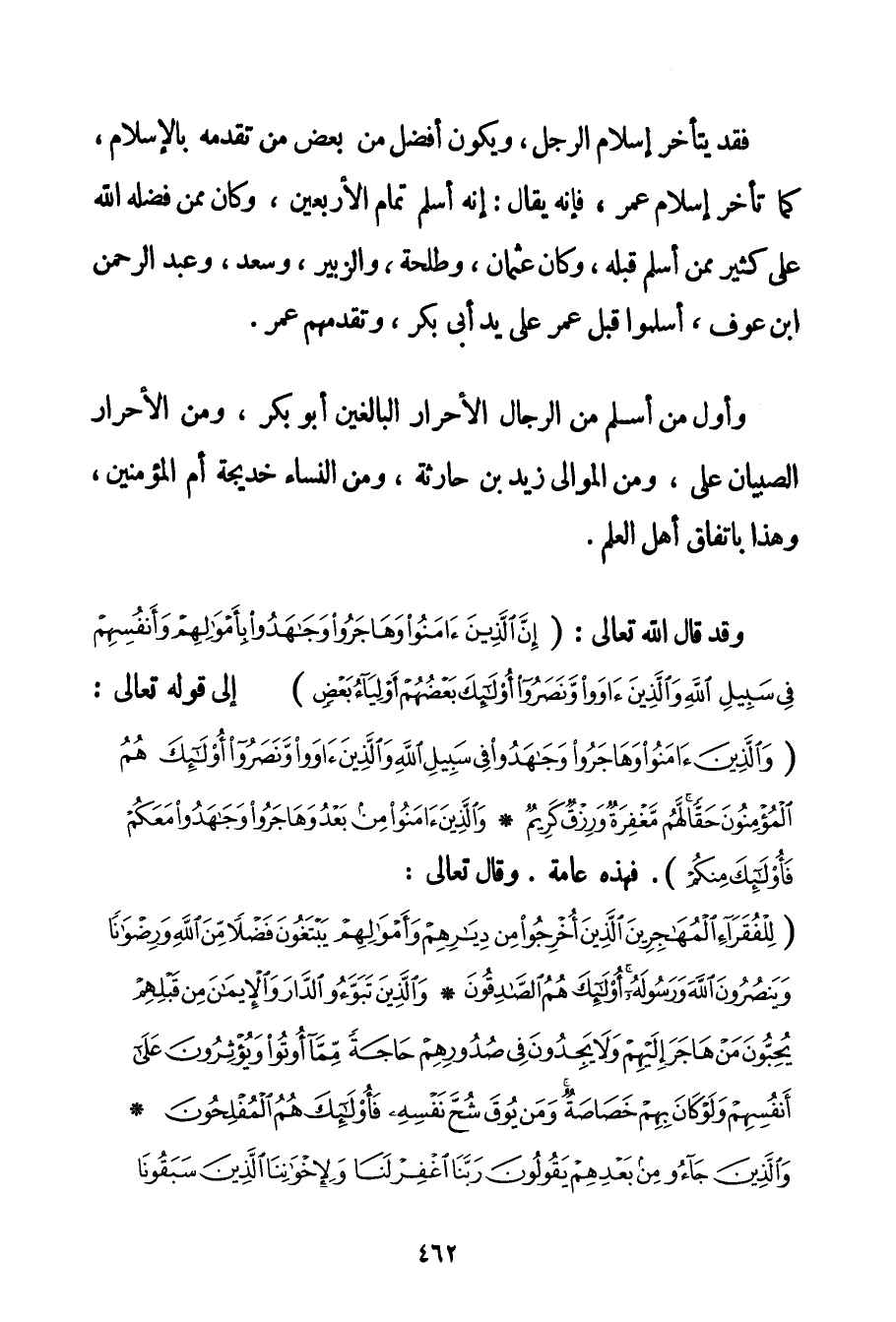 فَقَدْ يَتَأَخَّرُ إسْلَامُ الرَّجُلِ وَيَكُونُ أَفْضَلَ مِنْ بَعْضِ مَنْ تَقَدَّمَهُ بِالْإِسْلَامِ كَمَا تَأَخَّرَ إسْلَامُ عُمَر فَإِنَّهُ يُقَالُ: إنَّهُ أَسْلَمَ تَمَامَ الْأَرْبَعِينَ وَكَانَ مِمَّنْ فَضَّلَهُ اللَّهُ عَلَى كَثِيرٍ مِمَّنْ أَسْلَمَ قَبْلَهُ وَكَانَ عُثْمَانُ وَطَلْحَةُ وَالزُّبَيْرُ وَسَعْدٌ وَعَبْدُ الرَّحْمَنِ بْنُ عَوْفٍ أَسْلَمُوا قَبْلَ عُمَر عَلَى يَدِ أَبِي بَكْرٍ وَتَقَدَّمَهُمْ عُمَر. وَأَوَّلُ مَنْ أَسْلَمَ مِنْ الرِّجَالِ الْأَحْرَارِ الْبَالِغِينَ أَبُو بَكْر وَمِنْ الْأَحْرَارِ الصِّبْيَانِ عَلِيٌّ وَمِنْ الْمَوَالِي زَيْدُ بْنُ حَارِثَةَ وَمِنْ النِّسَاءِ خَدِيجَةُ أَمْ الْمُؤْمِنِينَ وَهَذَا بِاتِّفَاقِ أَهْلِ الْعِلْمِ. وَقَدْ قَالَ اللَّهُ تَعَالَى: {إنَّ الَّذِينَ آمَنُوا وَهَاجَرُوا وَجَاهَدُوا بِأَمْوَالِهِمْ وَأَنْفُسِهِمْ فِي سَبِيلِ اللَّهِ وَالَّذِينَ آوَوْا وَنَصَرُوا أُولَئِكَ بَعْضُهُمْ أَوْلِيَاءُ بَعْضٍ} إلَى قَوْله تَعَالَى {وَالَّذِينَ آمَنُوا وَهَاجَرُوا وَجَاهَدُوا فِي سَبِيلِ اللَّهِ وَالَّذِينَ آوَوْا وَنَصَرُوا أُولَئِكَ هُمُ الْمُؤْمِنُونَ حَقًّا لَهُمْ مَغْفِرَةٌ وَرِزْقٌ كَرِيمٌ} {وَالَّذِينَ آمَنُوا مِنْ بَعْدُ وَهَاجَرُوا وَجَاهَدُوا مَعَكُمْ فَأُولَئِكَ مِنْكُمْ} . فَهَذِهِ عَامَّةٌ. وَقَالَ تَعَالَى: {لِلْفُقَرَاءِ الْمُهَاجِرِينَ الَّذِينَ أُخْرِجُوا مِنْ دِيارِهِمْ وَأَمْوَالِهِمْ يَبْتَغُونَ فَضْلًا مِنَ اللَّهِ وَرِضْوَانًا وَيَنْصُرُونَ اللَّهَ وَرَسُولَهُ أُولَئِكَ هُمُ الصَّادِقُونَ} {وَالَّذِينَ تَبَوَّءُوا الدَّارَ وَالْإِيمَانَ مِنْ قَبْلِهِمْ يُحِبُّونَ مَنْ هَاجَرَ إلَيْهِمْ وَلَا يَجِدُونَ فِي صُدُورِهِمْ حَاجَةً مِمَّا أُوتُوا وَيُؤْثِرُونَ عَلَى أَنْفُسِهِمْ وَلَوْ كَانَ بِهِمْ خَصَاصَةٌ وَمَنْ يُوقَ شُحَّ نَفْسِهِ فَأُولَئِكَ هُمُ الْمُفْلِحُونَ} {وَالَّذِينَ جَاءُوا مِنْ بَعْدِهِمْ يَقُولُونَ رَبَّنَا اغْفِرْ لَنَا وَلِإِخْوَانِنَا