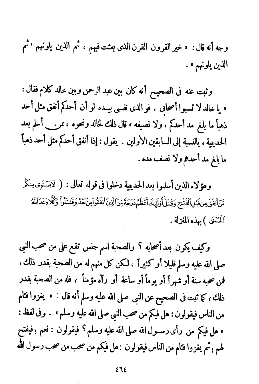 وَجْهٍ أَنَّهُ قَالَ: " {خَيْرُ الْقُرُونِ الْقَرْنُ الَّذِي بُعِثْت فِيهِمْ ثُمَّ الَّذِينَ يَلُونَهُمْ ثُمَّ الَّذِينَ يَلُونَهُمْ} ". وَثَبَتَ عَنْهُ فِي الصَّحِيحِ {أَنَّهُ كَانَ بَيْنَ عَبْدِ الرَّحْمَنِ وَبَيْنَ خَالِدٍ كَلَامٌ فَقَالَ: يَا خَالِدُ لَا تَسُبُّوا أَصْحَابِي. فَوَاَلَّذِي نَفْسِي بِيَدِهِ لَوْ أَنَّ أَحَدَكُمْ أَنْفَقَ مِثْلَ أُحُدٍ ذَهَبًا مَا بَلَغَ مُدَّ أَحَدِهِمْ وَلَا نَصِيفَهُ} " قَالَ ذَلِكَ لِخَالِدِ وَنَحْوِهِ مِمَّنْ أَسْلَمَ بَعْدَ الْحُدَيْبِيَةِ بِالنِّسْبَةِ إلَى السَّابِقِينَ الْأَوَّلِينَ. يَقُولُ: إذَا أَنْفَقَ أَحَدُكُمْ مِثْلَ أُحُدٍ ذَهَبًا مَا بَلَغَ مُدَّ أَحَدِهِمْ وَلَا نِصْفَ مُدِّهِ. وَهَؤُلَاءِ الَّذِينَ أَسْلَمُوا بَعْدَ الْحُدَيْبِيَةِ دَخَلُوا فِي قَوْله تَعَالَى {لَا يَسْتَوِي مِنْكُمْ مَنْ أَنْفَقَ مِنْ قَبْلِ الْفَتْحِ وَقَاتَلَ أُولَئِكَ أَعْظَمُ دَرَجَةً مِنَ الَّذِينَ أَنْفَقُوا مِنْ بَعْدُ وَقَاتَلُوا وَكُلًّا وَعَدَ اللَّهُ الْحُسْنَى} بِهَذِهِ الْمَنْزِلَةِ. وَكَيْفَ يَكُونُ بَعْدَ أَصْحَابِهِ؟ وَالصُّحْبَةُ اسْمُ جِنْسٍ تَقَعُ عَلَى مَنْ صَحِبَ النَّبِيَّ صَلَّى اللَّهُ عَلَيْهِ وَسَلَّمَ قَلِيلًا أَوْ كَثِيرًا لَكِنْ كُلٌّ مِنْهُمْ لَهُ مِنْ الصُّحْبَةِ بِقَدْرِ ذَلِكَ فَمَنْ صَحِبَهُ سَنَةً أَوْ شَهْرًا أَوْ يَوْمًا أَوْ سَاعَةً أَوْ رَآهُ مُؤْمِنًا فَلَهُ مِنْ الصُّحْبَةِ بِقَدْرِ ذَلِكَ كَمَا ثَبَتَ فِي الصَّحِيحِ عَنْ النَّبِيِّ صَلَّى اللَّهُ عَلَيْهِ وَسَلَّمَ أَنَّهُ قَالَ: " {يَغْزُوا فِئَامٌ مِنْ النَّاسِ فَيَقُولُونَ: هَلْ فِيكُمْ مَنْ صَحِبَ النَّبِيَّ صَلَّى اللَّهُ عَلَيْهِ وَسَلَّمَ. وَفِي لَفْظٍ: هَلْ فِيكُمْ مَنْ رَأَى رَسُولَ اللَّهِ صَلَّى اللَّهُ عَلَيْهِ وَسَلَّمَ؟ فَيَقُولُونَ: نَعَمْ؛ فَيُفْتَحُ لَهُمْ؛ ثُمَّ يَغْزُوا فِئَامٌ مِنْ النَّاسِ فَيَقُولُونَ: هَلْ فِيكُمْ مَنْ صَحِبَ مَنْ صَحِبَ رَسُولَ اللَّهِ