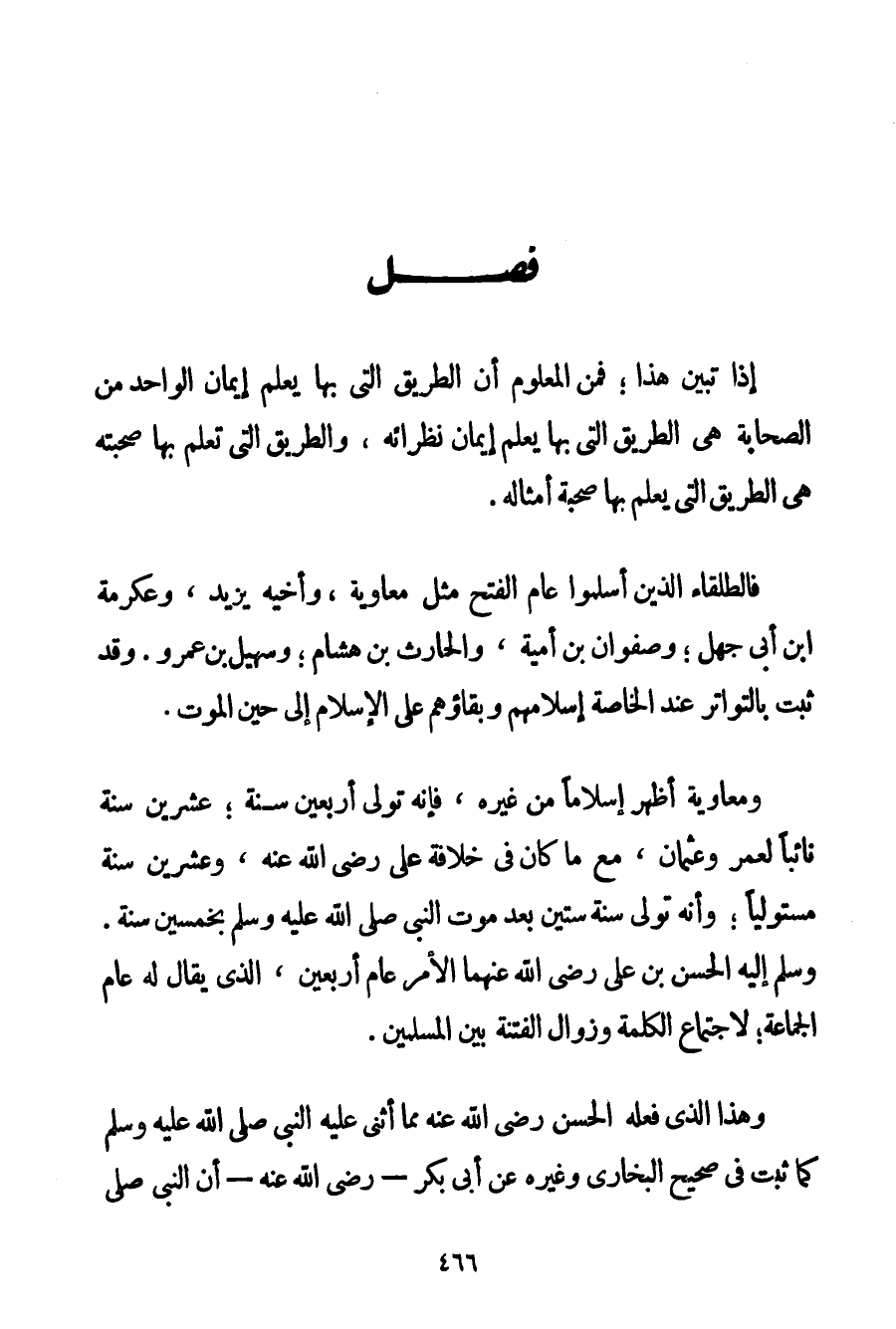 إذَا تَبَيَّنَ هَذَا؛ فَمِنْ الْمَعْلُومِ أَنَّ الطَّرِيقَ الَّتِي بِهَا يُعْلَمُ إيمَانُ الْوَاحِدِ مِنْ الصَّحَابَةِ هِيَ الطَّرِيقُ الَّتِي بِهَا يُعْلَمُ إيمَانُ نُظَرَائِهِ وَالطَّرِيقُ الَّتِي تُعْلَمُ بِهَا صُحْبَتُهُ هِيَ الطَّرِيقُ الَّتِي يُعْلَمُ بِهَا صُحْبَةَ أَمْثَالِهِ. فَالطُّلَقَاءُ الَّذِينَ أَسْلَمُوا عَامَ الْفَتْحِ مِثْلَ: مُعَاوِيَةَ وَأَخِيهِ يَزِيدَ وَعِكْرِمَةَ بْنِ أَبِي جَهْلٍ؛ وَصَفْوَانَ بْنِ أُمَيَّةَ وَالْحَارِثِ بْنِ هِشَامٍ؛ وَسُهَيْلِ بْنِ عَمْرٍو. وَقَدْ ثَبَتَ بِالتَّوَاتُرِ عِنْدَ الْخَاصَّةِ إسْلَامُهُمْ وَبَقَاؤُهُمْ عَلَى الْإِسْلَامِ إلَى حِينِ الْمَوْتِ. وَمُعَاوِيَةُ أَظْهَرُ إسْلَامًا مِنْ غَيْرِهِ فَإِنَّهُ تَوَلَّى أَرْبَعِينَ سَنَةً؛ عِشْرِينَ سَنَةً نَائِبًا لِعُمَرِ وَعُثْمَانَ مَعَ مَا كَانَ فِي خِلَافَةِ عَلِيٍّ رَضِيَ اللَّهُ عَنْهُ وَعِشْرِينَ سَنَةً مُسْتَوْلِيًا؛ وَأَنَّهُ تَوَلَّى سَنَةَ سِتِّينَ بَعْدَ مَوْتِ النَّبِيِّ صَلَّى اللَّهُ عَلَيْهِ وَسَلَّمَ بِخَمْسِينَ سَنَةً. وَسَلَّمَ إلَيْهِ الْحَسَنُ بْنُ عَلِيٍّ رَضِيَ اللَّهُ عَنْهُمَا الْأَمْرَ عَامَ أَرْبَعِينَ الَّذِي يُقَالُ لَهُ عَامُ الْجَمَاعَةِ؛ لِاجْتِمَاعِ الْكَلِمَةِ وَزَوَالِ الْفِتْنَةِ بَيْنَ الْمُسْلِمِينَ. وَهَذَا الَّذِي فَعَلَهُ الْحَسَنُ رَضِيَ اللَّهُ عَنْهُ مِمَّا أَثْنَى عَلَيْهِ النَّبِيُّ صَلَّى اللَّهُ عَلَيْهِ وَسَلَّمَ كَمَا ثَبَتَ فِي صَحِيحِ الْبُخَارِيِّ وَغَيْرِهِ عَنْ أَبِي بَكْر - رَضِيَ اللَّهُ عَنْهُ - أَنَّ النَّبِيَّ