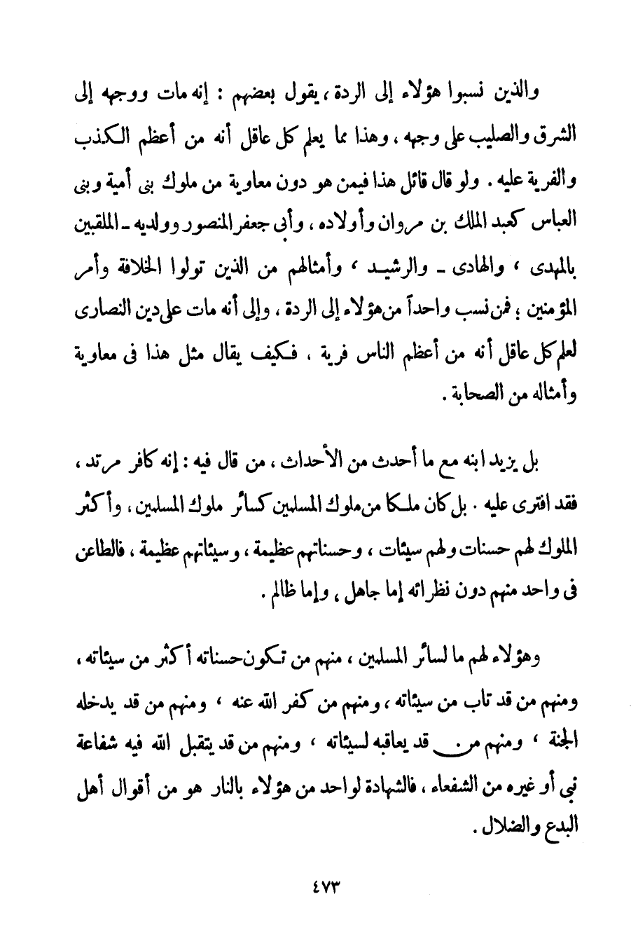 وَاَلَّذِينَ نَسَبُوا هَؤُلَاءِ إلَى الرِّدَّةِ يَقُولُ بَعْضُهُمْ: إنَّهُ مَاتَ وَوَجْهُهُ إلَى الشَّرْقِ وَالصَّلِيبُ عَلَى وَجْهِهِ وَهَذَا مِمَّا يَعْلَمُ كُلُّ عَاقِلٍ أَنَّهُ مِنْ أَعْظَمِ الْكَذِبِ وَالْفِرْيَةِ عَلَيْهِ. وَلَوْ قَالَ قَائِلٌ هَذَا فِيمَنْ هُوَ دُونَ مُعَاوِيَةَ مِنْ مُلُوكِ بَنِي أُمَيَّةَ وَبَنِيَّ الْعَبَّاسِ كَعَبْدِ الْمَلِكِ بْنِ مَرْوَانَ وَأَوْلَادِهِ وَأَبِي جَعْفَرٍ الْمَنْصُورِ وَوَلَدَيْهِ - الْمُلَقَّبَيْنِ بِالْمَهْدِيِّ وَالْهَادِي - وَالرَّشِيدِ وَأَمْثَالِهِمْ مِنْ الَّذِينَ تَوَلَّوْا الْخِلَافَةَ وَأَمْرَ الْمُؤْمِنِينَ؛ فَمَنْ نَسَبَ وَاحِدًا مِنْ هَؤُلَاءِ إلَى الرِّدَّةِ وَإِلَى أَنَّهُ مَاتَ عَلَى دِينِ النَّصَارَى لَعَلِمَ كُلُّ عَاقِلٍ أَنَّهُ مِنْ أَعْظَمِ النَّاسِ فِرْيَةً فَكَيْفَ يُقَالُ مِثْلُ هَذَا فِي مُعَاوِيَةَ وَأَمْثَالِهِ مِنْ الصَّحَابَةِ. بَلْ يَزِيدُ ابْنُهُ مَعَ مَا أَحْدَثَ مِنْ الْأَحْدَاثِ مَنْ قَالَ فِيهِ: إنَّهُ كَافِرٌ مُرْتَدٌّ فَقَدْ افْتَرَى عَلَيْهِ. بَلْ كَانَ مَلِكًا مِنْ مُلُوكِ الْمُسْلِمِينَ كَسَائِرِ مُلُوكِ الْمُسْلِمِينَ وَأَكْثَرُ الْمُلُوكِ لَهُمْ حَسَنَاتٌ وَلَهُمْ سَيِّئَاتٌ وَحَسَنَاتُهُمْ عَظِيمَةٌ وَسَيِّئَاتُهُمْ عَظِيمَةٌ فَالطَّاعِنُ فِي وَاحِدٍ مِنْهُمْ دُونَ نُظَرَائِهِ إمَّا جَاهِلٌ وَإِمَّا ظَالِمٌ. وَهَؤُلَاءِ لَهُمْ مَا لِسَائِرِ الْمُسْلِمِينَ مِنْهُمْ مَنْ تَكُونُ حَسَنَاتُهُ أَكْثَرَ مِنْ سَيِّئَاتِهِ وَمِنْهُمْ مَنْ قَدْ تَابَ مِنْ سَيِّئَاتِهِ وَمِنْهُمْ مَنْ كَفَّرَ اللَّهُ عَنْهُ وَمِنْهُمْ مَنْ قَدْ يُدْخِلُهُ الْجَنَّةَ وَمِنْهُمْ مَنْ قَدْ يُعَاقِبُهُ لِسَيِّئَاتِهِ وَمِنْهُمْ مَنْ قَدْ يَتَقَبَّلُ اللَّهُ فِيهِ شَفَاعَةَ نَبِيٍّ أَوْ غَيْرِهِ مِنْ الشُّفَعَاءِ فَالشَّهَادَةُ لِوَاحِدِ مِنْ هَؤُلَاءِ بِالنَّارِ هُوَ مِنْ أَقْوَالِ أَهْلِ الْبِدَعِ وَالضَّلَالِ.