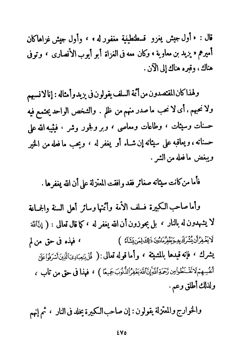 قَالَ: " {أَوَّلُ جَيْشٍ يَغْزُو قُسْطَنْطِينِيَّةَ مَغْفُورٌ لَهُ} " وَأَوَّلُ جَيْشٍ غَزَاهَا كَانَ أَمِيرُهُمْ " يَزِيدُ بْنُ مُعَاوِيَةَ " وَكَانَ مَعَهُ فِي الْغُزَاةِ أَبُو أَيُّوبٍ الْأَنْصَارِيُّ وَتُوُفِّيَ هُنَاكَ وَقَبْرُهُ هُنَاكَ إلَى الْآنِ. وَلِهَذَا كَانَ الْمُقْتَصِدُونَ مِنْ أَئِمَّةِ السَّلَفِ يَقُولُونَ فِي يَزِيدَ وَأَمْثَالِهِ: إنَّا لَا نَسُبُّهُمْ وَلَا نُحِبُّهُمْ أَيْ لَا نُحِبُّ مَا صَدَرَ مِنْهُمْ مِنْ ظُلْمٍ. وَالشَّخْصُ الْوَاحِدُ يَجْتَمِعُ فِيهِ حَسَنَاتٌ وَسَيِّئَاتٌ وَطَاعَاتٌ وَمَعَاصٍ وَبِرٌّ وَفُجُورٌ وَشَرٌّ فَيُثِيبُهُ اللَّهُ عَلَى حَسَنَاتِهِ وَيُعَاقِبُهُ عَلَى سَيِّئَاتِهِ إنْ شَاءَ أَوْ يَغْفِرُ لَهُ وَيُحِبُّ مَا فَعَلَهُ مِنْ الْخَيْرِ وَيُبْغِضُ مَا فَعَلَهُ مِنْ الشَّرِّ. فَأَمَّا مَنْ كَانَتْ سَيِّئَاتُهُ صَغَائِرَ فَقَدْ وَافَقَتْ الْمُعْتَزِلَةُ عَلَى أَنَّ اللَّهَ يَغْفِرُهَا. وَأَمَّا صَاحِبُ الْكَبِيرَةِ فَسَلَفُ الْأُمَّةِ وَأَئِمَّتُهَا وَسَائِرُ أَهْلِ السُّنَّةِ وَالْجَمَاعَةِ لَا يَشْهَدُونَ لَهُ بِالنَّارِ بَلْ يُجَوِّزُونَ أَنَّ اللَّهَ يَغْفِرُ لَهُ كَمَا قَالَ تَعَالَى: {إنَّ اللَّهَ لَا يَغْفِرُ أَنْ يُشْرَكَ بِهِ وَيَغْفِرُ مَا دُونَ ذَلِكَ لِمَنْ يَشَاءُ} فَهَذِهِ فِي حَقِّ مَنْ لَمْ يُشْرِكْ فَإِنَّهُ قَيَّدَهَا بِالْمَشِيئَةِ وَأَمَّا قَوْله تَعَالَى {قُلْ يَا عِبَادِيَ الَّذِينَ أَسْرَفُوا عَلَى أَنْفُسِهِمْ لَا تَقْنَطُوا مِنْ رَحْمَةِ اللَّهِ إنَّ اللَّهَ يَغْفِرُ الذُّنُوبَ جَمِيعًا} فَهَذَا فِي حَقِّ مَنْ تَابَ وَلِذَلِكَ أَطْلَقَ وَعَمَّ. وَالْخَوَارِجُ وَالْمُعْتَزِلَةُ يَقُولُونَ: إنَّ صَاحِبَ الْكَبِيرَةِ يَخْلُدُ فِي النَّارِ ثُمَّ إنَّهُمْ