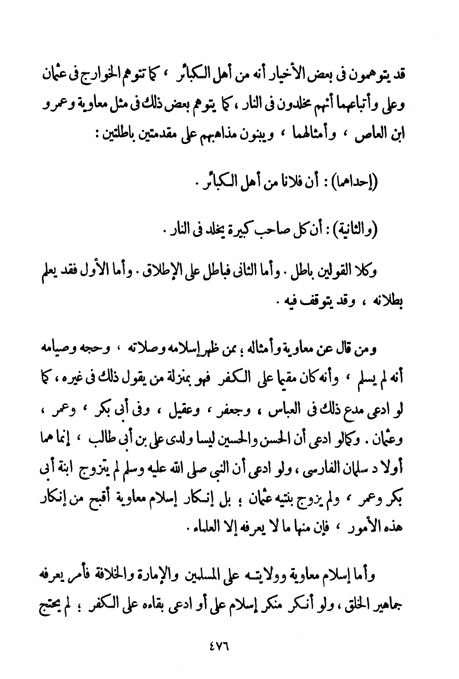 وَالثَّانِيَةُ: أَنَّ كُلَّ صَاحِبِ كَبِيرَةٍ يَخْلُدُ فِي النَّارِ. وَكِلَا الْقَوْلَيْنِ بَاطِلٌ. وَأَمَّا الثَّانِي فَبَاطِلٌ عَلَى الْإِطْلَاقِ. وَأَمَّا الْأَوَّلُ فَقَدْ يُعْلَمُ بُطْلَانُهُ وَقَدْ يَتَوَقَّفُ فِيهِ. وَمَنْ قَالَ عَنْ مُعَاوِيَةَ وَأَمْثَالِهِ؛ مِمَّنْ ظَهَرَ إسْلَامُهُ وَصَلَاتُهُ وَحَجُّهُ وَصِيَامُهُ أَنَّهُ لَمْ يُسْلِمْ وَأَنَّهُ كَانَ مُقِيمًا عَلَى الْكُفْرِ فَهُوَ بِمَنْزِلَةِ مَنْ يَقُولُ ذَلِكَ فِي غَيْرِهِ كَمَا لَوْ ادَّعَى مُدَّعٍ ذَلِكَ فِي الْعَبَّاسِ وَجَعْفَرٍ وَعَقِيلٍ وَفِي أَبِي بَكْرٍ وَعُمَرَ وَعُثْمَانَ. وَكَمَا لَوْ ادَّعَى أَنَّ الْحَسَنَ وَالْحُسَيْنَ لَيْسَا وَلَدَيْ عَلِيِّ بْنِ أَبِي طَالِبٍ إنَّمَا هُمَا أَوْلَادُ سَلْمَانَ الْفَارِسِيِّ وَلَوْ ادَّعَى أَنَّ النَّبِيَّ صَلَّى اللَّهُ عَلَيْهِ وَسَلَّمَ لَمْ يَتَزَوَّجْ ابْنَتَي أَبِي بَكْرٍ وَعُمَرَ وَلَمْ يُزَوِّجْ بِنْتَيْهِ عُثْمَانَ؛ بَلْ إنْكَارُ إسْلَامِ مُعَاوِيَةَ أَقْبَحُ مِنْ إنْكَارِ هَذِهِ الْأُمُورِ فَإِنَّ مِنْهَا مَا لَا يَعْرِفُهُ إلَّا الْعُلَمَاءُ. وَأَمَّا إسْلَامُ مُعَاوِيَةَ وَوِلَايَتُهُ عَلَى الْمُسْلِمِينَ وَالْإِمَارَةِ وَالْخِلَافَةِ فَأَمْرٌ يَعْرِفُهُ جَمَاهِيرُ الْخَلْقِ وَلَوْ أَنْكَرَ مُنْكِرٌ إسْلَامَ عَلِيٍّ أَوْ ادَّعَى بَقَاءَهُ عَلَى الْكُفْرِ؛ لَمْ يُحْتَجَّ