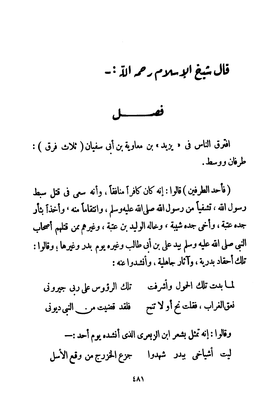 فَصْلٌ: افْتَرَقَ النَّاسُ فِي " يَزِيدَ " بْنِ مُعَاوِيَةَ بْنِ أَبِي سُفْيَانَ ثَلَاثُ فِرَقٍ: طَرَفَانِ وَوَسَطٌ.