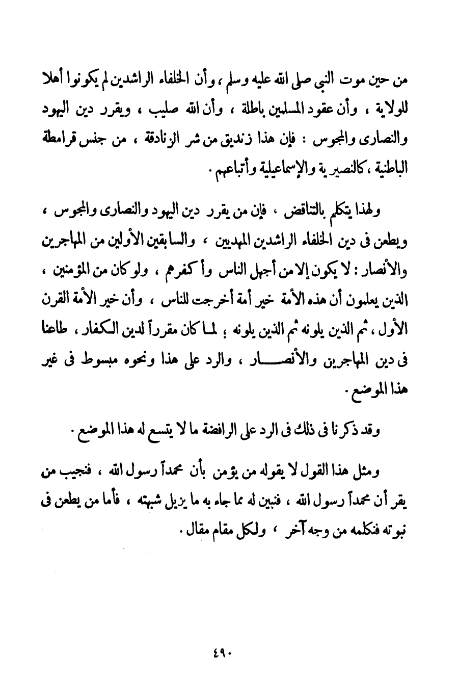 مِنْ حِينِ مَوْتِ النَّبِيِّ صَلَّى اللَّهُ عَلَيْهِ وَسَلَّمَ وَأَنَّ الْخُلَفَاءَ الرَّاشِدِينَ لَمْ يَكُونُوا أَهْلًا لِلْوِلَايَةِ وَأَنَّ عُقُودَ الْمُسْلِمِينَ بَاطِلَةٌ وَأَنَّ اللَّهَ صَلِيبٌ وَيُقَرِّرُ دَيْنَ الْيَهُودِ وَالنَّصَارَى وَالْمَجُوسِ: فَإِنَّ هَذَا زِنْدِيقٌ مِنْ شَرِّ الزَّنَادِقَةِ مِنْ جِنْسِ قَرَامِطَةِ الْبَاطِنِيَّةِ كالْنُصَيْرِيَّة وَالْإسْماعيليَّةِ وَأَتْبَاعِهِمْ. وَلِهَذَا يَتَكَلَّمُ بِالتَّنَاقُضِ فَإِنَّ مَنْ يُقَرِّرُ دَيْنَ الْيَهُودِ وَالنَّصَارَى وَالْمَجُوسِ وَيَطْعَنُ فِي دِينِ الْخُلَفَاءِ الرَّاشِدِينَ الْمَهْدِيِّينَ وَالسَّابِقِينَ الْأَوَّلِينَ مِنْ الْمُهَاجِرِينَ وَالْأَنْصَارِ: لَا يَكُونُ إلَّا مِنْ أَجْهَلِ النَّاسِ وَأَكْفَرِهِمْ وَلَوْ كَانَ مِنْ الْمُؤْمِنِينَ الَّذِينَ يَعْلَمُونَ أَنَّ هَذِهِ الْأُمَّةَ خَيْرُ أُمَّةٍ أُخْرِجَتْ لِلنَّاسِ وَأَنَّ خَيْرَ الْأُمَّةِ الْقَرْنُ الْأَوَّلُ ثُمَّ الَّذِينَ يَلُونَهُ ثُمَّ الَّذِينَ يَلُونَهُ؛ لِمَا كَانَ مُقَرَّرًا لِدِينِ الْكُفَّارِ طَاعِنًا فِي دِينِ الْمُهَاجِرِينَ وَالْأَنْصَارِ وَالرَّدُّ عَلَى هَذَا وَنَحْوِهِ مَبْسُوطٌ فِي غَيْرِ هَذَا الْمَوْضِعِ. وَقَدْ ذَكَرْنَا فِي ذَلِكَ فِي الرَّدِّ عَلَى الرَّافِضَةِ مَا لَا يَتَّسِعُ لَهُ هَذَا الْمَوْضِعُ. وَمِثْلُ هَذَا الْقَوْلِ لَا يَقُولُهُ مَنْ يُؤْمِنُ بِأَنَّ مُحَمَّدًا رَسُولُ اللَّهِ فَنُجِيبُ مَنْ يُقِرُّ أَنَّ مُحَمَّدًا رَسُولُ اللَّهِ فَنُبَيِّنُ لَهُ مِمَّا جَاءَ بِهِ مَا يُزِيلُ شُبْهَتَهُ فَأَمَّا مَنْ يَطْعَنُ فِي نُبُوَّتِهِ فَنُكَلِّمُهُ مِنْ وَجْهٍ آخَرَ وَلِكُلِّ مَقَامٍ مَقَالٌ.