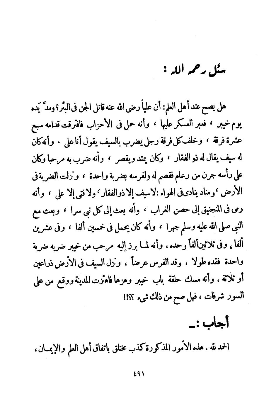 هَلْ يَصِحُّ عِنْدَ أَهْلِ الْعِلْمِ: أَنَّ عَلِيًّا رَضِيَ اللَّهُ عَنْهُ قَاتَلَ الْجِنَّ فِي الْبِئْرِ؟ وَمَدَّ يَدَهُ يَوْمَ خَيْبَرَ فَعَبَرَ الْعَسْكَرُ عَلَيْهَا وَأَنَّهُ حَمَلَ فِي الْأَحْزَابِ فَافْتَرَقَتْ قُدَّامَهُ سَبْعَ عَشْرَةَ فِرْقَةً وَخَلْفَ كُلِّ فِرْقَةٍ رَجُلٌ يَضْرِبُ بِالسَّيْفِ يَقُولُ أَنَا عَلِيٌّ وَأَنَّهُ كَانَ لَهُ سَيْفٌ يُقَالُ لَهُ ذُو الْفَقَارِ وَكَانَ يَمْتَدُّ وَيَقْصُرُ وَأَنَّهُ ضَرَبَ بِهِ مَرْحَبًا وَكَانَ عَلَى رَأْسِهِ جُرْنٌ مِنْ رُخَامٍ فَقُصِمَ لَهُ وَلِفَرَسِهِ بِضَرْبَةٍ وَاحِدَةٍ وَنَزَلَتْ الضَّرْبَةُ فِي الْأَرْضِ وَمُنَادٍ يُنَادِي فِي الْهَوَاءِ: لَا سَيْفَ إلَّا ذُو الْفَقَارِ وَلَا فَتًى إلَّا عَلِيٌّ وَأَنَّهُ رَمَى فِي الْمَنْجَنِيقِ إلَى حِصْنِ الْغُرَابِ وَأَنَّهُ بُعِثَ إلَى كُلِّ نَبِيٍّ سِرًّا وَبُعِثَ مَعَ النَّبِيِّ صَلَّى اللَّهُ عَلَيْهِ وَسَلَّمَ جَهْرًا وَأَنَّهُ كَانَ يَحْمِلُ فِي خَمْسِينَ أَلْفًا وَفِي عِشْرِينَ أَلْفًا وَفِي ثَلَاثِينَ أَلْفًا وَحْدَهُ وَأَنَّهُ لَمَّا بَرَزَ إلَيْهِ مَرْحَبٌ مِنْ خَيْبَرَ ضَرَبَهُ ضَرْبَةً وَاحِدَةً فَقَدَّهُ طُولًا وَقَدَّ الْفَرَسَ عَرْضًا وَنَزَلَ السَّيْفُ فِي الْأَرْضِ ذِرَاعَيْنِ أَوْ ثَلَاثَةً وَأَنَّهُ مَسَكَ حَلْقَةَ بَابِ خَيْبَرَ وَهَزَّهَا فَاهْتَزَّتْ الْمَدِينَةُ وَوَقَعَ مِنْ عَلَى السُّورِ شُرُفَاتٌ فَهَلْ صَحَّ مِنْ ذَلِكَ شَيْءٌ