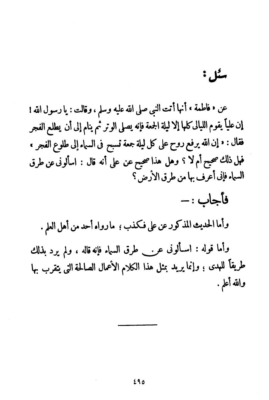 عَنْ " {فَاطِمَةَ أَنَّهَا أَتَتْ النَّبِيَّ صَلَّى اللَّهُ عَلَيْهِ وَسَلَّمَ وَقَالَتْ: يَا رَسُولَ اللَّهِ إنَّ عَلِيًّا يَقُومُ اللَّيَالِيَ كُلَّهَا إلَّا لَيْلَةَ الْجُمْعَةِ فَإِنَّهُ يُصَلِّي الْوِتْرَ ثُمَّ يَنَامُ إلَى أَنْ يَطْلُعَ الْفَجْرُ فَقَالَ: إنَّ اللَّهَ يَرْفَعُ رُوحَ عَلِيٍّ كُلَّ لَيْلَةِ جُمْعَةٍ تُسَبِّحُ فِي السَّمَاءِ إلَى طُلُوعِ الْفَجْرِ} " فَهَلْ ذَلِكَ صَحِيحٌ أَمْ لَا؟ وَهَلْ هَذَا صَحِيحٌ عَنْ عَلِيٍّ أَنَّهُ قَالَ: اسْأَلُونِي عَنْ طُرُقِ السَّمَاءِ فَإِنِّي أَعْرِفُ بِهَا مِنْ طُرُقِ الْأَرْضِ؟