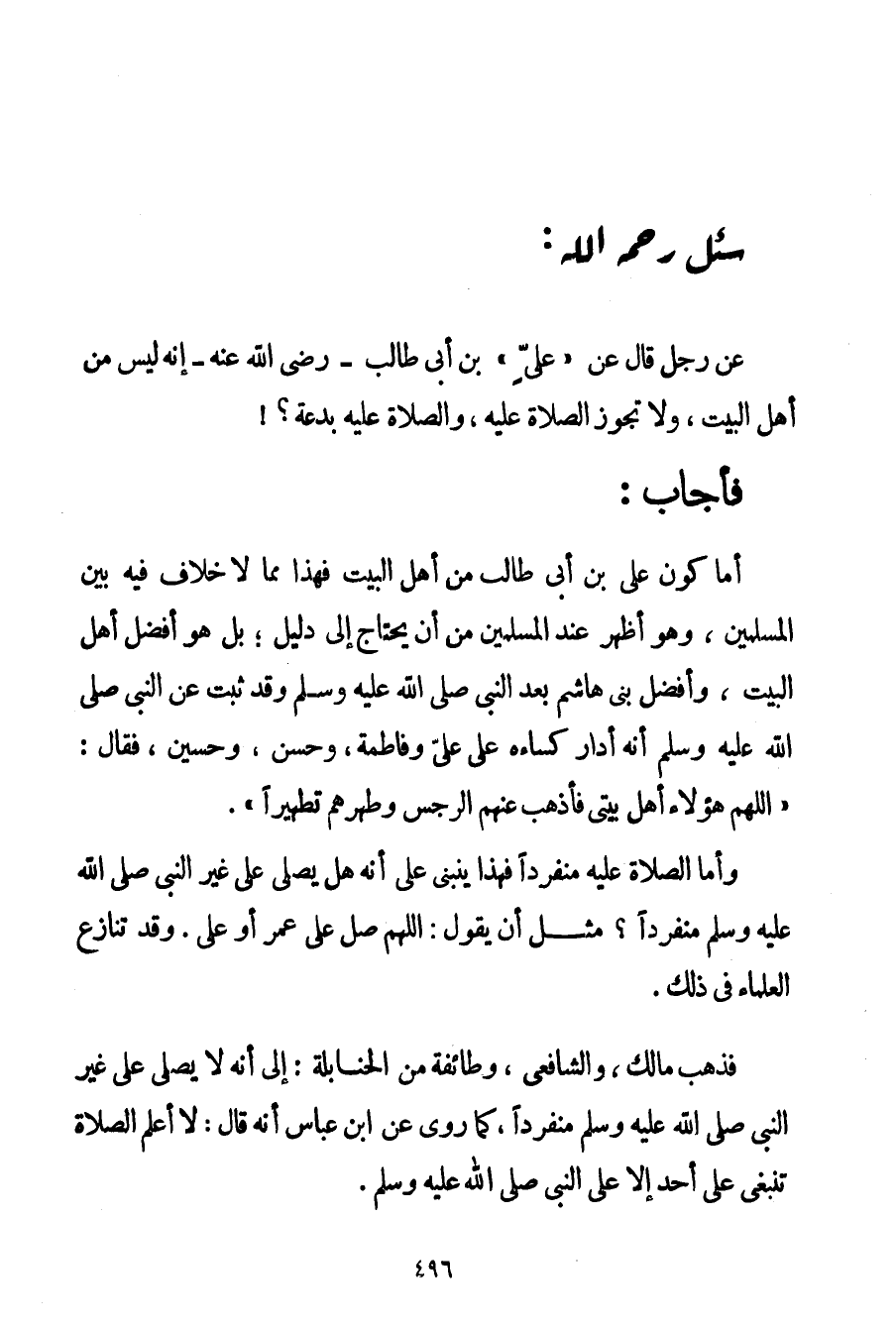 أَمَّا كَوْنُ عَلِيِّ بْنِ أَبِي طَالِبٍ مِنْ أَهْلِ الْبَيْتِ فَهَذَا مِمَّا لَا خِلَافَ فِيهِ بَيْنَ الْمُسْلِمِينَ وَهُوَ أَظْهَرُ عِنْدَ الْمُسْلِمِينَ مِنْ أَنْ يَحْتَاجَ إلَى دَلِيلٍ؛ بَلْ هُوَ أَفْضَلُ أَهْلِ الْبَيْتِ وَأَفْضَلُ بَنِي هَاشِمٍ بَعْدَ النَّبِيِّ صَلَّى اللَّهُ عَلَيْهِ وَسَلَّمَ وَقَدْ ثَبَتَ {عَنْ النَّبِيِّ صَلَّى اللَّهُ عَلَيْهِ وَسَلَّمَ أَنَّهُ أَدَارَ كِسَاءَهُ عَلَى عَلِيٍّ وَفَاطِمَةَ وَحَسَنٍ وَحُسَيْنٍ فَقَالَ: اللَّهُمَّ هَؤُلَاءِ أَهْلُ بَيْتِي فَأَذْهِبْ عَنْهُمْ الرِّجْسَ وَطَهِّرْهُمْ تَطْهِيرًا} ". وَأَمَّا الصَّلَاةُ عَلَيْهِ مُنْفَرِدًا فَهَذَا يَنْبَنِي عَلَى أَنَّهُ هَلْ يُصَلَّى عَلَى غَيْرِ النَّبِيِّ صَلَّى اللَّهُ عَلَيْهِ وَسَلَّمَ مُنْفَرِدًا؟ مِثْلَ أَنْ يَقُولَ: اللَّهُمَّ صَلِّ عَلَى عُمَرَ أَوْ عَلِيٍّ. وَقَدْ تَنَازَعَ الْعُلَمَاءُ فِي ذَلِكَ. فَذَهَبَ مَالِكٌ وَالشَّافِعِيُّ وَطَائِفَةٌ مِنْ الْحَنَابِلَةِ: إلَى أَنَّهُ لَا يُصَلَّى عَلَى غَيْرِ النَّبِيِّ صَلَّى اللَّهُ عَلَيْهِ وَسَلَّمَ مُنْفَرِدًا كَمَا رُوِيَ عَنْ ابْنِ عَبَّاسٍ أَنَّهُ قَالَ: لَا أَعْلَمُ الصَّلَاةَ تَنْبَغِي عَلَى أَحَدٍ إلَّا عَلَى النَّبِيِّ صَلَّى اللَّهُ عَلَيْهِ وَسَلَّمَ.