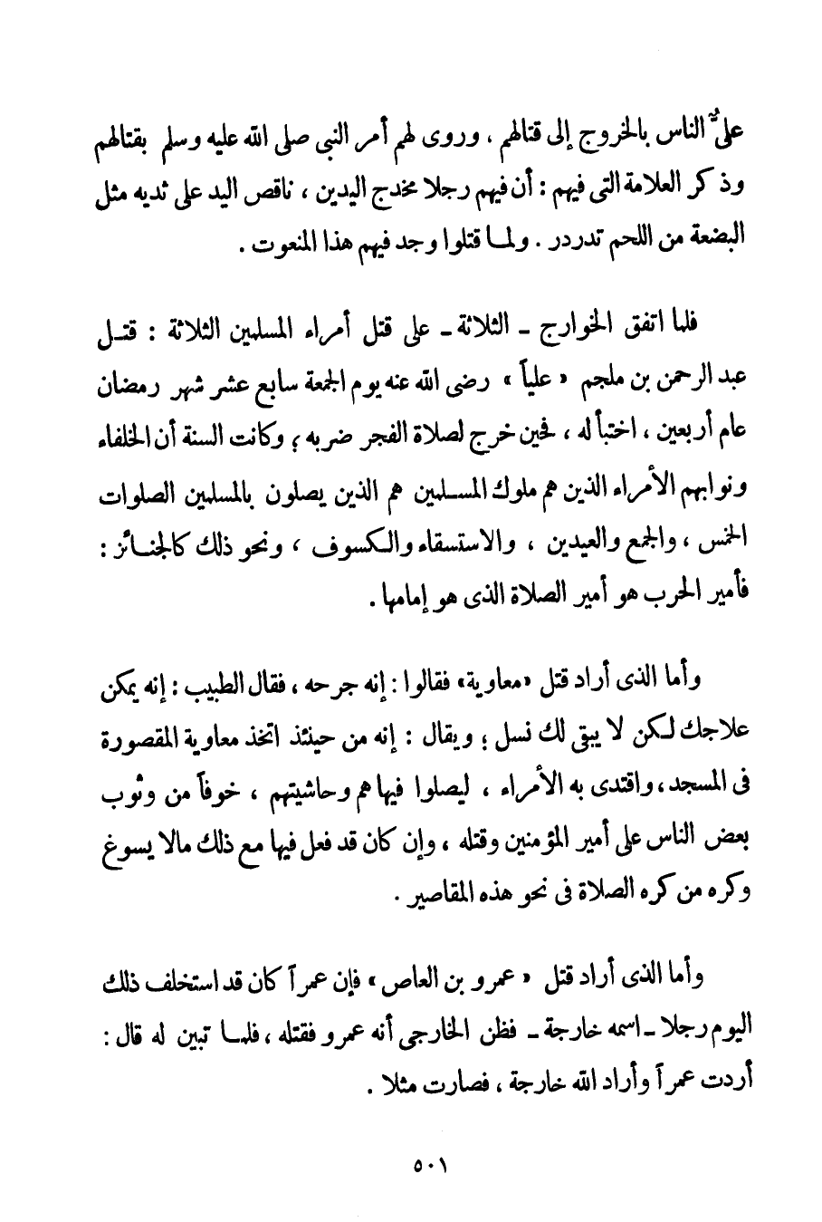 عَلِيٌّ النَّاسَ بِالْخُرُوجِ إلَى قِتَالِهِمْ وَرَوَى لَهُمْ أَمْرَ النَّبِيِّ صَلَّى اللَّهُ عَلَيْهِ وَسَلَّمَ بِقِتَالِهِمْ وَذَكَرَ الْعَلَامَةَ الَّتِي فِيهِمْ: أَنَّ فِيهِمْ رَجُلًا مُخَدَّجَ الْيَدَيْنِ نَاقِصَ الْيَدِ عَلَى ثَدْيِهِ مِثْلُ الْبَضْعَةِ مِنْ اللَّحْمِ تَدَرْدُرُ. وَلَمَّا قُتِلُوا وُجِدَ فِيهِمْ هَذَا الْمَنْعُوتُ. فَلَمَّا اتَّفَقَ الْخَوَارِجُ - الثَّلَاثَةُ - عَلَى قَتْلِ أُمَرَاءِ الْمُسْلِمِينَ الثَّلَاثَةِ: قَتَلَ عَبْدُ الرَّحْمَنِ بْنُ مُلْجِمٍ " عَلِيًّا " رَضِيَ اللَّهُ عَنْهُ يَوْمَ الْجُمْعَةِ سَابِعَ عَشَرَ شَهْرَ رَمَضَانَ عَامَ أَرْبَعِينَ اخْتَبَأَ لَهُ فَحِينَ خَرَجَ لِصَلَاةِ الْفَجْرَ ضَرَبَهُ؛ وَكَانَتْ السُّنَّةُ أَنَّ الْخُلَفَاءَ وَنُوَّابَهُمْ الْأُمَرَاءَ الَّذِينَ هُمْ مُلُوكُ الْمُسْلِمِينَ هُمْ الَّذِينَ يُصَلُّونَ بِالْمُسْلِمِينَ الصَّلَوَاتِ الْخَمْسَ وَالْجُمَعَ وَالْعِيدَيْنِ وَالِاسْتِسْقَاءَ وَالْكُسُوفَ وَنَحْوَ ذَلِكَ كَالْجَنَائِزِ: فَأَمِيرُ الْحَرْبِ هُوَ أَمِيرُ الصَّلَاةِ الَّذِي هُوَ إمَامُهَا. وَأَمَّا الَّذِي أَرَادَ قَتْلَ " مُعَاوِيَةَ " فَقَالُوا: إنَّهُ جَرَحَهُ فَقَالَ الطَّبِيبُ: إنَّهُ يُمْكِنُ عِلَاجُك لَكِنْ لَا يَبْقَى لَك نَسْلٌ؛ وَيُقَالُ: إنَّهُ مِنْ حِينَئِذٍ اتَّخَذَ مُعَاوِيَةُ الْمَقْصُورَةَ فِي الْمَسْجِدِ وَاقْتَدَى بِهِ الْأُمَرَاءُ لِيُصَلُّوا فِيهَا هُمْ وَحَاشِيَتُهُمْ خَوْفًا مِنْ وُثُوبِ بَعْضِ النَّاسِ عَلَى أَمِيرِ الْمُؤْمِنِينَ وَقَتْلِهِ وَإِنْ كَانَ قَدْ فُعِلَ فِيهَا مَعَ ذَلِكَ مَا لَا يَسُوغُ وَكَرِهَ مَنْ كَرِهَ الصَّلَاةَ فِي نَحْوِ هَذِهِ الْمَقَاصِيرِ. وَأَمَّا الَّذِي أَرَادَ قَتْلَ " عَمْرَو بْنَ العاص " فَإِنَّ عَمْرًا كَانَ قَدْ اسْتَخْلَفَ ذَلِكَ الْيَوْمَ رَجُلًا - اسْمُهُ خَارِجَةُ - فَظَنَّ الْخَارِجِيُّ أَنَّهُ عَمْرٌو فَقَتَلَهُ فَلَمَّا تَبَيَّنَ لَهُ قَالَ: أَرَدْت عَمْرًا وَأَرَادَ اللَّهُ خَارِجَةَ فَصَارَتْ مَثَلًا.