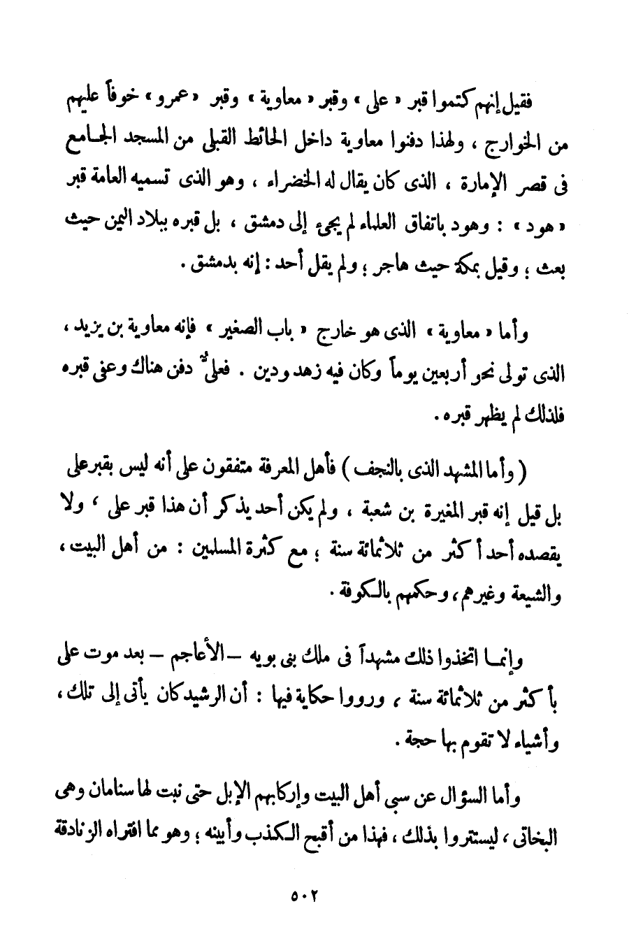 فَقِيلَ إنَّهُمْ كَتَمُوا قَبْرَ " عَلِيٍّ " وَقَبْرَ " مُعَاوِيَةَ " وَقَبْرَ " عَمْرٍو " خَوْفًا عَلَيْهِمْ مِنْ الْخَوَارِجِ وَلِهَذَا دَفَنُوا مُعَاوِيَةَ دَاخِلَ الْحَائِطِ الْقِبْلِيِّ مِنْ الْمَسْجِدِ الْجَامِعِ فِي قَصْرِ الْإِمَارَةِ الَّذِي كَانَ يُقَالُ لَهُ الْخَضْرَاءُ وَهُوَ الَّذِي تُسَمِّيهِ الْعَامَّةُ قَبْرَ " هُودٍ ": وَهُودٌ بِاتِّفَاقِ الْعُلَمَاءِ لَمْ يَجِئْ إلَى دِمَشْقَ بَلْ قَبْرُهُ بِبِلَادِ الْيَمَنِ حَيْثُ بُعِثَ؛ وَقِيلَ بِمَكَّةَ حَيْثُ هَاجَرَ؛ وَلَمْ يَقُلْ أَحَدٌ: إنَّهُ بِدِمَشْقَ. وَأَمَّا " مُعَاوِيَةُ " الَّذِي هُوَ خَارِجُ " بَابِ الصَّغِيرِ " فَإِنَّهُ مُعَاوِيَةُ بْنُ يَزِيدَ الَّذِي تَوَلَّى نَحْوَ أَرْبَعِينَ يَوْمًا وَكَانَ فِيهِ زُهْدٌ وَدِينٌ. فَعَلِيٌّ دُفِنَ هُنَاكَ وَعَفَا قَبْرُهُ فَلِذَلِكَ لَمْ يَظْهَرْ قَبْرُهُ. وَأَمَّا الْمَشْهَدُ الَّذِي بِالنَّجَفِ فَأَهْلُ الْمَعْرِفَةِ مُتَّفِقُونَ عَلَى أَنَّهُ لَيْسَ بِقَبْرِ عَلِيٍّ بَلْ قِيلَ إنَّهُ قَبْرُ الْمُغِيرَةِ بْنِ شُعْبَةَ وَلَمْ يَكُنْ أَحَدٌ يَذْكُرُ أَنَّ هَذَا قَبْرُ عَلِيٍّ وَلَا يَقْصِدُهُ أَحَدٌ أَكْثَرَ مِنْ ثَلَاثِمِائَةِ سَنَةٍ؛ مَعَ كَثْرَةِ الْمُسْلِمِينَ: مِنْ أَهْلِ الْبَيْتِ وَالشِّيعَةِ وَغَيْرِهِمْ وَحُكْمِهِمْ بِالْكُوفَةِ. وَإِنَّمَا اتَّخَذُوا ذَلِكَ مَشْهَدًا فِي مُلْكِ بَنِي بويه - الْأَعَاجِمِ - بَعْدَ مَوْتِ عَلِيٍّ بِأَكْثَرَ مِنْ ثَلَاثِمِائَةِ سَنَةٍ وَرَوَوْا حِكَايَةً فِيهَا: أَنَّ الرَّشِيدَ كَانَ يَأْتِي إلَى تِلْكَ وَأَشْيَاءَ لَا تَقُومُ بِهَا حُجَّةٌ.