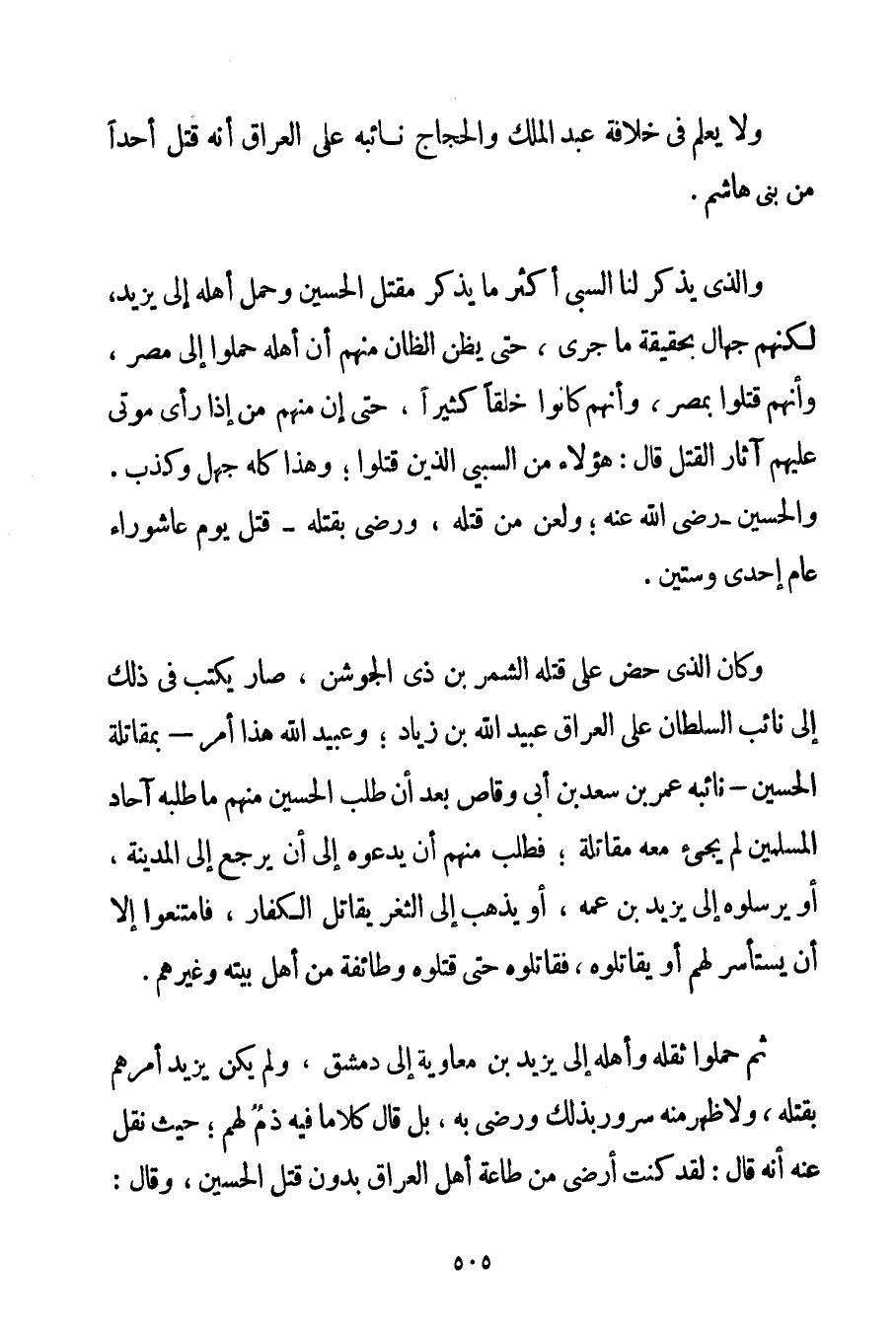 وَلَا يُعْلَمُ فِي خِلَافَةِ عَبْدِ الْمَلِكِ وَالْحَجَّاجِ نَائِبُهُ عَلَى الْعِرَاقِ أَنَّهُ قَتَلَ أَحَدًا مِنْ بَنِي هَاشِمٍ. وَاَلَّذِي يُذْكَرُ لَنَا السَّبْيُ أَكْثَرُ مَا يُذْكَرُ مَقْتَلُ الْحُسَيْنِ وَحَمْلُ أَهْلِهِ إلَى يَزِيدَ لَكِنَّهُمْ جُهَّالٌ بِحَقِيقَةِ مَا جَرَى حَتَّى يَظُنَّ الظَّانُّ مِنْهُمْ أَنَّ أَهْلَهُ حُمِلُوا إلَى مِصْرَ وَأَنَّهُمْ قُتِلُوا بِمِصْرِ وَأَنَّهُمْ كَانُوا خَلْقًا كَثِيرًا حَتَّى إنَّ مِنْهُمْ مَنْ إذَا رَأَى مَوْتَى عَلَيْهِمْ آثَارُ الْقَتْلِ قَالَ: هَؤُلَاءِ مِنْ السَّبْيِ الَّذِينَ قُتِلُوا؛ وَهَذَا كُلُّهُ جَهْلٌ وَكَذِبٌ. وَالْحُسَيْنُ - رَضِيَ اللَّهُ عَنْهُ وَلُعِنَ مَنْ قَتَلَهُ وَرَضِيَ بِقَتْلِهِ - قُتِلَ يَوْمَ عَاشُورَاءَ عَامَ وَاحِدٍ وَسِتِّينَ.