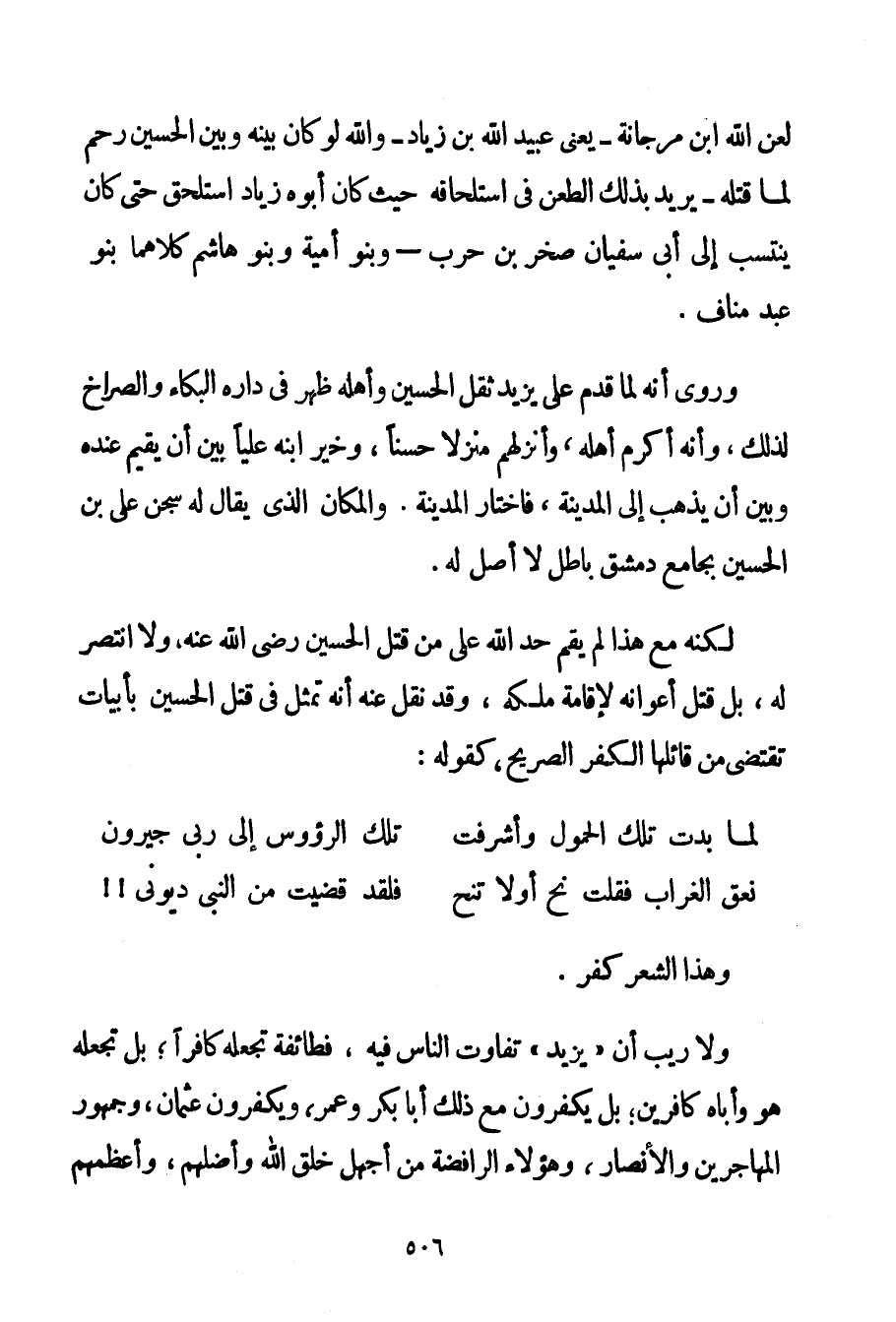 وَلَا رَيْبَ أَنَّ " يَزِيدَ " تَفَاوَتَ النَّاسُ فِيهِ فَطَائِفَةٌ تَجْعَلُهُ كَافِرًا؛ بَلْ تَجْعَلُهُ هُوَ وَأَبَاهُ كَافِرَيْنِ؛ بَلْ يُكَفِّرُونَ مَعَ ذَلِكَ أَبَا بَكْرٍ وَعُمَرَ وَيُكَفِّرُونَ عُثْمَانَ وَجُمْهُورَ الْمُهَاجِرِينَ وَالْأَنْصَارِ وَهَؤُلَاءِ الرَّافِضَةُ مِنْ أَجْهَلِ خَلْقِ اللَّهِ وَأَضَلِّهِمْ وَأَعْظَمِهِمْ