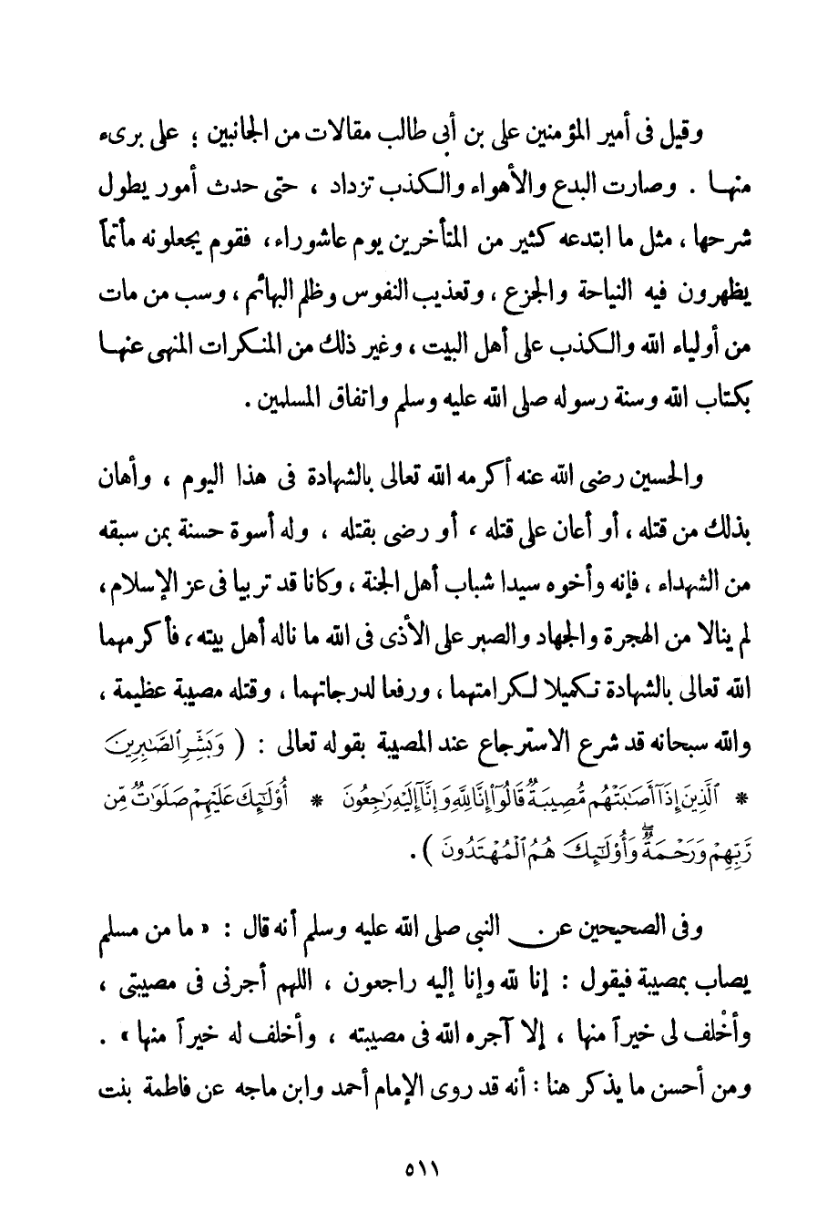 وَقِيلَ فِي أَمِيرِ الْمُؤْمِنِينَ عَلِيِّ بْنِ أَبِي طَالِبٍ مَقَالَاتٍ مِنْ الْجَانِبَيْنِ؛ عَلِيٌّ بَرِيءٌ مِنْهَا. وَصَارَتْ الْبِدَعُ وَالْأَهْوَاءُ وَالْكَذِبُ تَزْدَادُ حَتَّى حَدَثَ أُمُورٌ يَطُولُ شَرْحُهَا، مِثْلُ مَا ابْتَدَعَهُ كَثِيرٌ مِنْ الْمُتَأَخِّرِينَ يَوْمَ عَاشُورًا فَقَوْمٌ يَجْعَلُونَهُ مَأْتَمًا يُظْهِرُونَ فِيهِ النِّيَاحَةَ وَالْجَزَعَ وَتَعْذِيبَ النُّفُوسِ وَظُلْمَ الْبَهَائِمِ وَسَبَّ مَنْ مَاتَ مِنْ أَوْلِيَاءِ اللَّهِ وَالْكَذِبَ عَلَى أَهْلِ الْبَيْتِ وَغَيْرَ ذَلِكَ مِنْ الْمُنْكَرَاتِ الْمَنْهِيِّ عَنْهَا بِكِتَابِ اللَّهِ وَسُنَّةِ رَسُولِهِ صَلَّى اللَّهُ عَلَيْهِ وَسَلَّمَ وَاتِّفَاقِ الْمُسْلِمِينَ. وَالْحُسَيْنِ رَضِيَ اللَّهُ عَنْهُ أَكْرَمَهُ اللَّهُ تَعَالَى بِالشَّهَادَةِ فِي هَذَا الْيَوْمِ وَأَهَانَ بِذَلِكَ مَنْ قَتَلَهُ أَوْ أَعَانَ عَلَى قَتْلِهِ أَوْ رَضِيَ بِقَتْلِهِ وَلَهُ أُسْوَةٌ حَسَنَةٌ بِمَنْ سَبَقَهُ مِنْ الشُّهَدَاءِ فَإِنَّهُ وَأَخُوهُ سَيِّدَا شَبَابِ أَهْلِ الْجَنَّةِ وَكَانَا قَدْ تَرَبَّيَا فِي عِزِّ الْإِسْلَامِ لَمْ يَنَالَا مِنْ الْهِجْرَةِ وَالْجِهَادِ وَالصَّبْرِ عَلَى الْأَذَى فِي اللَّهِ مَا نَالَهُ أَهْلُ بَيْتِهِ فَأَكْرَمَهُمَا اللَّهُ تَعَالَى بِالشَّهَادَةِ تَكْمِيلًا لِكَرَامَتِهِمَا وَرَفْعًا لِدَرَجَاتِهِمَا وَقَتْلُهُ مُصِيبَةٌ عَظِيمَةٌ وَاَللَّهُ سُبْحَانَهُ قَدْ شَرَعَ الِاسْتِرْجَاعَ عِنْدَ الْمُصِيبَةِ بِقَوْلِهِ تَعَالَى: {وَبَشِّرِ الصَّابِرِينَ} {الَّذِينَ إذَا أَصَابَتْهُمْ مُصِيبَةٌ قَالُوا إنَّا لِلَّهِ وَإِنَّا إلَيْهِ رَاجِعُونَ} {أُولَئِكَ عَلَيْهِمْ صَلَوَاتٌ مِنْ رَبِّهِمْ وَرَحْمَةٌ وَأُولَئِكَ هُمُ الْمُهْتَدُونَ} . وَفِي الصَّحِيحَيْنِ عَنْ النَّبِيِّ صَلَّى اللَّهُ عَلَيْهِ وَسَلَّمَ أَنَّهُ قَالَ: " {مَا مِنْ مُسْلِمٍ يُصَابُ بِمُصِيبَةٍ فَيَقُولُ: إنَّا لِلَّهِ وَإِنَّا إلَيْهِ رَاجِعُونَ اللَّهُمَّ أَجِرْنِي فِي مُصِيبَتِي واخلف لِي خَيْرًا مِنْهَا إلَّا آجَرَهُ اللَّهُ فِي مُصِيبَتِهِ واخلف لَهُ خَيْرًا مِنْهَا} ". وَمِنْ أَحْسَنِ مَا يُذْكَرُ هُنَا: أَنَّهُ قَدْ رَوَى الْإِمَامُ أَحْمَد وَابْنُ مَاجَه عَنْ فَاطِمَةَ بِنْتِ