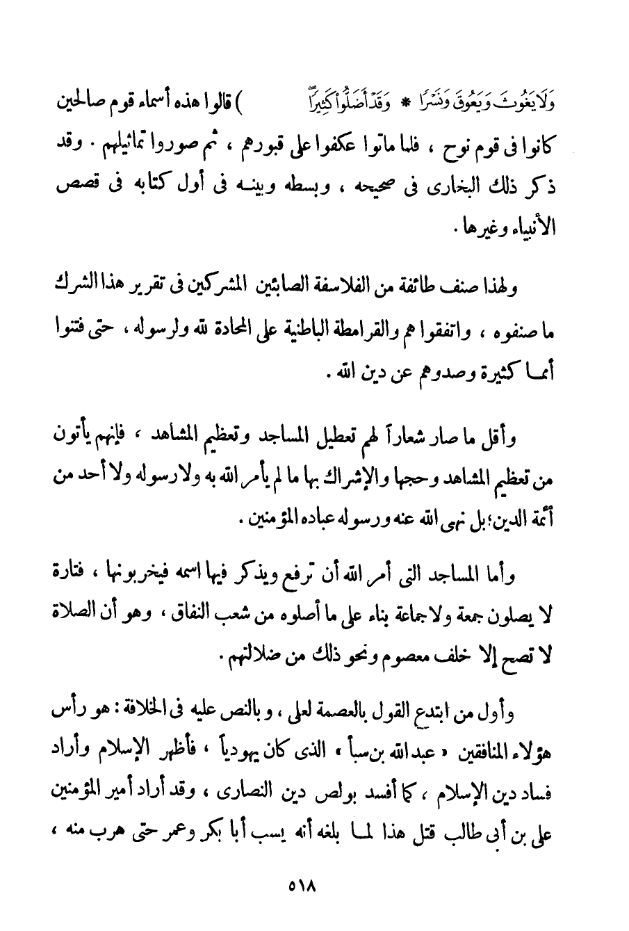وَلَا يَغُوثَ وَيَعُوقَ وَنَسْرًا} {وَقَدْ أَضَلُّوا كَثِيرًا} قَالُوا هَذِهِ أَسْمَاءُ قَوْمٍ صَالِحِينَ كَانُوا فِي قَوْمِ نُوحٍ فَلَمَّا مَاتُوا عَكَفُوا عَلَى قُبُورِهِمْ ثُمَّ صَوَّرُوا تَمَاثِيلَهُمْ. وَقَدْ ذَكَرَ ذَلِكَ الْبُخَارِيُّ فِي صَحِيحِهِ وَبَسَطَهُ وَبَيَّنَهُ فِي أَوَّلِ كِتَابِهِ فِي قَصَصِ الْأَنْبِيَاءِ وَغَيْرِهَا. وَلِهَذَا صَنَّفَ طَائِفَةٌ مِنْ الْفَلَاسِفَةِ الصَّابِئِينَ الْمُشْرِكِينَ فِي تَقْرِيرِ هَذَا الشِّرْكِ مَا صَنَّفُوهُ وَاتَّفَقُوا هُمْ وَالْقَرَامِطَةُ الْبَاطِنِيَّةُ عَلَى الْمُحَادَّةِ لِلَّهِ وَلِرَسُولِهِ حَتَّى فَتَنُوا أُمَمًا كَثِيرَةً وَصَدُّوهُمْ عَنْ دِينِ اللَّهِ. وَأَقَلُّ مَا صَارَ شِعَارًا لَهُمْ تَعْطِيلُ الْمَسَاجِدِ وَتَعْظِيمُ الْمَشَاهِدِ فَإِنَّهُمْ يَأْتُونَ مِنْ تَعْظِيمِ الْمَشَاهِدِ وَحَجِّهَا وَالْإِشْرَاكِ بِهَا مَا لَمْ يَأْمُرْ اللَّهُ بِهِ وَلَا رَسُولُهُ وَلَا أَحَدٌ مِنْ أَئِمَّةِ الدِّينِ؛ بَلْ نَهَى اللَّهُ عَنْهُ وَرَسُولُهُ عِبَادَهُ الْمُؤْمِنِينَ. وَأَمَّا الْمَسَاجِدُ الَّتِي أَمَرَ اللَّهُ أَنْ تُرْفَعَ وَيُذْكَرَ فِيهَا اسْمُهُ فَيُخَرِّبُونَهَا فَتَارَةً لَا يُصَلُّونَ جُمْعَةً وَلَا جَمَاعَةً بِنَاءً عَلَى مَا أَصَّلُوهُ مِنْ شُعَبِ النِّفَاقِ وَهُوَ أَنَّ الصَّلَاةَ لَا تَصِحُّ إلَّا خَلْفَ مَعْصُومٍ وَنَحْوَ ذَلِكَ مِنْ ضَلَالَتِهِمْ. وَأَوَّلُ مَنْ ابْتَدَعَ الْقَوْلَ بِالْعِصْمَةِ لِعَلِيِّ وَبِالنَّصِّ عَلَيْهِ فِي الْخِلَافَةِ: هُوَ رَأْسُ هَؤُلَاءِ الْمُنَافِقِينَ " عَبْدُ اللَّهِ بْنُ سَبَأٍ " الَّذِي كَانَ يَهُودِيًّا فَأَظْهَرَ الْإِسْلَامَ وَأَرَادَ فَسَادَ دِينِ الْإِسْلَامِ كَمَا أَفْسَدَ بولص دِينَ النَّصَارَى وَقَدْ أَرَادَ أَمِيرُ الْمُؤْمِنِينَ عَلِيُّ بْنُ أَبِي طَالِبٍ قَتْلَ هَذَا لِمَا بَلَغَهُ أَنَّهُ يَسُبُّ أَبَا بَكْر وَعُمَر حَتَّى هَرَبَ مِنْهُ