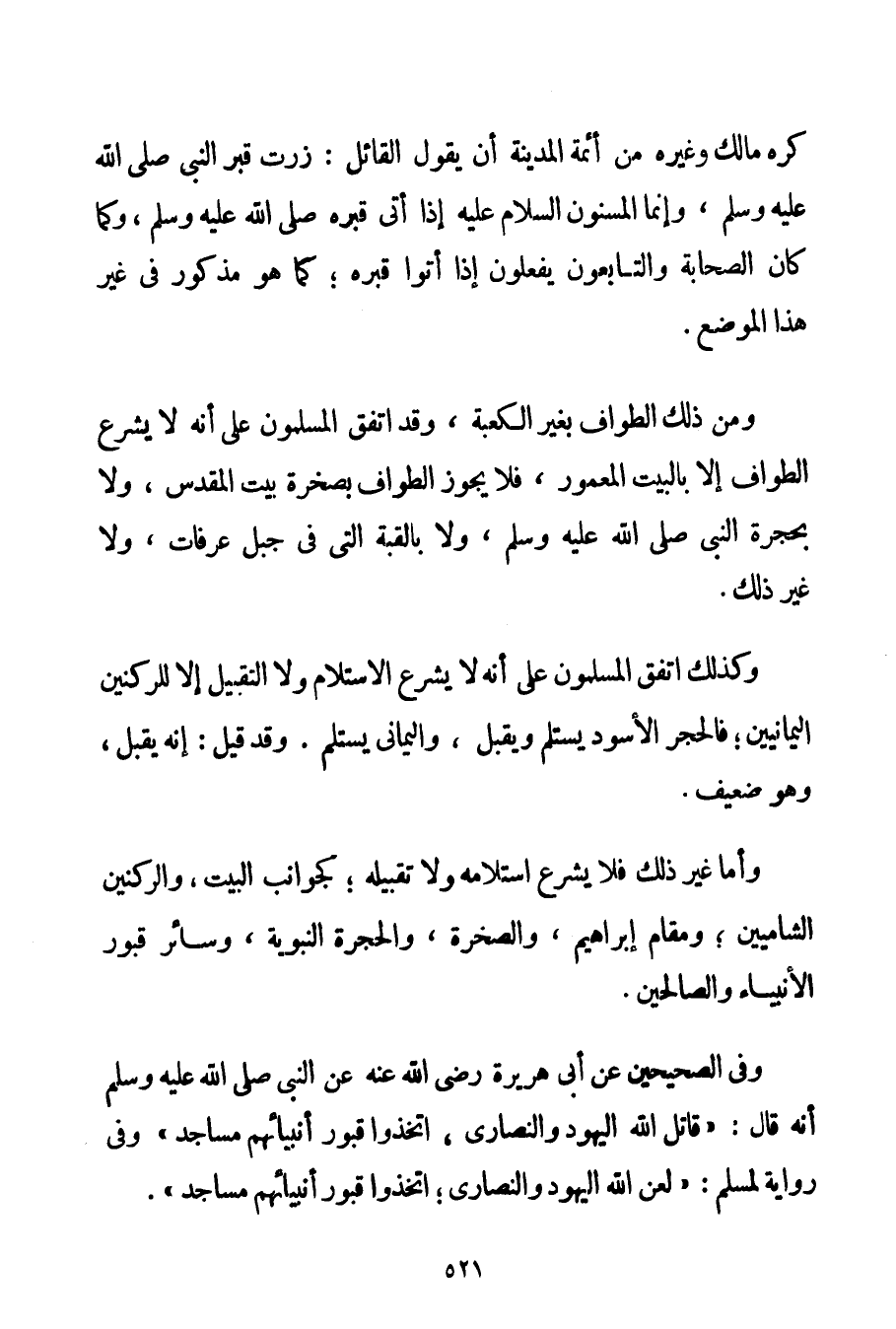 كَرِهَ مَالِك وَغَيْرُهُ مِنْ أَئِمَّةِ الْمَدِينَةِ أَنْ يَقُولَ الْقَائِلُ: زُرْت قَبْرَ النَّبِيِّ صَلَّى اللَّهُ عَلَيْهِ وَسَلَّمَ وَإِنَّمَا الْمُسِنُّونَ السَّلَامَ عَلَيْهِ إذَا أَتَى قَبْرُهُ صَلَّى اللَّهُ عَلَيْهِ وَسَلَّمَ وَكَمَا كَانَ الصَّحَابَةُ وَالتَّابِعُونَ يَفْعَلُونَ إذَا أَتَوْا قَبْرَهُ؛ كَمَا هُوَ مَذْكُورٌ فِي غَيْرِ هَذَا الْمَوْضِعِ. وَمِنْ ذَلِكَ الطَّوَافُ بِغَيْرِ الْكَعْبَةِ وَقَدْ اتَّفَقَ الْمُسْلِمُونَ عَلَى أَنَّهُ لَا يَشْرَعُ الطَّوَافُ إلَّا بِالْبَيْتِ الْمَعْمُورِ فَلَا يَجُوزُ الطَّوَافُ بِصَخْرَةِ بَيْتِ الْمَقْدِسِ وَلَا بِحُجْرَةِ النَّبِيِّ صَلَّى اللَّهُ عَلَيْهِ وَسَلَّمَ وَلَا بِالْقُبَّةِ الَّتِي فِي جَبَلِ عَرَفَاتٍ وَلَا غَيْرِ ذَلِكَ. وَكَذَلِكَ اتَّفَقَ الْمُسْلِمُونَ عَلَى أَنَّهُ لَا يُشْرَعُ الِاسْتِلَامُ وَلَا التَّقْبِيلُ إلَّا لِلرُّكْنَيْنِ الْيَمَانِيَّيْنِ؛ فَالْحَجَرُ الْأَسْوَدُ يُسْتَلَمُ وَيُقَبَّلُ وَالْيَمَانِيُّ يُسْتَلَمُ. وَقَدْ قِيلَ: إنَّهُ يُقَبَّلُ وَهُوَ ضَعِيفٌ. وَأَمَّا غَيْرُ ذَلِكَ فَلَا يُشْرَعُ اسْتِلَامُهُ وَلَا تَقْبِيلُهُ؛ كَجَوَانِبِ الْبَيْتِ وَالرُّكْنَيْنِ الشَّامِيَّيْنِ؛ وَمَقَامِ إبْرَاهِيمَ وَالصَّخْرَةِ وَالْحُجْرَةِ النَّبَوِيَّةِ وَسَائِرِ قُبُورِ الْأَنْبِيَاءِ وَالصَّالِحِينَ. وَفِي الصَّحِيحَيْنِ عَنْ أَبِي هُرَيْرَةَ رَضِيَ اللَّهُ عَنْهُ عَنْ النَّبِيِّ صَلَّى اللَّهُ عَلَيْهِ وَسَلَّمَ أَنَّهُ قَالَ: " {قَاتَلَ اللَّهُ الْيَهُودَ وَالنَّصَارَى اتَّخَذُوا قُبُورَ أَنْبِيَائِهِمْ مَسَاجِدَ} " وَفِي رِوَايَةٍ لِمُسْلِمِ: " {لَعَنَ اللَّهُ الْيَهُودَ وَالنَّصَارَى؛ اتَّخَذُوا قُبُورَ أَنْبِيَائِهِمْ مَسَاجِدَ} "