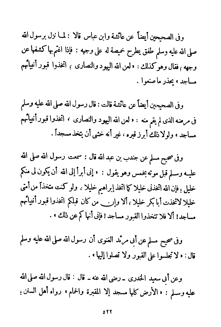 وَفِي الصَّحِيحَيْنِ أَيْضًا عَنْ عَائِشَةَ وَابْنِ عَبَّاسٍ قَالَا: {لَمَّا نَزَلَ بِرَسُولِ اللَّهِ صَلَّى اللَّهُ عَلَيْهِ وَسَلَّمَ طَفِقَ يَطْرَحُ خَمِيصَةً لَهُ عَلَى وَجْهِهِ: فَإِذَا اغْتَمَّ بِهَا كَشَفَهَا عَنْهُ وَجْهُهُ؛ فَقَالَ وَهُوَ كَذَلِكَ: لَعَنَ اللَّهُ الْيَهُودَ وَالنَّصَارَى؛ اتَّخَذُوا قُبُورَ أَنْبِيَائِهِمْ مَسَاجِدَ} " يُحَذِّرُ مَا صَنَعُوا. وَفِي الصَّحِيحَيْنِ أَيْضًا عَنْ عَائِشَةَ قَالَتْ: قَالَ رَسُولُ اللَّهِ صَلَّى اللَّهُ عَلَيْهِ وَسَلَّمَ فِي مَرَضِهِ الَّذِي لَمْ يَقُمْ مِنْهُ: " {لَعَنَ اللَّهُ الْيَهُودَ وَالنَّصَارَى اتَّخَذُوا قُبُورَ أَنْبِيَائِهِمْ مَسَاجِدَ} وَلَوْلَا ذَلِكَ أُبْرِزَ قَبْرُهُ غَيْرَ أَنَّهُ خَشِيَ أَنْ يُتَّخَذَ مَسْجِدًا. وَفِي صَحِيحِ مُسْلِمٍ عَنْ جُنْدُبِ بْنِ عَبْدِ اللَّهِ قَالَ: {سَمِعْت رَسُولَ اللَّهِ صَلَّى اللَّهُ عَلَيْهِ وَسَلَّمَ قَبْلَ مَوْتِهِ بِخَمْسِ وَهُوَ يَقُولُ: إنِّي أَبْرَأُ إلَى اللَّهِ أَنْ يَكُونَ لِي مِنْكُمْ خَلِيلٌ؛ فَإِنَّ اللَّهَ اتَّخَذَنِي خَلِيلًا كَمَا اتَّخَذَ إبْرَاهِيمَ خَلِيلًا وَلَوْ كُنْت مُتَّخِذًا مِنْ أُمَّتِي خَلِيلًا لَاِتَّخَذْت أَبَا بَكْر خَلِيلًا أَلَا وَإِنَّ مَنْ كَانَ قَبْلَكُمْ اتَّخَذُوا قُبُورَ أَنْبِيَائِهِمْ مَسَاجِدَ أَلَا فَلَا تَتَّخِذُوا الْقُبُورَ مَسَاجِدَ فَإِنِّي أَنْهَاكُمْ عَنْ ذَلِكَ} ". وَفِي صَحِيحِ مُسْلِمٍ عَنْ أَبِي مَرْثَدٍ الغنوي أَنَّ رَسُولَ اللَّهِ صَلَّى اللَّهُ عَلَيْهِ وَسَلَّمَ قَالَ: " {لَا تَجْلِسُوا عَلَى الْقُبُورِ وَلَا تُصَلُّوا إلَيْهَا} ". وَعَنْ أَبِي سَعِيدٍ الخدري - رَضِيَ اللَّهُ عَنْهُ - قَالَ: قَالَ رَسُولُ اللَّهِ صَلَّى اللَّهُ عَلَيْهِ وَسَلَّمَ " {الْأَرْضُ كُلُّهَا مَسْجِدٌ إلَّا الْمَقْبَرَةَ وَالْحَمَّامَ} " رَوَاهُ أَهْلُ السُّنَنِ؛