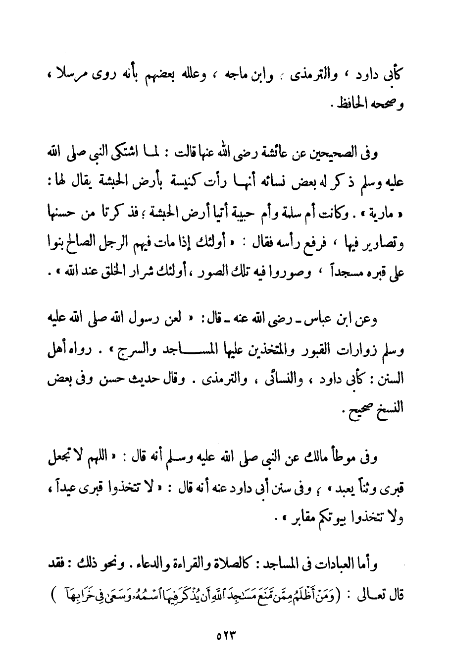 كَأَبِي دَاوُد وَالتِّرْمِذِي وَابْنِ مَاجَه وَعَلَّلَهُ بَعْضُهُمْ بِأَنَّهُ رُوِيَ مُرْسَلًا وَصَحَّحَهُ الْحَافِظُ (*) . وَفِي الصَّحِيحَيْنِ عَنْ عَائِشَةَ رَضِيَ اللَّهُ عَنْهَا قَالَتْ: {لَمَّا اشْتَكَى النَّبِيُّ صَلَّى اللَّهُ عَلَيْهِ وَسَلَّمَ ذَكَرَ لَهُ بَعْضُ نِسَائِهِ أَنَّهَا رَأَتْ كَنِيسَةً بِأَرْضِ الْحَبَشَةِ يُقَالُ لَهَا: مَارِيَةُ. وَكَانَتْ أَمْ سَلَمَةَ وَأُمُّ حَبِيبَةَ أَتَيَا أَرْضَ الْحَبَشَةِ؛ فَذَكَرَتَا مَنْ حُسْنِهَا وَتَصَاوِيرَ فِيهَا فَرَفَعَ رَأْسَهُ فَقَالَ: أُولَئِكَ إذَا مَاتَ فِيهِمْ الرَّجُلُ الصَّالِحُ بَنَوْا عَلَى قَبْرِهِ مَسْجِدًا وَصَوَّرُوا فِيهِ تِلْكَ الصُّوَرَ أُولَئِكَ شِرَارُ الْخَلْقِ عِنْدَ اللَّهِ} ". وَعَنْ ابْنِ عَبَّاسٍ - رَضِيَ اللَّهُ عَنْهُ - قَالَ: " {لَعَنَ رَسُولُ اللَّهِ صَلَّى اللَّهُ عَلَيْهِ وَسَلَّمَ زَوَّارَاتِ الْقُبُورِ وَالْمُتَّخِذِينَ عَلَيْهَا الْمَسَاجِدَ وَالسُّرُجَ} ". رَوَاهُ أَهْلُ السُّنَنِ: كَأَبِي دَاوُدَ وَالنَّسَائِي وَالتِّرْمِذِي. وَقَالَ حَدِيثٌ حَسَنٌ وَفِي بَعْضِ النُّسَخِ صَحِيحٌ. وَفِي مُوَطَّأِ مَالِك عَنْ النَّبِيِّ صَلَّى اللَّهُ عَلَيْهِ وَسَلَّمَ أَنَّهُ قَالَ: " {اللَّهُمَّ لَا تَجْعَلْ قَبْرِي وَثَنًا يُعْبَدُ} "؛ وَفِي سُنَنِ أَبِي دَاوُد عَنْهُ أَنَّهُ قَالَ: " {لَا تَتَّخِذُوا قَبْرِي عِيدًا وَلَا تَتَّخِذُوا بُيُوتَكُمْ مَقَابِرَ} ". وَأَمَّا الْعِبَادَاتُ فِي الْمَسَاجِدِ: كَالصَّلَاةِ وَالْقِرَاءَةِ وَالدُّعَاءِ. وَنَحْوِ ذَلِكَ: فَقَدْ قَالَ تَعَالَى: {وَمَنْ أَظْلَمُ مِمَّنْ مَنَعَ مَسَاجِدَ اللَّهِ أَنْ يُذْكَرَ فِيهَا اسْمُهُ وَسَعَى فِي