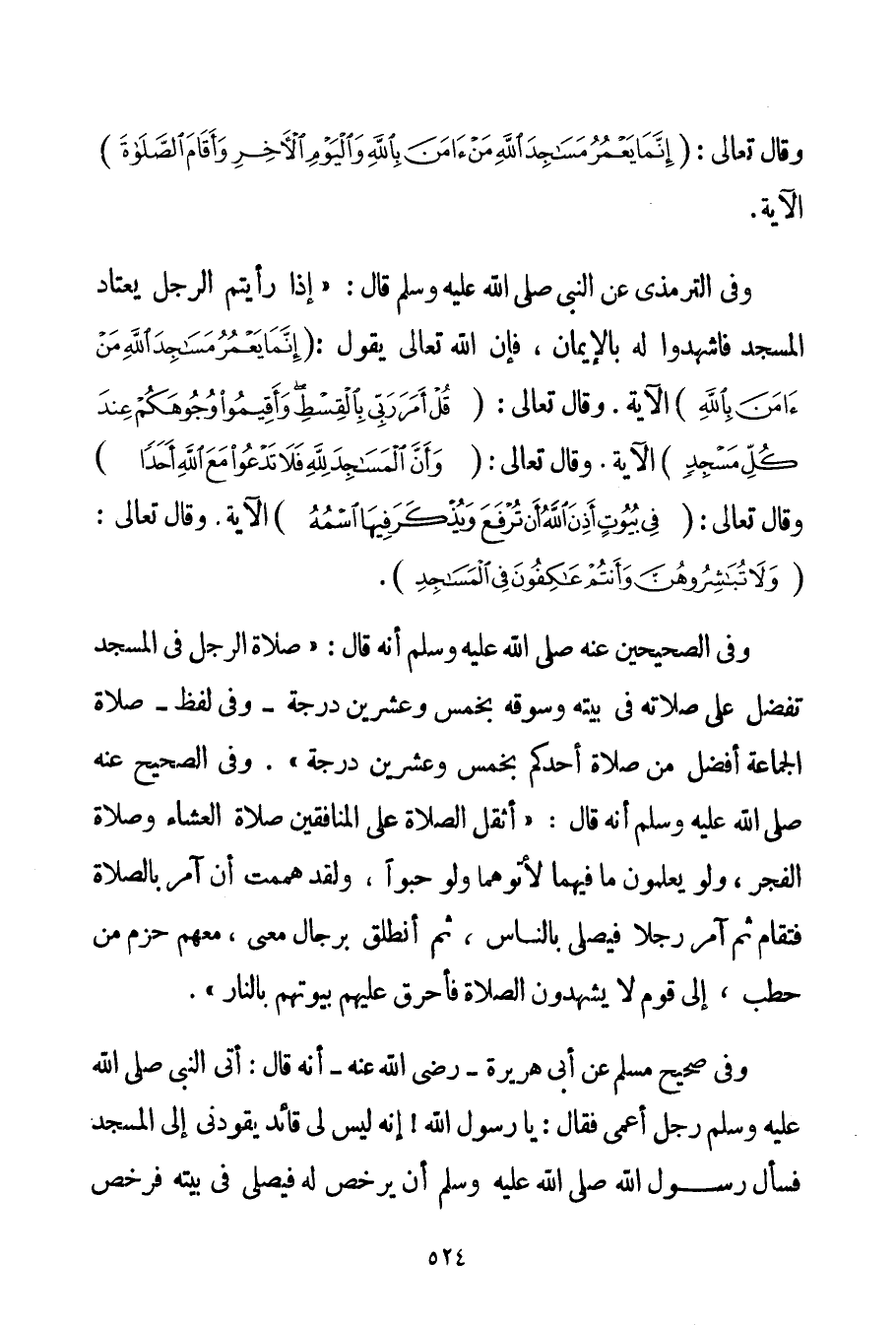 خَرَابِهَا} وَقَالَ تَعَالَى: {إنَّمَا يَعْمُرُ مَسَاجِدَ اللَّهِ مَنْ آمَنَ بِاللَّهِ وَالْيَوْمِ الْآخِرِ وَأَقَامَ الصَّلَاةَ} الْآيَةَ. وَفِي التِّرْمِذِيِّ عَنْ النَّبِيِّ صَلَّى اللَّهُ عَلَيْهِ وَسَلَّمَ قَالَ: " {إذَا رَأَيْتُمْ الرَّجُلَ يَعْتَادُ الْمَسْجِدَ فَاشْهَدُوا لَهُ بِالْإِيمَانِ} فَإِنَّ اللَّهَ تَعَالَى يَقُولُ: {إنَّمَا يَعْمُرُ مَسَاجِدَ اللَّهِ مَنْ آمَنَ بِاللَّهِ} الْآيَةَ. وَقَالَ تَعَالَى: {قُلْ أَمَرَ رَبِّي بِالْقِسْطِ وَأَقِيمُوا وُجُوهَكُمْ عِنْدَ كُلِّ مَسْجِدٍ} الْآيَةَ. وَقَالَ تَعَالَى. {وَأَنَّ الْمَسَاجِدَ لِلَّهِ فَلَا تَدْعُوا مَعَ اللَّهِ أَحَدًا} وَقَالَ تَعَالَى: {فِي بُيُوتٍ أَذِنَ اللَّهُ أَنْ تُرْفَعَ وَيُذْكَرَ فِيهَا اسْمُهُ} الْآيَةَ. وَقَالَ تَعَالَى: {وَلَا تُبَاشِرُوهُنَّ وَأَنْتُمْ عَاكِفُونَ فِي الْمَسَاجِدِ} . وَفِي الصَّحِيحَيْنِ عَنْهُ صَلَّى اللَّهُ عَلَيْهِ وَسَلَّمَ أَنَّهُ قَالَ: {صَلَاةُ الرَّجُلِ فِي الْمَسْجِدِ تَفْضُلُ عَلَى صَلَاتِهِ فِي بَيْتِهِ وَسُوقِهِ بِخَمْسِ وَعِشْرِينَ دَرَجَةً - وَفِي لَفْظٍ - صَلَاةُ الْجَمَاعَةِ أَفْضَلُ مِنْ صَلَاةِ أَحَدِكُمْ بِخَمْسِ وَعِشْرِينَ دَرَجَةً} ". وَفِي الصَّحِيحِ عَنْهُ صَلَّى اللَّهُ عَلَيْهِ وَسَلَّمَ أَنَّهُ قَالَ: " {أَثْقَلُ الصَّلَاةِ عَلَى الْمُنَافِقِينَ صَلَاةُ الْعِشَاءِ وَصَلَاةُ الْفَجْرِ وَلَوْ يَعْلَمُونَ مَا فِيهِمَا لَأَتَوْهُمَا وَلَوْ حَبْوًا وَلَقَدْ هَمَمْت أَنْ آمُرَ بِالصَّلَاةِ فَتُقَامَ ثُمَّ آمُرَ رَجُلًا فَيُصَلِّي بِالنَّاسِ ثُمَّ أَنْطَلِقُ بِرِجَالِ مَعِي مَعَهُمْ حُزَمٌ مِنْ حَطَبٍ إلَى قَوْمٍ لَا يَشْهَدُونَ الصَّلَاةَ فَأُحَرِّقَ عَلَيْهِمْ بُيُوتَهُمْ بِالنَّارِ} ". وَفِي صَحِيحِ مُسْلِمٍ عَنْ أَبِي هُرَيْرَةَ - رَضِيَ اللَّهُ عَنْهُ - أَنَّهُ قَالَ: {أَتَى النَّبِيَّ صَلَّى اللَّهُ عَلَيْهِ وَسَلَّمَ رَجُلٌ أَعْمَى فَقَالَ: يَا رَسُولَ اللَّهِ إنَّهُ لَيْسَ لِي قَائِدٌ يَقُودُنِي إلَى الْمَسْجِدِ فَسَأَلَ رَسُولَ اللَّهِ صَلَّى اللَّهُ عَلَيْهِ وَسَلَّمَ أَنْ يُرَخِّصَ لَهُ فَيُصَلِّيَ فِي بَيْتِهِ فَرَخَّصَ