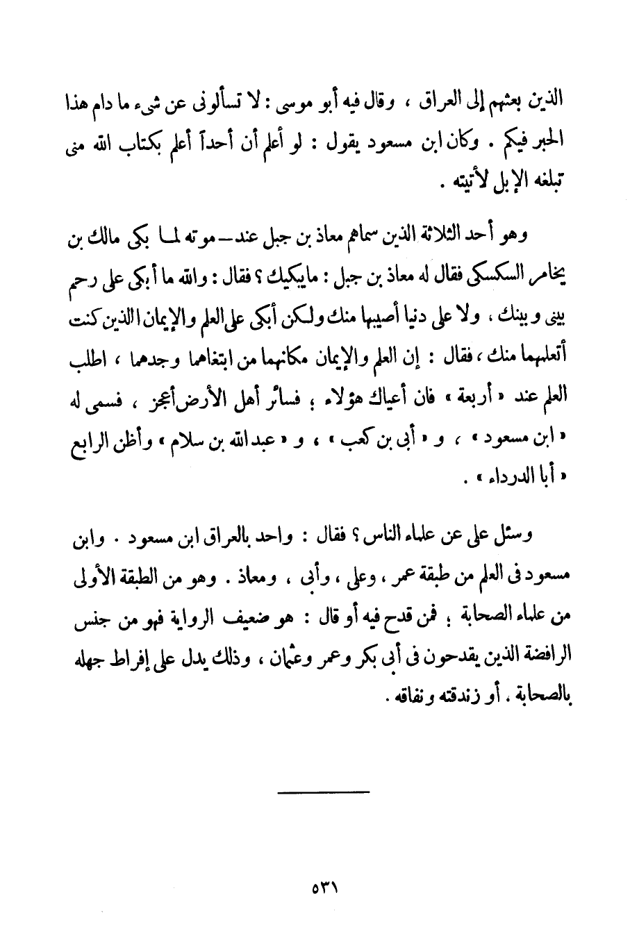 الَّذِينَ بَعَثَهُمْ إلَى الْعِرَاقِ وَقَالَ فِيهِ أَبُو مُوسَى: لَا تَسْأَلُونِي عَنْ شَيْءٍ مَا دَامَ هَذَا الْحَبْرُ فِيكُمْ. وَكَانَ ابْنُ مَسْعُودٍ يَقُولُ: لَوْ أَعْلَمُ أَنَّ أَحَدًا أَعْلَمَ بِكِتَابِ اللَّهِ مِنِّي تَبْلُغُهُ الْإِبِلُ لَأَتَيْته. وَهُوَ أَحَدُ الثَّلَاثَةِ الَّذِينَ سَمَّاهُمْ مُعَاذُ بْنُ جَبَلٍ عِنْدَ - مَوْتِهِ لَمَّا بَكَى مَالِكُ بْنُ يُخَامِرَ السكسكي فَقَالَ لَهُ مُعَاذُ بْنُ جَبَلٍ: مَا يُبْكِيك؟ فَقَالَ: وَاَللَّهِ مَا أَبْكِي عَلَى رَحِمٍ بَيْنِي وَبَيْنَك وَلَا عَلَى دُنْيَا أُصِيبُهَا مِنْك وَلَكِنْ أَبْكِي عَلَى الْعِلْمِ وَالْإِيمَانِ اللَّذَيْنِ كُنْت أَتَعَلَّمُهُمَا مِنْك فَقَالَ: إنَّ الْعِلْمَ وَالْإِيمَانَ مَكَانُهُمَا مَنْ ابْتَغَاهُمَا وَجَدَهُمَا اُطْلُبْ الْعِلْمَ عِنْدَ " أَرْبَعَةٍ " فَإِنْ أَعْيَاك هَؤُلَاءِ؛ فَسَائِرُ أَهْلِ الْأَرْضِ أَعْجَزُ فَسَمَّى لَهُ " ابْنَ مَسْعُودٍ " و " أبي بْنَ كَعْبٍ " و " عَبْدَ اللَّهِ بْنَ سَلَامٍ " وَأَظُنُّ الرَّابِعَ " أَبَا الدَّرْدَاءِ ". وَسُئِلَ عَلِيٌّ عَنْ عُلَمَاءِ النَّاسِ؟ فَقَالَ: وَاحِدٌ بِالْعِرَاقِ ابْنُ مَسْعُودٍ. وَابْنُ مَسْعُودٍ فِي الْعِلْمِ مِنْ طَبَقَةِ عُمَرَ وَعَلِيٍّ وأبي وَمُعَاذٍ. وَهُوَ مِنْ الطَّبَقَةِ الْأُولَى مِنْ عُلَمَاءِ الصَّحَابَةِ؛ فَمَنْ قَدَحَ فِيهِ أَوْ قَالَ: هُوَ ضَعِيفُ الرِّوَايَةِ فَهُوَ مِنْ جِنْسِ الرَّافِضَةِ الَّذِينَ يَقْدَحُونَ فِي أَبِي بَكْرٍ وَعُمَرَ وَعُثْمَانَ وَذَلِكَ يَدُلُّ عَلَى إفْرَاطِ جَهْلِهِ بِالصَّحَابَةِ أَوْ زَنْدَقَته وَنِفَاقِهِ.