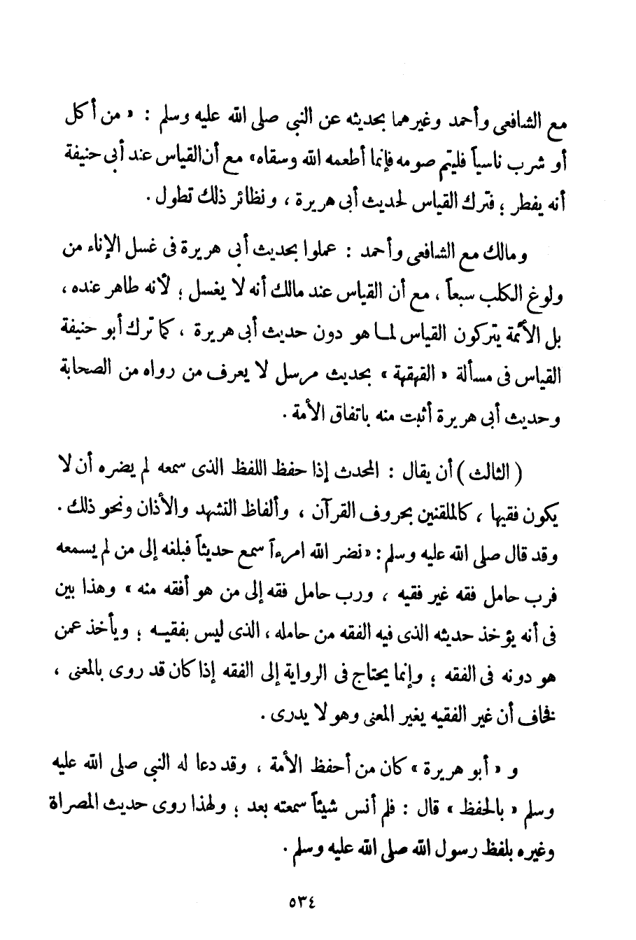 مَعَ الشَّافِعِيِّ وَأَحْمَدَ وَغَيْرِهِمَا بِحَدِيثِهِ عَنْ النَّبِيِّ صَلَّى اللَّهُ عَلَيْهِ وَسَلَّمَ " {مَنْ أَكَلَ أَوْ شَرِبَ نَاسِيًا فَلْيُتِمَّ صَوْمَهُ فَإِنَّمَا أَطْعَمَهُ اللَّهُ وَسَقَاهُ} " مَعَ أَنَّ الْقِيَاسَ عِنْدَ أَبِي حَنِيفَةَ أَنَّهُ يُفْطِرُ؛ فَتَرَكَ الْقِيَاسَ لِحَدِيثِ أَبِي هُرَيْرَةَ وَنَظَائِرُ ذَلِكَ تَطُولُ. وَمَالِكٌ مَعَ الشَّافِعِيِّ وَأَحْمَدَ عَمِلُوا بِحَدِيثِ أَبِي هُرَيْرَةَ فِي غَسْلِ الْإِنَاءِ مِنْ وُلُوغِ الْكَلْبِ سَبْعًا مَعَ أَنَّ الْقِيَاسَ عِنْدَ مَالِكٍ أَنَّهُ لَا يُغْسَلُ؛ لِأَنَّهُ طَاهِرٌ عِنْدَهُ بَلْ الْأَئِمَّةُ يَتْرُكُونَ الْقِيَاسَ لِمَا هُوَ دُونَ حَدِيثِ أَبِي هُرَيْرَةَ كَمَا تَرَكَ أَبُو حَنِيفَةَ الْقِيَاسَ فِي مَسْأَلَةِ " الْقَهْقَهَةِ " بِحَدِيثِ مُرْسَلٍ لَا يُعْرَفُ مَنْ رَوَاهُ مِنْ الصَّحَابَةِ وَحَدِيثُ أَبِي هُرَيْرَةَ أَثْبَتُ مِنْهُ بِاتِّفَاقِ الْأُمَّةِ. (الثَّالِثُ أَنْ يُقَالَ: الْمُحَدِّثُ إذَا حَفِظَ اللَّفْظَ الَّذِي سَمِعَهُ لَمْ يَضُرّهُ أَنْ لَا يَكُونُ فَقِيهًا كَالْمُلَقِّنِينَ بِحُرُوفِ الْقُرْآنِ وَأَلْفَاظِ التَّشَهُّدِ وَالْأَذَانِ وَنَحْوِ ذَلِكَ. وَقَدْ قَالَ صَلَّى اللَّهُ عَلَيْهِ وَسَلَّمَ " {نَضَّرَ اللَّهُ امْرَأً سَمِعَ حَدِيثًا فَبَلَّغَهُ إلَى مَنْ لَمْ يَسْمَعْهُ فَرُبَّ حَامِلِ فِقْهٍ غَيْرُ فَقِيهٍ وَرُبَّ حَامِلِ فِقْهٍ إلَى مَنْ هُوَ أَفْقَهُ مِنْهُ} " وَهَذَا بَيِّنٌ فِي أَنَّهُ يُؤْخَذُ حَدِيثُهُ الَّذِي فِيهِ الْفِقْهُ مِنْ حَامِلِهِ الَّذِي لَيْسَ بِفَقِيهِ؛ وَيَأْخُذُ عَمَّنْ هُوَ دُونَهُ فِي الْفِقْهِ؛ وَإِنَّمَا يَحْتَاجُ فِي الرِّوَايَةِ إلَى الْفِقْهِ إذَا كَانَ قَدْ رُوِيَ بِالْمَعْنَى فَخَافَ أَنَّ غَيْرَ الْفَقِيهِ يُغَيِّرُ الْمَعْنَى وَهُوَ لَا يَدْرِي. و " أَبُو هُرَيْرَةَ " كَانَ مِنْ أَحْفَظِ الْأُمَّةِ وَقَدْ دَعَا لَهُ النَّبِيُّ صَلَّى اللَّهُ عَلَيْهِ وَسَلَّمَ " بِالْحِفْظِ " قَالَ: فَلَمْ أَنْسَ شَيْئًا سَمِعْته بَعْدُ؛ وَلِهَذَا رَوَى حَدِيثَ الْمُصَرَّاةَ وَغَيْرَهُ بِلَفْظِ رَسُولِ اللَّهِ صَلَّى اللَّهُ عَلَيْهِ وَسَلَّمَ.