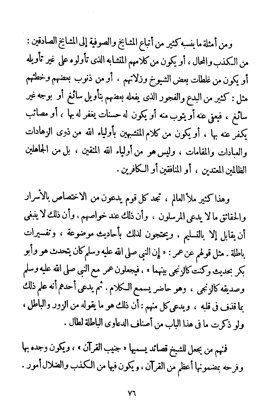 وَمِنْ أَمْثِلَةِ مَا يَنْسُبُهُ كَثِيرٌ مِنْ أَتْبَاعِ الْمَشَايِخِ وَالصُّوفِيَّةِ إلَى الْمَشَايِخِ الصَّادِقِينَ: مِنْ الْكَذِبِ وَالْمُحَالِ أَوْ يَكُونُ مِنْ كَلَامِهِمْ الْمُتَشَابِهِ الَّذِي تَأَوَّلُوهُ عَلَى غَيْرِ تَأْوِيلِهِ أَوْ يَكُونُ مِنْ غَلَطَاتِ بَعْضِ الشُّيُوخِ وَزَلَّاتِهِمْ أَوْ مِنْ ذُنُوبِ بَعْضِهِمْ وَخَطَئِهِمْ مِثْلُ: كَثِيرٍ مِنْ الْبِدَعِ وَالْفُجُورِ الَّذِي يَفْعَلُهُ بَعْضُهُمْ بِتَأْوِيلِ سَائِغٍ أَوْ بِوَجْهِ غَيْرِ سَائِغٍ فَيُعْفَى عَنْهُ أَوْ يَتُوبُ مِنْهُ أَوْ يَكُونُ لَهُ حَسَنَاتٌ يُغْفَرُ لَهُ بِهَا أَوْ مَصَائِبُ يُكَفَّرُ عَنْهُ بِهَا أَوْ يَكُونُ مِنْ كَلَامِ الْمُتَشَبِّهِينَ بِأَوْلِيَاءِ اللَّهِ مِنْ ذَوِي الزهادات وَالْعِبَادَاتِ وَالْمَقَامَاتِ وَلَيْسَ هُوَ مِنْ أَوْلِيَاءِ اللَّهِ الْمُتَّقِينَ بَلْ مِنْ الْجَاهِلِينَ الظَّالِمِينَ الْمُعْتَدِينَ أَوْ الْمُنَافِقِينَ أَوْ الْكَافِرِينَ. وَهَذَا كَثِيرٌ مَلَأَ الْعَالَمَ تَجِدُ كُلَّ قَوْمٍ يَدَّعُونَ مِنْ الِاخْتِصَاصِ بِالْأَسْرَارِ وَالْحَقَائِقِ مَا لَا يَدَّعِي الْمُرْسَلُونَ وَأَنَّ ذَلِكَ عِنْدَ خَوَاصِّهِمْ وَأَنَّ ذَلِكَ لَا يَنْبَغِي أَنْ يُقَابَلَ إلَّا بِالتَّسْلِيمِ وَيَحْتَجُّونَ لِذَلِكَ بِأَحَادِيثَ مَوْضُوعَةٍ وَتَفْسِيرَاتٍ بَاطِلَةٍ. مِثْلُ قَوْلِهِمْ عَنْ عُمَرَ: " إنَّ النَّبِيَّ صَلَّى اللَّهُ عَلَيْهِ وَسَلَّمَ كَانَ يَتَحَدَّثُ هُوَ وَأَبُو بَكْرٍ بِحَدِيثِ وَكُنْت كَالزِّنْجِيِّ بَيْنَهُمَا " فَيَجْعَلُونَ عُمَرَ مَعَ النَّبِيِّ صَلَّى اللَّهُ عَلَيْهِ وَسَلَّمَ وَصَدِيقِهِ كَالزِّنْجِيِّ وَهُوَ حَاضِرٌ يَسْمَعُ الْكَلَامَ. ثُمَّ يَدَّعِي أَحَدُهُمْ أَنَّهُ عَلِمَ ذَلِكَ بِمَا قُذِفَ فِي قَلْبِهِ وَيَدَّعِي كُلٌّ مِنْهُمْ: أَنَّ ذَلِكَ هُوَ مَا يَقُولُهُ مِنْ الزُّورِ وَالْبَاطِلِ وَلَوْ ذَكَرْت مَا فِي هَذَا الْبَابِ مِنْ أَصْنَافِ الدَّعَاوَى الْبَاطِلَةِ لَطَالَ. فَمِنْهُمْ مَنْ يَجْعَلُ لِلشَّيْخِ قَصَائِدَ يُسَمِّيهَا " جَنِيبَ الْقُرْآنِ " وَيَكُونُ وَجْدُهُ بِهَا وَفَرَحُهُ بِمَضْمُونِهَا أَعْظَمَ مِنْ الْقُرْآنِ وَيَكُونُ فِيهَا مِنْ الْكَذِبِ وَالضَّلَالِ أُمُورٌ.