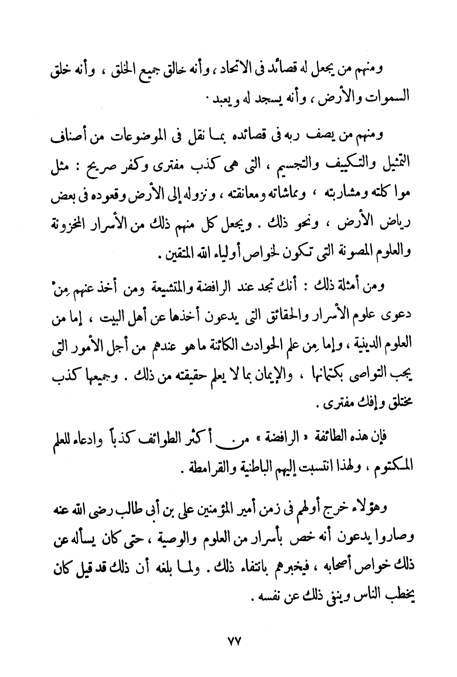 وَمِنْهُمْ مَنْ يَجْعَلُ لَهُ قَصَائِدَ فِي الِاتِّحَادِ وَأَنَّهُ خَالِقُ جَمِيعِ الْخَلْقِ وَأَنَّهُ خَلَقَ السَّمَوَاتِ وَالْأَرْضَ وَأَنَّهُ يَسْجُدُ لَهُ وَيَعْبُدُ. وَمِنْهُمْ مَنْ يَصِفُ رَبَّهُ فِي قَصَائِدِهِ بِمَا نُقِلَ فِي الْمَوْضُوعَاتِ مِنْ أَصْنَافِ التَّمْثِيلِ وَالتَّكْيِيفِ وَالتَّجْسِيمِ الَّتِي هِيَ كَذِبٌ مُفْتَرًى وَكُفْرٌ صَرِيحٌ: مِثْلُ مُوَاكَلَتِهِ وَمُشَارَبَتِهِ وَمُمَاشَاتِهِ وَمُعَانَقَتِهِ وَنُزُولِهِ إلَى الْأَرْضِ وَقُعُودِهِ فِي بَعْضِ رِيَاضِ الْأَرْضِ وَنَحْوِ ذَلِكَ. وَيَجْعَلُ كُلٌّ مِنْهُمْ ذَلِكَ مِنْ الْأَسْرَارِ الْمَخْزُونَةِ وَالْعُلُومِ الْمَصُونَةِ الَّتِي تَكُونُ لِخَوَاصِّ أَوْلِيَاءِ اللَّهِ الْمُتَّقِينَ. وَمِنْ أَمْثِلَةِ ذَلِكَ: أَنَّك تَجِدُ عِنْدَ الرَّافِضَةِ وَالْمُتَشَيِّعَةِ وَمَنْ أَخَذَ عَنْهُمْ مِنْ دَعْوَى عُلُومِ الْأَسْرَارِ وَالْحَقَائِقِ الَّتِي يَدَّعُونَ أَخْذَهَا عَنْ أَهْلِ الْبَيْتِ إمَّا مِنْ الْعُلُومِ الدِّينِيَّةِ وَإِمَّا مِنْ عِلْمِ الْحَوَادِثِ الْكَائِنَةِ مَا هُوَ عِنْدَهُمْ مِنْ أَجَلِّ الْأُمُورِ الَّتِي يَجِبُ التَّوَاصِي بِكِتْمَانِهَا وَالْإِيمَانِ بِمَا لَا يَعْلَمُ حَقِيقَتَهُ مِنْ ذَلِكَ. وَجَمِيعُهَا كَذِبٌ مُخْتَلَقٌ وَإِفْكٌ مُفْتَرًى. فَإِنَّ هَذِهِ الطَّائِفَةَ " الرَّافِضَةَ " مِنْ أَكْثَرِ الطَّوَائِفِ كَذِبًا وَادِّعَاءً لِلْعِلْمِ الْمَكْتُومِ وَلِهَذَا انْتَسَبَتْ إلَيْهِمْ الْبَاطِنِيَّةُ وَالْقَرَامِطَةُ.