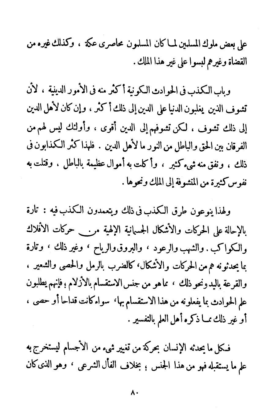 وَبَابُ الْكَذِبِ فِي الْحَوَادِثِ الْكَوْنِيَّةِ أَكْثَرُ مِنْهُ فِي الْأُمُورِ الدِّينِيَّةِ لِأَنَّ تَشَوُّفَ الَّذِينَ يُغَلِّبُونَ الدُّنْيَا عَلَى الدِّينِ إلَى ذَلِكَ أَكْثَرُ وَإِنْ كَانَ لِأَهْلِ الدِّينِ إلَى ذَلِكَ تَشَوُّفٌ لَكِنَّ تَشَوُّفَهُمْ إلَى الدِّينِ أَقْوَى وَأُولَئِكَ لَيْسَ لَهُمْ مِنْ الْفُرْقَانِ بَيْنَ الْحَقِّ وَالْبَاطِلِ مِنْ النُّورِ مَا لِأَهْلِ الدِّينِ. فَلِهَذَا كَثُرَ الْكَذَّابُونَ فِي ذَلِكَ وَنَفَقَ مِنْهُ شَيْءٌ كَثِيرٌ وَأُكِلَتْ بِهِ أَمْوَالٌ عَظِيمَةٌ بِالْبَاطِلِ وَقُتِلَتْ بِهِ نُفُوسٌ كَثِيرَةٌ مِنْ الْمُتَشَوِّفَةِ إلَى الْمُلْكِ وَنَحْوِهَا. وَلِهَذَا يُنَوِّعُونَ طُرُقَ الْكَذِبِ فِي ذَلِكَ وَيَتَعَمَّدُونَ الْكَذِبَ فِيهِ: تَارَةً بِالْإِحَالَةِ عَلَى الْحَرَكَاتِ وَالْأَشْكَالِ الْجُسْمَانِيَّةِ الْإِلَهِيَّةِ مِنْ حَرَكَاتِ الْأَفْلَاكِ وَالْكَوَاكِبِ. وَالشُّهُبِ وَالرُّعُودِ وَالْبُرُوقِ وَالرِّيَاحِ وَغَيْرِ ذَلِكَ وَتَارَةً بِمَا يُحْدِثُونَهُ هُمْ مِنْ الْحَرَكَاتِ وَالْأَشْكَالِ كَالضَّرْبِ بِالرَّمْلِ وَالْحَصَا وَالشَّعِيرِ وَالْقُرْعَةِ بِالْيَدِ وَنَحْوِ ذَلِكَ مِمَّا هُوَ مِنْ جِنْسِ الِاسْتِقْسَامِ بِالْأَزْلَامِ؛ فَإِنَّهُمْ يَطْلُبُونَ عِلْمَ الْحَوَادِثِ بِمَا يَفْعَلُونَهُ مِنْ هَذَا الِاسْتِقْسَامِ بِهَا سَوَاءٌ كَانَتْ قِدَاحًا أَوْ حَصًى أَوْ غَيْرَ ذَلِكَ مِمَّا ذَكَرَهُ أَهْلُ الْعِلْمِ بِالتَّفْسِيرِ. فَكُلُّ مَا يُحْدِثُهُ الْإِنْسَانُ بِحَرَكَةِ مِنْ تَغْيِيرِ شَيْءٍ مِنْ الْأَجْسَامِ لِيَسْتَخْرِجَ بِهِ عِلْمَ مَا يَسْتَقْبِلُهُ فَهُوَ مِنْ هَذَا الْجِنْسِ؛ بِخِلَافِ الْفَأْلِ الشَّرْعِيِّ وَهُوَ الَّذِي كَانَ