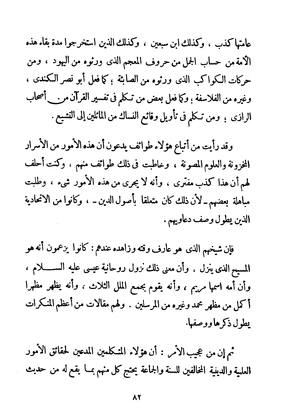 ثُمَّ إنَّ مِنْ عَجِيبِ الْأَمْرِ: أَنَّ هَؤُلَاءِ الْمُتَكَلِّمِينَ الْمُدَّعِينَ لِحَقَائِقِ الْأُمُورِ الْعِلْمِيَّةِ وَالدِّينِيَّةِ الْمُخَالِفِينَ لِلسُّنَّةِ وَالْجَمَاعَةِ يَحْتَجُّ كُلٌّ مِنْهُمْ بِمَا يَقَعُ لَهُ مِنْ حَدِيثٍ