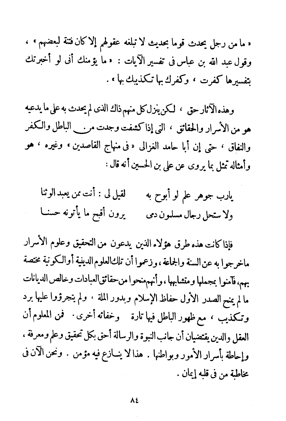 " مَا مِنْ رَجُلٍ يُحَدِّثُ قَوْمًا بِحَدِيثِ لَا تَبْلُغُهُ عُقُولُهُمْ إلَّا كَانَ فِتْنَةً لِبَعْضِهِمْ " وَقَوْلِ عَبْدِ اللَّهِ بْنِ عَبَّاسٍ فِي تَفْسِيرِ الْآيَاتِ: " مَا يُؤَمِّنُك أَنِّي لَوْ أَخْبَرْتُك بِتَفْسِيرِهَا كَفَرْت وَكُفْرُك بِهَا تَكْذِيبُك بِهَا ". وَهَذِهِ الْآثَارُ حَقٌّ لَكِنْ يُنَزِّلُ كُلٌّ مِنْهُمْ ذَاكَ الَّذِي لَمْ يُحَدِّثْ بِهِ عَلَى مَا يَدَّعِيهِ هُوَ مِنْ الْأَسْرَارِ وَالْحَقَائِقِ الَّتِي إذَا كُشِفَتْ وُجِدَتْ مِنْ الْبَاطِلِ وَالْكُفْرِ وَالنِّفَاقِ حَتَّى إنَّ أَبَا حَامِدٍ الْغَزَالِيَّ " فِي مِنْهَاجِ الْقَاصِدِينَ " وَغَيْرِهِ هُوَ وَأَمْثَالُهُ تَمَثَّلَ بِمَا يُرْوَى عَنْ عَلِيِّ بْنِ الْحُسَيْنِ أَنَّهُ قَالَ: يَا رُبَّ جَوْهَرِ عِلْمٍ لَوْ أَبُوحُ بِهِ لَقِيلَ لِي: أَنْتَ مِمَّنْ يَعْبُدُ الْوَثَنَا وَلَاسْتَحَلَّ رِجَالٌ مُسْلِمُونَ دَمِي يَرَوْنَ أَقْبَحَ مَا يَأْتُونَهُ حَسَنَا فَإِذَا كَانَتْ هَذِهِ طُرُقَ هَؤُلَاءِ الَّذِينَ يَدَّعُونَ مِنْ التَّحْقِيقِ وَعُلُومِ الْأَسْرَارِ مَا خَرَجُوا بِهِ عَنْ السُّنَّةِ وَالْجَمَاعَةِ وَزَعَمُوا أَنَّ تِلْكَ الْعُلُومَ الدِّينِيَّةَ أَوْ الْكَوْنِيَّةَ مُخْتَصَّةٌ بِهِمْ فَآمَنُوا بِمُجْمَلِهَا وَمُتَشَابِهِهَا وَأَنَّهُمْ مُنِحُوا مِنْ حَقَائِقِ الْعِبَادَاتِ وَخَالِصِ الدِّيَانَاتِ مَا لَمْ يُمْنَحْ الصَّدْرُ الْأَوَّلُ حُفَّاظُ الْإِسْلَامِ وَبُدُورُ الْمِلَّةِ وَلَمْ يَتَجَرَّءُوا عَلَيْهَا بِرَدِّ وَتَكْذِيبٍ مَعَ ظُهُورِ الْبَاطِلِ فِيهَا تَارَةً. وَخَفَائِهِ أُخْرَى. فَمِنْ الْمَعْلُومِ أَنَّ الْعَقْلَ وَالدِّينَ يَقْتَضِيَانِ أَنَّ جَانِبَ النُّبُوَّةِ وَالرِّسَالَةِ أَحَقُّ بِكُلِّ تَحْقِيقٍ وَعِلْمٍ وَمَعْرِفَةٍ وَإِحَاطَةٍ بِأَسْرَارِ الْأُمُورِ وَبَوَاطِنهَا. هَذَا لَا يُنَازِعُ فِيهِ مُؤْمِنٌ. وَنَحْنُ الْآنُ فِي مُخَاطَبَةِ مَنْ فِي قَلْبِهِ إيمَانٌ.