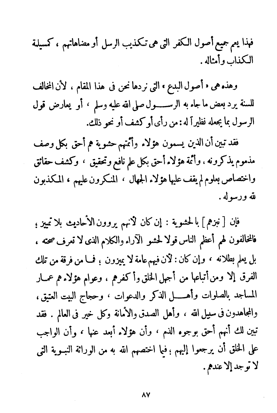 فَقَدْ تَبَيَّنَ أَنَّ الَّذِينَ يُسَمُّونَ هَؤُلَاءِ وَأَئِمَّتَهُمْ حَشْوِيَّةً هُمْ أَحَقُّ بِكُلِّ وَصْفٍ مَذْمُومٍ يَذْكُرُونَهُ وَأَئِمَّةُ هَؤُلَاءِ أَحَقُّ بِكُلِّ عِلْمٍ نَافِعٍ وَتَحْقِيقٍ وَكَشْفِ حَقَائِقَ وَاخْتِصَاصٍ بِعُلُومِ لَمْ يَقِفْ عَلَيْهَا هَؤُلَاءِ الْجُهَّالُ الْمُنْكِرُونَ عَلَيْهِمْ الْمُكَذِّبُونَ لِلَّهِ وَرَسُولِهِ. فَإِنَّ نَبْزَهُمْ بِالْحَشْوِيَّةِ: إنْ كَانَ لِأَنَّهُمْ يَرْوُونَ الْأَحَادِيثَ بِلَا تَمْيِيزٍ؛ فَالْمُخَالِفُونَ لَهُمْ أَعْظَمُ النَّاسِ قَوْلًا لِحَشْوِ الْآرَاءِ وَالْكَلَامِ الَّذِي لَا تُعْرَفُ صِحَّتُهُ بَلْ يُعْلَمُ بُطْلَانُهُ وَإِنْ كَانَ: لِأَنَّ فِيهِمْ عَامَّةً لَا يُمَيِّزُونَ؛ فَمَا مِنْ فِرْقَةٍ مِنْ تِلْكَ الْفِرَقِ إلَّا وَمِنْ أَتْبَاعِهَا مَنْ أَجْهَلُ الْخَلْقِ وَأَكْفَرُهُمْ وَعَوَامُّ هَؤُلَاءِ هُمْ عُمَّارُ الْمَسَاجِدِ بِالصَّلَوَاتِ وَأَهْلُ الذِّكْرِ وَالدَّعَوَاتِ وَحُجَّاجُ الْبَيْتِ الْعَتِيقِ وَالْمُجَاهِدُونَ فِي سَبِيلِ اللَّهِ وَأَهْلُ الصِّدْقِ وَالْأَمَانَةِ وَكُلُّ خَيْرٍ فِي الْعَالَمِ. فَقَدْ تَبَيَّنَ لَك أَنَّهُمْ أَحَقُّ بِوُجُوهِ الذَّمِّ وَأَنَّ هَؤُلَاءِ أَبْعَدُ عَنْهَا وَأَنَّ الْوَاجِبَ عَلَى الْخَلْقِ أَنْ يَرْجِعُوا إلَيْهِمْ؛ فِيمَا اخْتَصَّهُمْ اللَّهُ بِهِ مِنْ الْوِرَاثَةِ النَّبَوِيَّةِ الَّتِي لَا تُوجَدُ إلَّا عِنْدَهُمْ.