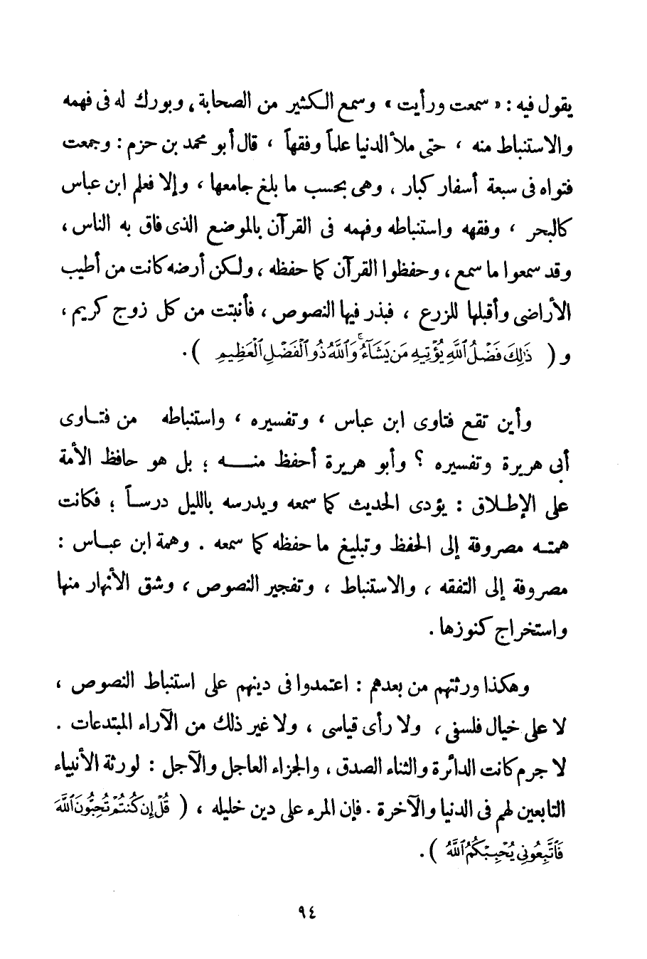 يَقُولُ فِيهِ: " سَمِعْت وَرَأَيْت " وَسَمِعَ الْكَثِيرُ مِنْ الصَّحَابَةِ وَبُورِكَ لَهُ فِي فَهْمِهِ وَالِاسْتِنْبَاطِ مِنْهُ حَتَّى مَلَأَ الدُّنْيَا عِلْمًا وَفِقْهًا قَالَ أَبُو مُحَمَّدٍ بْنُ حَزْمٍ: وَجُمِعَتْ فَتْوَاهُ فِي سَبْعَةِ أَسْفَارٍ كِبَارٍ وَهِيَ بِحَسَبِ مَا بَلَغَ جَامِعُهَا وَإِلَّا فَعِلْمُ ابْنِ عَبَّاسٍ كَالْبَحْرِ وَفِقْهُهُ وَاسْتِنْبَاطُهُ وَفَهْمُهُ فِي الْقُرْآنِ بِالْمَوْضِعِ الَّذِي فَاقَ بِهِ النَّاسَ وَقَدْ سَمِعُوا مَا سَمِعَ وَحَفِظُوا الْقُرْآنَ كَمَا حَفِظَهُ وَلَكِنَّ أَرْضَهُ كَانَتْ مَنْ أَطْيَبِ الْأَرَاضِي وَأَقْبَلِهَا لِلزَّرْعِ فَبَذَرَ فِيهَا النُّصُوصَ فَأَنْبَتَتْ مَنْ كُلِّ زَوْجٍ كَرِيمٍ وَذَلِكَ فَضْلُ اللَّهِ يُؤْتِيهِ مَنْ يَشَاءُ وَاَللَّهُ ذُو الْفَضْلِ الْعَظِيمِ. وَأَيْنَ تَقَعُ فَتَاوَى ابْنِ عَبَّاسٍ وَتَفْسِيرُهُ وَاسْتِنْبَاطُهُ مِنْ فَتَاوَى أَبِي هُرَيْرَةَ وَتَفْسِيرِهِ؟ وَأَبُو هُرَيْرَةَ أَحْفَظُ مِنْهُ؛ بَلْ هُوَ حَافِظُ الْأُمَّةِ عَلَى الْإِطْلَاقِ: يُؤَدِّي الْحَدِيثَ كَمَا سَمِعَهُ وَيَدْرُسُهُ بِاللَّيْلِ دَرْسًا؛ فَكَانَتْ هِمَّتُهُ مَصْرُوفَةً إلَى الْحِفْظِ وَتَبْلِيغِ مَا حَفِظَهُ كَمَا سَمِعَهُ وَهِمَّةُ ابْنِ عَبَّاسٍ: مَصْرُوفَةٌ إلَى التَّفَقُّهِ وَالِاسْتِنْبَاطِ وَتَفْجِيرِ النُّصُوصِ وَشَقِّ الْأَنْهَارِ مِنْهَا وَاسْتِخْرَاجِ كُنُوزِهَا. وَهَكَذَا وَرَثَتُهُمْ مِنْ بَعْدِهِمْ: اعْتَمَدُوا فِي دِينِهِمْ عَلَى اسْتِنْبَاطِ النُّصُوصِ لَا عَلَى خَيَالٍ فَلْسَفِيٍّ وَلَا رَأْيٍ قِيَاسِيٍّ وَلَا غَيْرِ ذَلِكَ مِنْ الْآرَاءِ الْمُبْتَدَعَاتِ. لَا جَرَمَ كَانَتْ الدَّائِرَةُ وَالثَّنَاءُ الصِّدْقُ وَالْجَزَاءُ الْعَاجِلُ وَالْآجِلُ: لِوَرَثَةِ الْأَنْبِيَاءِ التَّابِعِينَ لَهُمْ فِي الدُّنْيَا وَالْآخِرَةِ. فَإِنَّ الْمَرْءَ عَلَى دِينِ خَلِيلِهِ {قُلْ إنْ كُنْتُمْ تُحِبُّونَ اللَّهَ فَاتَّبِعُونِي يُحْبِبْكُمُ اللَّهُ} .