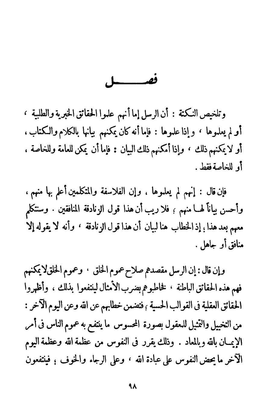 وَتَلْخِيصُ النُّكْتَةِ: أَنَّ الرُّسُلَ إمَّا أَنَّهُمْ عَلِمُوا الْحَقَائِقَ الْخَبَرِيَّةَ وَالطَّلَبِيَّةَ أَوْ لَمْ يَعْلَمُوهَا وَإِذَا عَلِمُوهَا: فَإِمَّا أَنَّهُ كَانَ يُمْكِنُهُمْ بَيَانُهَا بِالْكَلَامِ وَالْكِتَابِ أَوْ لَا يُمْكِنُهُمْ ذَلِكَ وَإِذَا أَمْكَنَهُمْ ذَلِكَ الْبَيَانُ: فَإِمَّا أَنْ يُمْكِنَ لِلْعَامَّةِ وَلِلْخَاصَّةِ أَوْ لِلْخَاصَّةِ فَقَطْ. فَإِنْ قَالَ: إنَّهُمْ لَمْ يَعْلَمُوهَا وَإِنَّ الْفَلَاسِفَةَ وَالْمُتَكَلِّمِين أَعْلَمُ بِهَا مِنْهُمْ وَأَحْسَنُ بَيَانًا لَهَا مِنْهُمْ؛ فَلَا رَيْبَ أَنَّ هَذَا قَوْلُ الزَّنَادِقَةِ الْمُنَافِقِينَ. وَسَنَتَكَلَّمُ مَعَهُمْ بَعْدَ هَذَا؛ إذًا الْخِطَابُ هُنَا لِبَيَانِ أَنَّ هَذَا قَوْلُ الزَّنَادِقَةِ وَأَنَّهُ لَا يَقُولُهُ إلَّا مُنَافِقٌ أَوْ جَاهِلٌ. وَإِنْ قَالَ: إنَّ الرُّسُلَ مَقْصِدُهُمْ صَلَاحُ عُمُومِ الْخَلْقِ وَعُمُومُ الْخَلْقِ لَا يُمْكِنُهُمْ فَهْمُ هَذِهِ الْحَقَائِقِ الْبَاطِنَةِ فَخَاطَبُوهُمْ بِضَرْبِ الْأَمْثَالِ لِيَنْتَفِعُوا بِذَلِكَ وَأَظْهَرُوا الْحَقَائِقَ الْعَقْلِيَّةَ فِي الْقَوَالِبِ الْحِسِّيَّةِ؛ فَتَضَمَّنَ خِطَابُهُمْ عَنْ اللَّهِ وَعَنْ الْيَوْمِ الْآخِرِ: مِنْ التَّخْيِيلِ وَالتَّمْثِيلِ لِلْمَعْقُولِ بِصُورَةِ الْمَحْسُوسِ مَا يَنْتَفِعُ بِهِ عُمُومُ النَّاسِ فِي أَمْرِ الْإِيمَانِ بِاَللَّهِ وَبِالْمَعَادِ. وَذَلِكَ يُقَرِّرُ فِي النُّفُوسِ مِنْ عَظَمَةِ اللَّهِ وَعَظَمَةِ الْيَوْمِ الْآخِرِ مَا يَحُضُّ النُّفُوسَ عَلَى عِبَادَةِ اللَّهِ وَعَلَى الرَّجَاءِ وَالْخَوْفِ؛ فَيَنْتَفِعُونَ