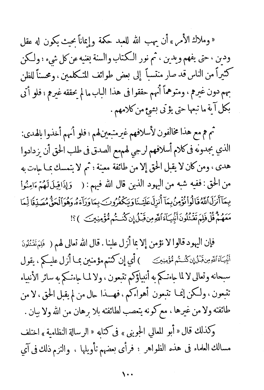 " وَمِلَاكُ الْأَمْرِ " أَنْ يَهَبَ اللَّهُ لِلْعَبْدِ حِكْمَةً وَإِيمَانًا بِحَيْثُ يَكُونُ لَهُ عَقْلٌ وَدِينٌ حَتَّى يَفْهَمَ وَيَدِينَ ثُمَّ نُورُ الْكِتَابِ وَالسُّنَّةِ يُغْنِيهِ عَنْ كُلِّ شَيْءٍ؛ وَلَكِنَّ كَثِيرًا مِنْ النَّاسِ قَدْ صَارَ مُنْتَسِبًا إلَى بَعْضِ طَوَائِفِ الْمُتَكَلِّمِينَ وَمُحْسِنًا لِلظَّنِّ بِهِمْ دُونَ غَيْرِهِمْ وَمُتَوَهِّمًا أَنَّهُمْ حَقَّقُوا فِي هَذَا الْبَابِ مَا لَمْ يُحَقِّقْهُ غَيْرُهُمْ؛ فَلَوْ أَتَى بِكُلِّ آيَةٍ مَا تَبِعَهَا حَتَّى يُؤْتَى بِشَيْءِ مِنْ كَلَامِهِمْ. ثُمَّ هُمْ مَعَ هَذَا مُخَالِفُونَ لِأَسْلَافِهِمْ غَيْرُ مُتَّبِعِينَ لَهُمْ؛ فَلَوْ أَنَّهُمْ أَخَذُوا بِالْهُدَى: الَّذِي يَجِدُونَهُ فِي كَلَامِ أَسْلَافِهِمْ لَرُجِيَ لَهُمْ مَعَ الصِّدْقِ فِي طَلَبِ الْحَقِّ أَنْ يَزْدَادُوا هُدًى وَمَنْ كَانَ لَا يَقْبَلُ الْحَقَّ إلَّا مِنْ طَائِفَةٍ مُعَيَّنَةٍ؛ ثُمَّ لَا يَتَمَسَّكُ بِمَا جَاءَتْ بِهِ مِنْ الْحَقِّ: فَفِيهِ شَبَهٌ مِنْ الْيَهُودِ الَّذِينَ قَالَ اللَّهُ فِيهِمْ: {وَإِذَا قِيلَ لَهُمْ آمِنُوا بِمَا أَنْزَلَ اللَّهُ قَالُوا نُؤْمِنُ بِمَا أُنْزِلَ عَلَيْنَا وَيَكْفُرُونَ بِمَا وَرَاءَهُ وَهُوَ الْحَقُّ مُصَدِّقًا لِمَا مَعَهُمْ قُلْ فَلِمَ تَقْتُلُونَ أَنْبِيَاءَ اللَّهِ مِنْ قَبْلُ إنْ كُنْتُمْ مُؤْمِنِينَ} فَإِنَّ الْيَهُودَ قَالُوا لَا نُؤْمِنُ إلَّا بِمَا أُنْزِلَ عَلَيْنَا. قَالَ اللَّهُ تَعَالَى لَهُمْ {فَلِمَ تَقْتُلُونَ أَنْبِيَاءَ اللَّهِ مِنْ قَبْلُ إنْ كُنْتُمْ مُؤْمِنِينَ} أَيْ إنْ كُنْتُمْ مُؤْمِنِينَ بِمَا أُنْزِلَ عَلَيْكُمْ يَقُولُ سُبْحَانَهُ وَتَعَالَى لَا لَمَّا جَاءَتْكُمْ بِهِ أَنْبِيَاؤُكُمْ تَتَّبِعُونَ وَلَا لَمَّا جَاءَتْكُمْ بِهِ سَائِرُ الْأَنْبِيَاءِ تَتَّبِعُونَ وَلَكِنْ إنَّمَا تَتَّبِعُونَ أَهْوَاءَكُمْ فَهَذَا حَالُ مَنْ لَمْ يَقْبَلْ الْحَقَّ لَا مِنْ طَائِفَتِهِ وَلَا مِنْ غَيْرِهَا مَعَ كَوْنِهِ يَتَعَصَّبُ لِطَائِفَتِهِ بِلَا بُرْهَانٍ مِنْ اللَّهِ وَلَا بَيَانٍ.