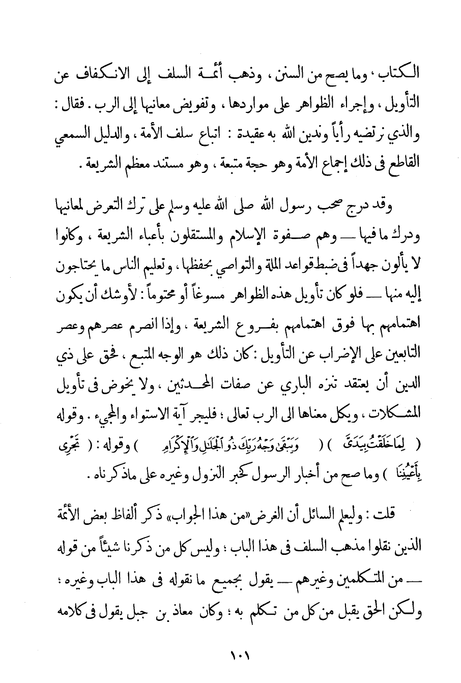 الْكِتَابِ وَمَا يَصِحُّ مِنْ السُّنَنِ وَذَهَبَ أَئِمَّةُ السَّلَفِ إلَى الِانْكِفَافِ عَنْ التَّأْوِيلِ وَإِجْرَاءِ الظَّوَاهِرِ عَلَى مَوَارِدِهَا وَتَفْوِيضِ مَعَانِيهَا إلَى الرَّبِّ. فَقَالَ: وَاَلَّذِي نَرْتَضِيهِ رَأْيًا وَنَدِينُ اللَّهَ بِهِ عَقِيدَةً: اتِّبَاعُ سَلَفِ الْأُمَّةِ وَالدَّلِيلُ السَّمْعِيُّ الْقَاطِعُ فِي ذَلِكَ إجْمَاعُ الْأُمَّةِ وَهُوَ حُجَّةٌ مُتَّبَعَةٌ وَهُوَ مُسْتَنَدُ مُعْظَمِ الشَّرِيعَةِ. وَقَدْ دَرَجَ صَحْبُ رَسُولِ اللَّهِ صَلَّى اللَّهُ عَلَيْهِ وَسَلَّمَ عَلَى تَرْكِ التَّعَرُّضِ لِمَعَانِيهَا وَدَرْكِ مَا فِيهَا - وَهُمْ صَفْوَةُ الْإِسْلَامِ والمستقلون بِأَعْبَاءِ الشَّرِيعَةِ وَكَانُوا لَا يَأْلُونَ جَهْدًا فِي ضَبْطِ قَوَاعِدِ الْمِلَّةِ وَالتَّوَاصِي بِحِفْظِهَا وَتَعْلِيمِ النَّاسِ مَا يَحْتَاجُونَ إلَيْهِ مِنْهَا - فَلَوْ كَانَ تَأْوِيلُ هَذِهِ الظَّوَاهِرِ مُسَوَّغًا أَوْ مَحْتُومًا: لَأَوْشَكَ أَنْ يَكُونَ اهْتِمَامُهُمْ بِهَا فَوْقَ اهْتِمَامِهِمْ بِفُرُوعِ الشَّرِيعَةِ وَإِذَا انْصَرَمَ عَصْرُهُمْ وَعَصْرُ التَّابِعِينَ عَلَى الْإِضْرَابِ عَنْ التَّأْوِيلِ: كَانَ ذَلِكَ هُوَ الْوَجْهُ الْمُتَّبَعُ فَحَقٌّ عَلَى ذِي الدِّينِ أَنْ يَعْتَقِدَ تَنَزُّهَ الْبَارِي عَنْ صِفَاتِ الْمُحَدِّثِينَ وَلَا يَخُوضُ فِي تَأْوِيلِ الْمُشْكِلَاتِ وَيَكِلُ مَعْنَاهَا إلَى الرَّبِّ تَعَالَى؛ فَلْيُجْرِ آيَةَ الِاسْتِوَاءِ وَالْمَجِيءِ. وَقَوْلُهُ {لِمَا خَلَقْتُ بِيَدَيَّ} {وَيَبْقَى وَجْهُ رَبِّكَ ذُو الْجَلَالِ وَالْإِكْرَامِ} وَقَوْله: {تَجْرِي بِأَعْيُنِنَا} وَمَا صَحَّ مِنْ أَخْبَارِ الرَّسُولِ كَخَبَرِ النُّزُولِ وَغَيْرِهِ عَلَى مَا ذَكَرْنَاهُ. قُلْت: وَلْيَعْلَمْ السَّائِلُ أَنَّ الْغَرَضَ " مِنْ هَذَا الْجَوَابِ " ذِكْرُ أَلْفَاظِ بَعْضِ الْأَئِمَّةِ الَّذِينَ نَقَلُوا مَذْهَبَ السَّلَفِ فِي هَذَا الْبَابِ؛ وَلَيْسَ كُلُّ مَنْ ذَكَرْنَا شَيْئًا مِنْ قَوْلِهِ - مِنْ الْمُتَكَلِّمِينَ وَغَيْرِهِمْ - يَقُولُ بِجَمِيعِ مَا نَقُولُهُ فِي هَذَا الْبَابِ وَغَيْرِهِ؛ وَلَكِنَّ الْحَقَّ يُقْبَلُ مِنْ كُلِّ مَنْ تَكَلَّمَ بِهِ؛ وَكَانَ مُعَاذُ بْنُ جَبَلٍ يَقُولُ فِي كَلَامِهِ.