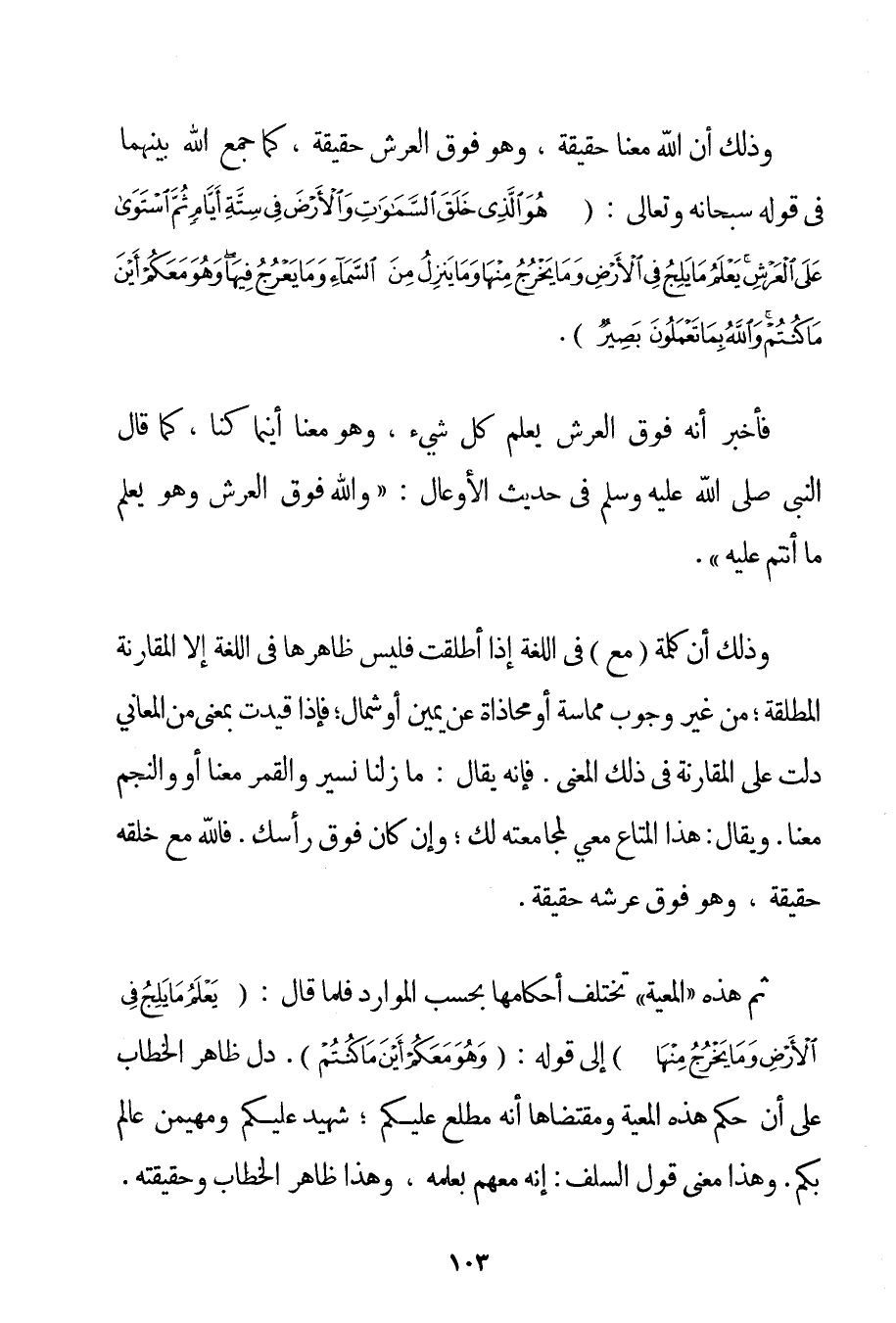 وَذَلِكَ أَنَّ اللَّهَ مَعَنَا حَقِيقَةً وَهُوَ فَوْقَ الْعَرْشِ حَقِيقَةً كَمَا جَمَعَ اللَّهُ بَيْنَهُمَا فِي قَوْلِهِ سُبْحَانَهُ وَتَعَالَى: {هُوَ الَّذِي خَلَقَ السَّمَاوَاتِ وَالْأَرْضَ فِي سِتَّةِ أَيَّامٍ ثُمَّ اسْتَوَى عَلَى الْعَرْشِ يَعْلَمُ مَا يَلِجُ فِي الْأَرْضِ وَمَا يَخْرُجُ مِنْهَا وَمَا يَنْزِلُ مِنَ السَّمَاءِ وَمَا يَعْرُجُ فِيهَا وَهُوَ مَعَكُمْ أَيْنَ مَا كُنْتُمْ وَاللَّهُ بِمَا تَعْمَلُونَ بَصِيرٌ} . فَأَخْبَرَ أَنَّهُ فَوْقَ الْعَرْشِ يَعْلَمُ كُلَّ شَيْءٍ وَهُوَ مَعَنَا أَيْنَمَا كُنَّا كَمَا قَالَ النَّبِيُّ صَلَّى اللَّهُ عَلَيْهِ وَسَلَّمَ فِي حَدِيثِ الْأَوْعَالِ: {وَاَللَّهُ فَوْقَ الْعَرْشِ وَهُوَ يَعْلَمُ مَا أَنْتُمْ عَلَيْهِ} . وَذَلِكَ أَنَّ كَلِمَةَ (مَعَ فِي اللُّغَةِ إذَا أُطْلِقَتْ فَلَيْسَ ظَاهِرُهَا فِي اللُّغَةِ إلَّا الْمُقَارَنَةَ الْمُطْلَقَةَ؛ مِنْ غَيْرِ وُجُوبِ مُمَاسَّةٍ أَوْ مُحَاذَاةٍ عَنْ يَمِينٍ أَوْ شِمَالٍ؛ فَإِذَا قُيِّدَتْ بِمَعْنَى مِنْ الْمَعَانِي دَلَّتْ عَلَى الْمُقَارَنَةِ فِي ذَلِكَ الْمَعْنَى. فَإِنَّهُ يُقَالُ: مَا زِلْنَا نَسِيرُ وَالْقَمَرَ مَعَنَا أَوْ وَالنَّجْمَ مَعَنَا. وَيُقَالُ: هَذَا الْمَتَاعُ مَعِي لِمُجَامَعَتِهِ لَك؛ وَإِنْ كَانَ فَوْقَ رَأْسِك. فَاَللَّهُ مَعَ خَلْقِهِ حَقِيقَةً وَهُوَ فَوْقَ عَرْشِهِ حَقِيقَةً. ثُمَّ هَذِهِ " الْمَعِيَّةُ " تَخْتَلِفُ أَحْكَامُهَا بِحَسَبِ الْمَوَارِدِ فَلَمَّا قَالَ: {يَعْلَمُ مَا يَلِجُ فِي الْأَرْضِ وَمَا يَخْرُجُ مِنْهَا} إلَى قَوْلِهِ: {وَهُوَ مَعَكُمْ أَيْنَ مَا كُنْتُمْ} . دَلَّ ظَاهِرُ الْخِطَابِ عَلَى أَنَّ حُكْمَ هَذِهِ الْمَعِيَّةِ وَمُقْتَضَاهَا أَنَّهُ مُطَّلِعٌ عَلَيْكُمْ؛ شَهِيدٌ عَلَيْكُمْ وَمُهَيْمِنٌ عَالِمٌ بِكُمْ. وَهَذَا مَعْنَى قَوْلِ السَّلَفِ: إنَّهُ مَعَهُمْ بِعِلْمِهِ وَهَذَا ظَاهِرُ الْخِطَابِ وَحَقِيقَتُهُ.