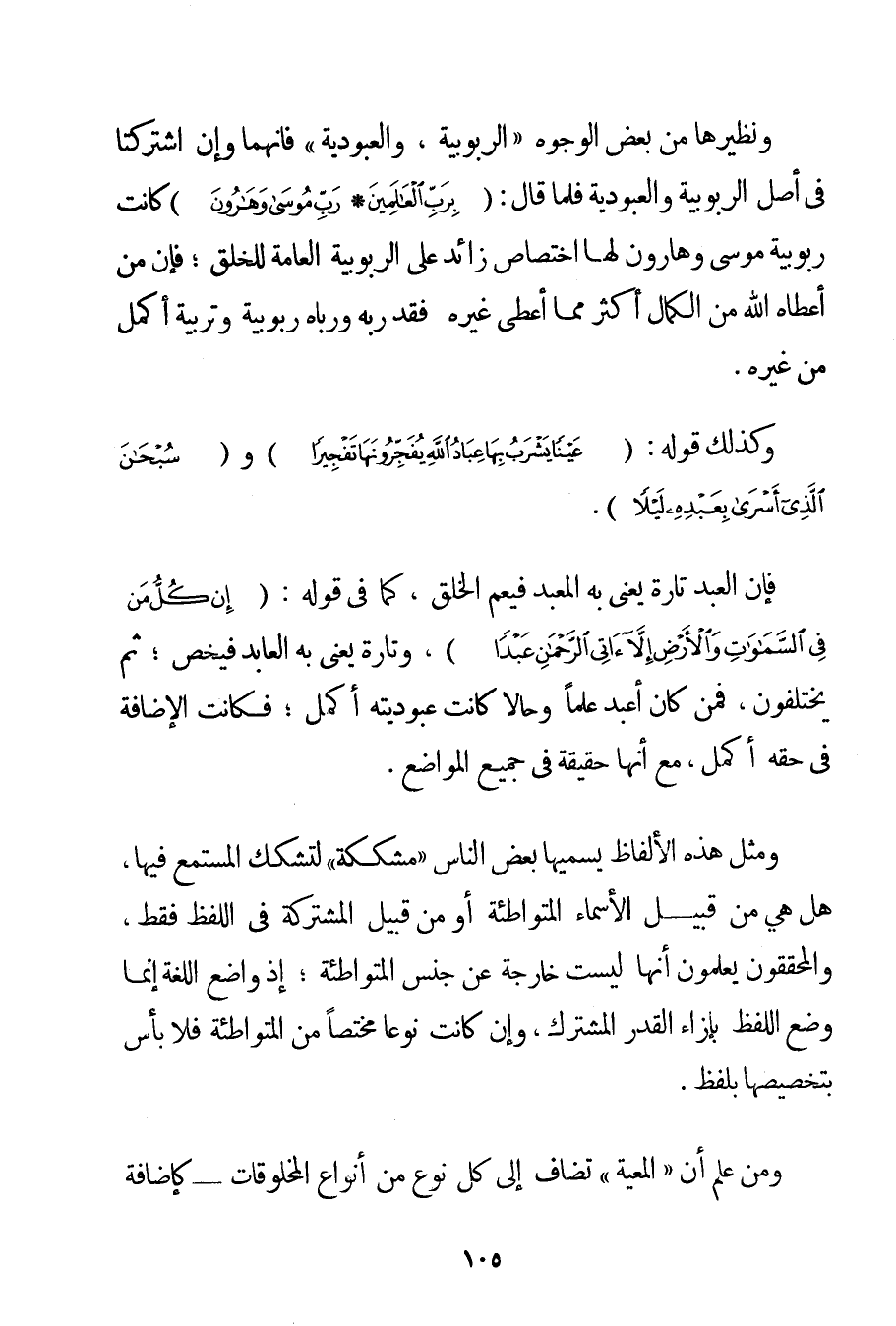وَنَظِيرُهَا مِنْ بَعْضِ الْوُجُوهِ " الرُّبُوبِيَّةُ وَالْعُبُودِيَّةُ " فَإِنَّهُمَا وَإِنْ اشْتَرَكَتَا فِي أَصْلِ الرُّبُوبِيَّةِ وَالْعُبُودِيَّةِ فَلَمَّا قَالَ: {بِرَبِّ الْعَالَمِينَ} {رَبِّ مُوسَى وَهَارُونَ} كَانَتْ رُبُوبِيَّةُ مُوسَى وَهَارُونَ لَهَا اخْتِصَاصٌ زَائِدٌ عَلَى الرُّبُوبِيَّةِ الْعَامَّةِ لِلْخَلْقِ؛ فَإِنَّ مَنْ أَعْطَاهُ اللَّهُ مِنْ الْكَمَالِ أَكْثَرَ مِمَّا أَعْطَى غَيْرَهُ فَقَدْ رَبَّهُ وَرَبَّاهُ رُبُوبِيَّةً وَتَرْبِيَةً أَكْمَلَ مِنْ غَيْرِهِ. وَكَذَلِكَ قَوْلُهُ: {عَيْنًا يَشْرَبُ بِهَا عِبَادُ اللَّهِ يُفَجِّرُونَهَا تَفْجِيرًا} وَ {سُبْحَانَ الَّذِي أَسْرَى بِعَبْدِهِ لَيْلًا} . فَإِنَّ الْعَبْدَ تَارَةً يَعْنِي بِهِ الْمَعْبَدَ فَيَعُمُّ الْخَلْقَ كَمَا فِي قَوْلِهِ: {إنْ كُلُّ مَنْ فِي السَّمَاوَاتِ وَالْأَرْضِ إلَّا آتِي الرَّحْمَنِ عَبْدًا} وَتَارَةً يَعْنِي بِهِ الْعَابِدَ فَيَخُصُّ؛ ثُمَّ يَخْتَلِفُونَ فَمَنْ كَانَ أَعْبَدَ عِلْمًا وَحَالًا كَانَتْ عُبُودِيَّتُهُ أَكْمَلَ؛ فَكَانَتْ الْإِضَافَةُ فِي حَقِّهِ أَكْمَلَ مَعَ أَنَّهَا حَقِيقَةٌ فِي جَمِيعِ الْمَوَاضِعِ. وَمِثْلُ هَذِهِ الْأَلْفَاظِ يُسَمِّيهَا بَعْضُ النَّاسِ " مُشَكِّكَةً " لِتَشَكُّكِ الْمُسْتَمِعِ فِيهَا هَلْ هِيَ مِنْ قَبِيلِ الْأَسْمَاءِ الْمُتَوَاطِئَةِ أَوْ مِنْ قَبِيلِ الْمُشْتَرَكَةِ فِي اللَّفْظِ فَقَطْ وَالْمُحَقِّقُونَ يَعْلَمُونَ أَنَّهَا لَيْسَتْ خَارِجَةً عَنْ جِنْسِ الْمُتَوَاطِئَةِ؛ إذْ وَاضِعُ اللُّغَةِ إنَّمَا وَضَعَ اللَّفْظَ بِإِزَاءِ الْقَدْرِ الْمُشْتَرَكِ وَإِنْ كَانَتْ نَوْعًا مُخْتَصًّا مِنْ الْمُتَوَاطِئَةِ فَلَا بَأْسَ بِتَخْصِيصِهَا بِلَفْظِ. وَمَنْ عَلِمَ أَنَّ " الْمَعِيَّةَ " تُضَافُ إلَى كُلِّ نَوْعٍ مِنْ أَنْوَاعِ الْمَخْلُوقَاتِ - كَإِضَافَةِ