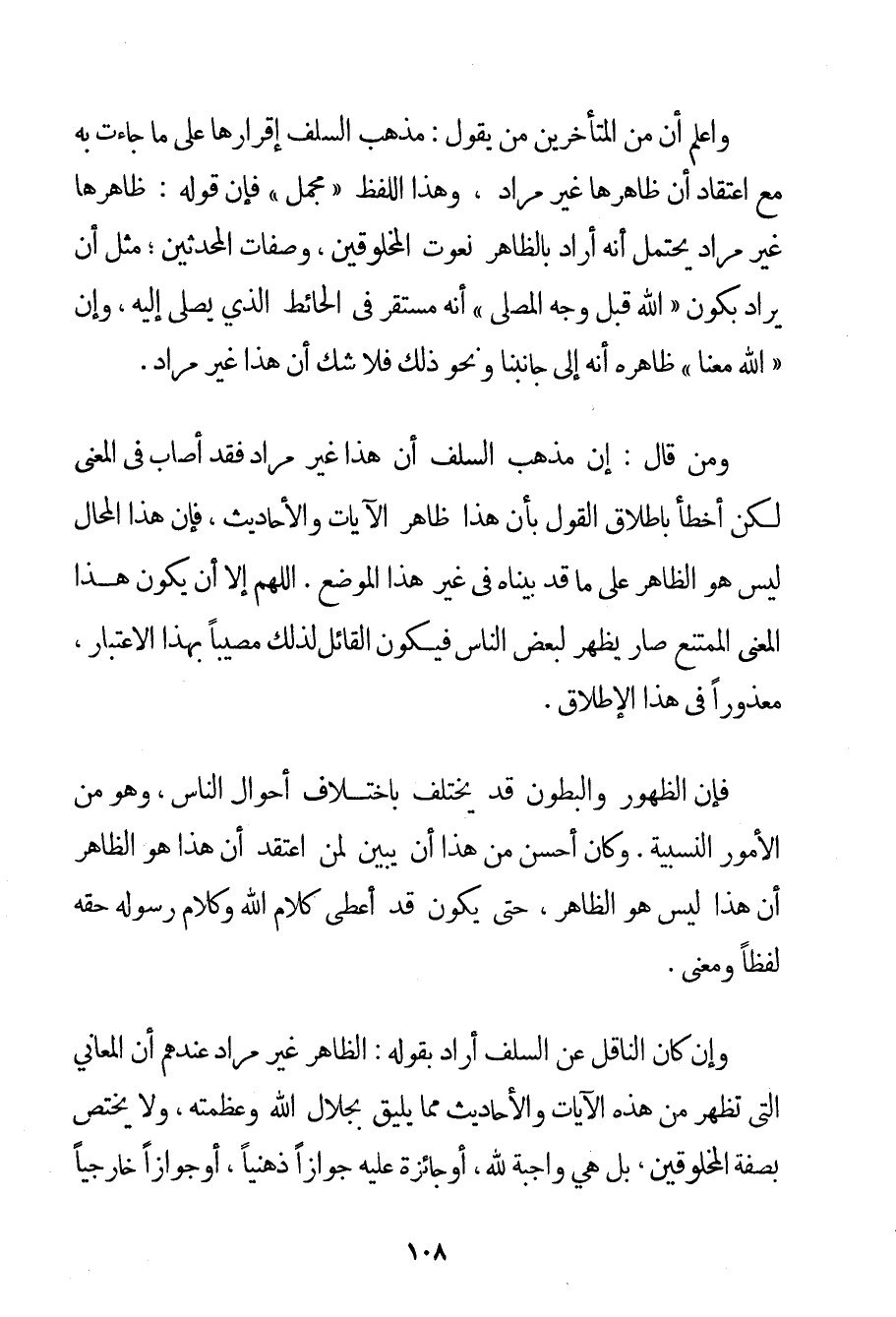 وَاعْلَمْ أَنَّ مِنْ الْمُتَأَخِّرِينَ مَنْ يَقُولُ: مَذْهَبُ السَّلَفِ إقْرَارُهَا عَلَى مَا جَاءَتْ بِهِ مَعَ اعْتِقَادٍ أَنَّ ظَاهِرَهَا غَيْرُ مُرَادٍ وَهَذَا اللَّفْظُ " مُجْمَلٌ " فَإِنَّ قَوْلَهُ: ظَاهِرَهَا غَيْرُ مُرَادٍ يَحْتَمِلُ أَنَّهُ أَرَادَ بِالظَّاهِرِ نُعُوتَ الْمَخْلُوقِينَ وَصِفَاتِ المحدثين؛ مِثْلُ أَنْ يُرَادَ بِكَوْنِ " اللَّهِ قَبِلَ وَجْهِ الْمُصَلِّي " أَنَّهُ مُسْتَقِرٌّ فِي الْحَائِطِ الَّذِي يُصَلِّي إلَيْهِ وَإِنَّ " اللَّهَ مَعَنَا " ظَاهِرُهُ أَنَّهُ إلَى جَانِبِنَا وَنَحْوُ ذَلِكَ فَلَا شَكَّ أَنَّ هَذَا غَيْرُ مُرَادٍ. وَمَنْ قَالَ: إنَّ مَذْهَبَ السَّلَفِ أَنَّ هَذَا غَيْرُ مُرَادٍ فَقَدْ أَصَابَ فِي الْمَعْنَى لَكِنْ أَخْطَأَ بِإِطْلَاقِ الْقَوْلِ بِأَنَّ هَذَا ظَاهِرُ الْآيَاتِ وَالْأَحَادِيثِ فَإِنَّ هَذَا الْمُحَالَ لَيْسَ هُوَ الظَّاهِرُ عَلَى مَا قَدْ بَيَّنَّاهُ فِي غَيْرِ هَذَا الْمَوْضِعِ. اللَّهُمَّ إلَّا أَنْ يَكُونَ هَذَا الْمَعْنَى الْمُمْتَنِعُ صَارَ يَظْهَرُ لِبَعْضِ النَّاسِ فَيَكُونُ الْقَائِلُ لِذَلِكَ مُصِيبًا بِهَذَا الِاعْتِبَارِ مَعْذُورًا فِي هَذَا الْإِطْلَاقِ. فَإِنَّ الظُّهُورَ وَالْبُطُونَ قَدْ يَخْتَلِفُ بِاخْتِلَافِ أَحْوَالِ النَّاسِ وَهُوَ مِنْ الْأُمُورِ النِّسْبِيَّةِ. وَكَانَ أَحْسَنُ مِنْ هَذَا أَنْ يُبَيِّنَ لِمَنْ اعْتَقَدَ أَنَّ هَذَا هُوَ الظَّاهِرُ أَنَّ هَذَا لَيْسَ هُوَ الظَّاهِرَ حَتَّى يَكُونَ قَدْ أَعْطَى كَلَامَ اللَّهِ وَكَلَامَ رَسُولِهِ حَقَّهُ لَفْظًا وَمَعْنًى. وَإِنْ كَانَ النَّاقِلُ عَنْ السَّلَفِ أَرَادَ بِقَوْلِهِ: الظَّاهِرُ غَيْرُ مُرَادٍ عِنْدَهُمْ أَنَّ الْمَعَانِيَ الَّتِي تَظْهَرُ مِنْ هَذِهِ الْآيَاتِ وَالْأَحَادِيثِ مِمَّا يَلِيقُ بِجَلَالِ اللَّهِ وَعَظَمَتِهِ وَلَا يَخْتَصُّ بِصِفَةِ الْمَخْلُوقِينَ بَلْ هِيَ وَاجِبَةٌ لِلَّهِ أَوْ جَائِزَةٌ عَلَيْهِ جَوَازًا ذِهْنِيًّا أَوْ جَوَازًا خَارِجِيًّا